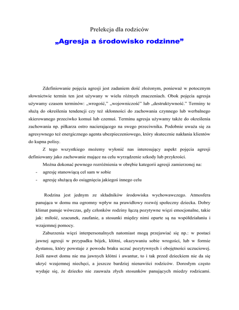 Prelekcja dla rodziców „Agresja a środowisko rodzinne” Zdefiniowanie pojęcia agresji jest zadaniem dość złożonym, ponieważ w potocznym słownictwie termin ten jest używany w wielu różnych znaczeniach. Obok pojęcia agresja używamy czasem terminów: „wrogość,” „wojowniczość” lub „destruktywność.” Terminy te służą do określenia tendencji czy też skłonności do zachowania czynnego lub werbalnego skierowanego przeciwko komuś lub czemuś. Terminu agresja używamy także do określenia zachowania np. piłkarza ostro nacierającego na swego przeciwnika. Podobnie uważa się za agresywnego też energicznego agenta ubezpieczeniowego, który skutecznie nakłania klientów do kupna polisy. Z tego wszystkiego możemy wyłonić nas interesujący aspekt pojęcia agresji definiowany jako zachowanie mające na celu wyrządzenie szkody lub przykrości. Można dokonać pewnego rozróżnienia w obrębie kategorii agresji zamierzonej na: - agresję stanowiącą cel sam w sobie - agresję służącą do osiągnięcia jakiegoś innego celu Rodzina jest jednym ze składników środowiska wychowawczego. Atmosfera panująca w domu ma ogromny wpływ na prawidłowy rozwój społeczny dziecka. Dobry klimat panuje wówczas, gdy członków rodziny łączą pozytywne więzi emocjonalne, takie jak: miłość, szacunek, zaufanie, a stosunki między nimi oparte są na współdziałaniu i wzajemnej pomocy. Zaburzenia więzi interpersonalnych natomiast mogą przejawiać się np.: w postaci jawnej agresji w przypadku bójek, kłótni, okazywaniu sobie wrogości, lub w formie dystansu, który powstaje z powodu braku uczuć pozytywnych i obojętności uczuciowej. Jeśli nawet domu nie ma jawnych kłótni i awantur, to i tak przed dzieckiem nie da się ukryć wzajemnej niechęci, a jeszcze bardziej nienawiści rodziców. Dorosłym często wydaje się, że dziecko nie zauważa złych stosunków panujących miedzy rodzicami. Trudno im, uwierzyć, lub są nieświadomi tego, ze sami są często źródłem zaburzeń zachowania swego dziecka. Uważa się, ze samo oglądanie ma wpływ na powstanie agresji. W takiej sytuacji zostaje uruchomiony mechanizm identyfikacji, który powoduje dążenie od upodobnienia się do zachowania modela. Modele stosunków konfliktowych rodziny z sąsiadami, znajomymi i krewnymi także oddziałują niekorzystnie na rozwój społeczny dziecka. Bardzo niebezpieczne dla rozwijającej osobowości dziecka są konflikty między rodzicami i dziadkami. Jeśli w domu jest kilka osób dorosłych, które kochają dziecko i są autorytetem, a wyrażają różne zdania w podstawowych, dotyczących go sprawach to dziecko nie ma jednolitego wzoru. Utrudnia mu to kształtowanie charakteru i wpływa na zwiększenie pobudliwości i agresywności. Do czynników zakłócających proces socjalizacji w rodzinie zalicza się także zmiany w strukturze rodziny. Rozłąka z jednym z rodziców może doprowadzić między innymi do utraty poczucia bezpieczeństwa. Rozbicie rodziny może wywołać depresje i różnego rodzaju objawy nerwicy, jak również stwarza sprzyjające warunki dla aspołecznego zachowania się. Dzieje się tak z powodu napiętej atmosfery i dysharmonii panującej w rodzinie. Taki dom przestaje przybierać różne formy nie akceptowanego społecznie zachowania np. agresję, samobójstwo, czy kolizje z prawem. Innym czynnikiem związanym z życiem rodziny wpływającym na wystąpienie agresywnego zachowania się dzieci jest zła sytuacja materialna i mieszkaniowa. Bieda i niedostatek, ciągły brak pieniędzy zwiększa okazję do kłótni między rodzicami. Oskarżają się oni wzajemnie o nieumiejętności radzenia sobie w życiu, lub zmęczeni pogonią za pieniędzmi, a nie mają czasu i sił na wychowanie swoich dzieci. Jeśli na dodatek do biedy dołączy ciasnota, to dziecko w takiej sytuacji ma bardzo trudne warunki do prawidłowego rozwoju, nie ma bowiem własnego miejsca do nauki, jest przeganiane i odrywane od zajęć. Nie szczędzi się przy tym dziecku pokrzykiwań, zakazów i kar cielesnych. Do postaw właściwych wychowawczo można zaliczyć: - akceptację, - współdziałanie, - uznawanie swobody, - aktywność, - poszanowanie praw dziecka Do postaw niewłaściwych zalicza się: - odrzucenie, - unikanie kontaktu z dzieckiem, - nadmierne ochranianie, - stawianie nadmiernych wymagań. Uważa się, że postawy rodzicielskie wpływają na pozycję dziecka w rodzinie. Dziecko odtrącone, czuje się niepotrzebne, czasem walczy o swoją pozycję, lub zwraca na siebie uwagę złym zachowaniem, choć nie akceptowanym przez rodziców, ale powodującym, że staje się ośrodkiem ich zainteresowania. Wielu autorów jest zgodnych co do tego, że odtrącenie dziecka rodzi agresję, nieposłuszeństwo lub lękliwość, co warunkuje trudności zaspokajania potrzeby akceptacji w środowisku poza rodzinnym. Unikanie kontaktu z dzieckiem powoduje, ze staje się ono uczuciowo niestałe, nieufne, bojaźliwe lub agresywne. Dziecko niezdolne jest od wytrwałości i koncentracji. Często popada w konflikty ze szkołą, w której czuje się niepotrzebne, podobnie jak w domu. Rodzina może wywierać wpływ uspołeczniający, a czasem terapeutyczny, albo przeciwnie destrukcyjny. Ważnym czynnikiem w zapobieganiu dewiacjom w życiu rodziny jest wczesna diagnoza, wykrycie dysharmonii, czy wadliwych postaw i uzdrowienie atmosfery rodzinnej. Rodzina oddziałuje na jednostkę najdłużej, niekiedy przez całe żucie. Wraz z wiekiem dziecka, niektóre jej funkcje przejmują stopniowo inne środowiska wychowawcze oraz instytucje opiekuńcze i kształcące. Jednak za opiekę dziecka, wychowanie i prawidłowy rozwój odpowiedzialni są przede wszystkim rodzice. Dlatego zatrzymajmy się na chwilę, pomyślmy o swojej sytuacji w rodzinie, problemach i spójrzmy na swoje dorastające dziecko, jego zachowanie, kłopoty. Czas spędzony na rozmowie z własnym dzieckiem nie jest czasem zmarnowanym,