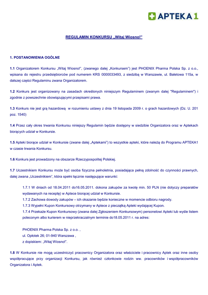 REGULAMIN KONKURSU „Witaj Wiosno!” 1. POSTANOWIENIA OGÓLNE 1.1 Organizatorem Konkursu „Witaj Wiosno!”, (zwanego dalej „Konkursem”) jest PHOENIX Pharma Polska Sp. z o.o., wpisana do rejestru przedsiębiorców pod numerem KRS 0000033493, z siedzibą w Warszawie, ul. Baletowa 115a, w dalszej części Regulaminu zwana Organizatorem. 1.2 Konkurs jest organizowany na zasadach określonych niniejszym Regulaminem (zwanym dalej "Regulaminem") i zgodnie z powszechnie obowiązującymi przepisami prawa. 1.3 Konkurs nie jest grą hazardową w rozumieniu ustawy z dnia 19 listopada 2009 r. o grach hazardowych (Dz. U. 201 poz. 1540) 1.4 Przez cały okres trwania Konkursu niniejszy Regulamin będzie dostępny w siedzibie Organizatora oraz w Aptekach biorących udział w Konkursie. 1.5 Apteki biorące udział w Konkursie (zwane dalej „Aptekami”) to wszystkie apteki, które należą do Programu APTEKA1 w czasie trwania Konkursu. 1.6 Konkurs jest prowadzony na obszarze Rzeczypospolitej Polskiej. 1.7 Uczestnikiem Konkursu może być osoba fizyczna pełnoletnia, posiadająca pełną zdolność do czynności prawnych, dalej zwana „Uczestnikiem”, która spełni łącznie następujące warunki: 1.7.1 W dniach od 18.04.2011 do16.05.2011. dokona zakupów za kwotę min. 50 PLN (nie dotyczy preparatów wydawanych na receptę) w Aptece biorącej udział w Konkursie. 1.7.2 Zachowa dowody zakupów – ich okazanie będzie konieczne w momencie odbioru nagrody. 1.7.3 Wypełni Kupon Konkursowy otrzymany w Aptece z pieczątką Apteki wydającej Kupon. 1.7.4 Przekaże Kupon Konkursowy (zwana dalej Zgłoszeniem Konkursowym) personelowi Apteki lub wyśle listem poleconym albo kurierem w nieprzekraczalnym terminie do18.05.2011 r. na adres: PHOENIX Pharma Polska Sp. z o.o. , ul. Opłotek 26; 01-940 Warszawa , z dopiskiem: „Witaj Wiosno!”. 1.8 W Konkursie nie mogą uczestniczyć pracownicy Organizatora oraz właściciele i pracownicy Aptek oraz inne osoby współpracujące przy organizacji Konkursu, jak również członkowie rodzin ww. pracowników i współpracowników Organizatora i Aptek. 2. CZAS TRWANIA KONKURSU 2.1 Kupony Konkursowe dostępne są w Aptekach i wydawane przez personel przy zakupie dokonanym w terminie od 18.04.2011r. – 16.05.2011r (nie dotyczy preparatów wydawanych na receptę). 2.2 Zgłoszenia Konkursowe przyjmowane są do dnia 18.05.2011r. Liczy się data wpływu Zgłoszenia Konkursowego do Apteki lub data stempla pocztowego czy kuriera. Zgłoszenia Konkursowe, które zostaną wysłane po dniu 18.05.2011r nie będą brane pod uwagę przy rozstrzyganiu Konkursu. 3. ZASADY KONKURSU 3.1 Aby wziąć udział w Konkursie, należy: 3.1.1 W dniach od 18.04.2011 – 16.05.2011 r. dokonać zakupów za kwotę min. 50 PLN (nie dotyczy preparatów wydawanych na receptę). 3.1.2 Zachować dowody zakupów (paragon fiskalny, faktura VAT) – będą one niezbędne do odebrania nagrody. 3.1.3 Odebrać od personelu Apteki Kupon Konkursowy zawierający pieczątkę Apteki. 3.1.4 Wypełnić Kupon Konkursowy wpisując krótki wierszyk, którego tematem będzie recepta na wiosenne przebudzenie. 3.1.5 W wyznaczonym miejscu na Kuponie Konkursowym wpisać imię oraz numer karty PAYBACK. 3.1.6 Kupon Konkursowy będący Zgłoszeniem Konkursowym należy oddać personelowi Apteki lub przesłać do dnia 18.05.2011r na adres: PHOENIX Pharma Polska Sp. z o.o. ul. Opłotek 26; 01-940 Warszawa z dopiskiem: konkurs „Witaj Wiosno!” 3.2. Organizator nie ponosi odpowiedzialności za usługi świadczone przez Pocztę Polską oraz firmy świadczące usługi kurierskie, w tym za opóźnienia w dostarczaniu Zgłoszeń Konkursowych. 3.3. Uczestnik biorąc udział w Konkursie potwierdza, iż jest autorem przesłanego wierszyka, który jest przejawem jego oryginalnej twórczości o indywidualnym charakterze i wierszyk ten nie jest obciążony żadnymi prawami osób trzecich. 3.4. Uczestnik biorąc udział w Konkursie udziela Organizatorowi niewyłącznej licencji na wykorzystanie nadesłanego wierszyka w celach promocyjnych i reklamowych Organizatora w dowolny sposób, zwielokrotnianie dowolną techniką, wprowadzania do obrotu, publikowanie w materiałach promocyjnych Organizatora, zamieszczania na stronach internetowych Organizatora (www.apteka1.com.pl). 3.5. W przypadku, gdyby oświadczenie Uczestnika Konkursu, o którym mowa w pkt 3.3 okazało się niezgodne ze stanem faktycznym i/lub prawnym, Uczestnik Konkursu automatycznie traci prawo do nagrody, i będzie on w pełni i wyłącznie odpowiedzialny za ewentualne roszczenia osób trzecich związane z prawami do przesłanej wypowiedzi. 4. SPOSÓB ROZSTRZYGNIĘCIA KONKURSU 4.1 Laureaci Konkursu „Witaj Wiosno!” zostaną wyłonieni spośród wszystkich Uczestników, którzy do dnia 18.05.2011r. prześlą prawidłowo wypełnione Zgłoszenia Konkursowe. 4.2 Laureaci Konkursu „Witaj Wiosno!” zostaną wyłonieni przez Komisję, składającą się z 4 osób, powołaną przez Organizatora. W skład komisji wejdą przedstawiciele Organizatora. Z posiedzenia Komisji sporządzony zostanie stosowny protokół. 4.3 Komisja spośród nadesłanych Zgłoszeń Konkursowych nie później niż do dnia 30.06.2011r. wyłoni Laureatów Konkursu, którzy zdaniem członków Komisji nadesłali najciekawsze i najbardziej oryginalne wypowiedzi. Przy ocenie nadesłanych Zgłoszeń Konkursowych Komisja będzie kierować się przede wszystkim oryginalnością w ujęciu tematu, dowcipnością wiersza, kompozycją wiersza, bogactwem środków poetyckich. 4.4 Kolejność nadesłanych Zgłoszeń Konkursowych nie ma znaczenia. 5. NAGRODY W KONKURSIE 5.1 Nagrodami są: 1 bon Spa & Travel o wartości 1000 PLN, 3 bony SODEXHO Travel & Beauty o wartości 500 PLN każdy, 3 odtwarzacze MP4, 3 aparaty fotograficzne, 3 sokowirówki, 3 parowary, 4 zestawy kosmetyków, 10 preparatów witaminowych. 5.2 Organizator zobowiązuje się do pokrycia kosztów związanych z podatkiem od wygranej. 6. TERMIN I SPOSÓ