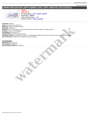 Informacje o produkcie Utworzono 08-03-2017 LAMPA REFLEKTOR LEWY HONDA CIVIC 1997-2000 OE 33151ST3G11 Cena : 159,15 zł Nr katalogowy : 217-1132L-LD-EM Producent : DEPO Stan magazynowy : < 0 Średnia ocena : brak recenzji w at ZASTOSOWANIE Samochód: Honda Civic VI Rok produkcji: 1997-2000 Nr porównawczy OEM: 33151ST3G11 er m ar k Przedmiot: reflektor Strona: lewa (po stronie kierowcy) Nadwozie: Liftback, Aerodeck (kombi) Regulacja: elektryczna Silniczek: nie ma w komplecie, ale można go przełożyć ze starego reflektora i będzie pasował Żarówka: H4 (nie ma w komplecie) Homologacja: europejska ECE Przeznaczenie: dla ruchu prawostronnego Producent / jakość: wysokiej klasy zamiennik, nie odbiegający jakością wykonania, parametrami oraz wyglądem od oryginału Stan techniczny: przedmiot jest nieużywany, fabrycznie nowy Wygenerowano w programie www.oscGold.com
