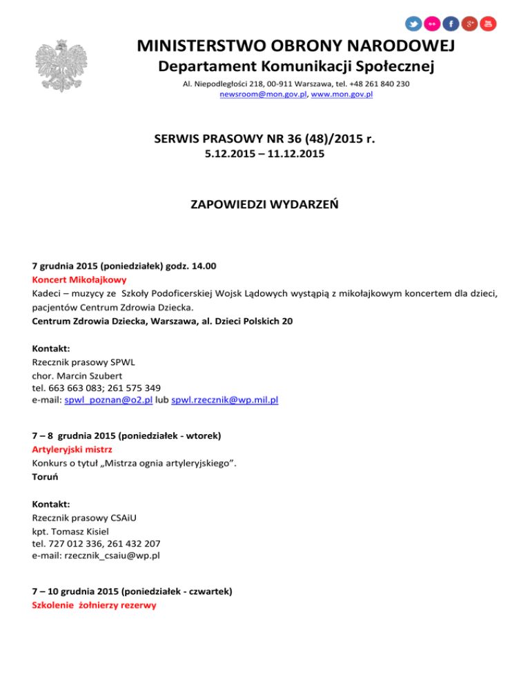 MINISTERSTWO OBRONY NARODOWEJ Departament Komunikacji Społecznej Al. Niepodległości 218, 00-911 Warszawa, tel. +48 261 840 230 [email protected], www.mon.gov.pl SERWIS PRASOWY NR 36 (48)/2015 r. 5.12.2015 – 11.12.2015 ZAPOWIEDZI WYDARZEŃ 7 grudnia 2015 (poniedziałek) godz. 14.00 Koncert Mikołajkowy Kadeci – muzycy ze Szkoły Podoficerskiej Wojsk Lądowych wystąpią z mikołajkowym koncertem dla dzieci, pacjentów Centrum Zdrowia Dziecka. Centrum Zdrowia Dziecka, Warszawa, al. Dzieci Polskich 20 Kontakt: Rzecznik prasowy SPWL chor. Marcin Szubert tel. 663 663 083; 261 575 349 e-mail: [email protected] lub [email protected] 7 – 8 grudnia 2015 (poniedziałek - wtorek) Artyleryjski mistrz Konkurs o tytuł „Mistrza ognia artyleryjskiego”. Toruń Kontakt: Rzecznik prasowy CSAiU kpt. Tomasz Kisiel tel. 727 012 336, 261 432 207 e-mail: [email protected] 7 – 10 grudnia 2015 (poniedziałek - czwartek) Szkolenie żołnierzy rezerwy W Centrum Szkolenia Łączności i Informatyki odbędzie się szkolenie rezerwistów. Ma ono na celu podwyższenie poziomu ich wiedzy i umiejętności, zgodnie z potrzebami jednostki wojskowej, w której żołnierz posiada nadany przydział mobilizacyjny. Zegrze Kontakt: Rzecznik prasowy CSŁiI kpt. Krzysztof Baran tel. 722 380 054 e-mail: [email protected] 7 – 11 grudnia 2015 (poniedziałek - piątek) Szkolenie certyfikujące Szkolenie poligonowe batalionu zmechanizowanego 10 Brygady Kawalerii Pancernej. Certyfikacja obsług drużyn w ramach szkolenia poligonowego. Świętoszów Kontakt: Rzecznik prasowy 10BKPanc. kpt. Adriana Wołyńska tel. 261 685 033 e-mail: [email protected] 7 – 11 grudnia 2015 (poniedziałek - piątek) Kurs podoficerski Egzaminy wstępne dla szeregowych zawodowych na kurs podoficerski. Szkoła Podoficerska Sił Powietrznych Dęblin Kontakt: Komendant SPSP Dęblin e-mail: [email protected] 8 grudnia 2015 (wtorek) Uroczystości na Cytadeli Warszawskiej Odsłonięcie tablicy upamiętniającej stacjonowanie Dowództwa Wojsk Lądowych na terenie Cytadeli. Warszawa Kontakt: Rzecznik prasowy DG RSZ ppłk Szczepan Głuszczak tel. 722 387 212 e-mail: [email protected] 9 grudnia 2015 (środa), godz. 14.30-16.30 Premiera gry SOSAB Prezentacja planszowej gry edukacyjnej SOSAB, przybliżającej historię 1 Samodzielnej Brygady Spadochronowej oraz sylwetkę gen. Stanisława Sosabowskiego. Warszawa, Muzeum Wojska Polskiego (sala Polskich Sił Zbrojnych), Al. Jerozolimskie 3 Kontakt: Rada i Zarząd Fundacji im. Jadwigi Chylińskiej tel. 500 105 940 e-mail: [email protected] 10 grudnia 2015 (czwartek) Świąteczna akcja z udziałem 17 WBZ „Szlachetna Paczka” z udziałem żołnierzy 17 Brygady Zmechanizowanej. Międzyrzecz - Sulęcin Kontakt: Oficer prasowy 17 WBZ ppor. Dorota Kusiak tel. 695 885 032 [email protected] 11 grudnia 2015 (piątek) Święto Wojsk Rakietowych i Artylerii Centralne obchody święta Wojsk Rakietowych i Artylerii. W ramach uroczystości odbędzie się apel i odsłonięcie pomnika artylerzysty. Toruń Kontakt: Rzecznik prasowy CSAiU kpt. Tomasz Kisiel tel. 727 012 336, 261 432 207 e-mail: [email protected] KRONIKA 27 listopada 2015 (piątek) Wiceminister na obchodach święta WAT Niezwykle znamienne jest to, że założona w 1828 roku Szkoła Podchorążych Piechoty stała się kolebką jednego z naszych najważniejszych zrywów niepodległościowych. Od tamtej chwili na zawsze losy podchorążych złączyły się nierozerwalnie z losami naszej Ojczyzny - mówił wiceminister Bartłomiej Grabski na uroczystej zbiórce z okazji święta Wojskowej Akademii Technicznej i Dnia Podchorążego. Więcej… 29 listopada 2015 (niedziela) 185. rocznica wybuchu powstania listopadowego W niedzielę 29 listopada br. w Warszawie, przy mogile powstańczej bitwy pod Olszynką Grochowską, odbyły się uroczystości upamiętniające 185. rocznicę wybuchu powstania listopadowego. W uroczystościach uczestniczył minister obrony narodowej Antoni Macierewicz. Więcej… 29 listopada 2015 (niedziela) Szef MON na uroczystości Dnia Podchorążego – To spotkanie to wielka tradycja spotkań prezydenta RP, żeby pokazać jedność i łączność najwyższego przedstawiciela Rzeczypospolitej Polskiej z młodymi szeregami polskiej armii, z przyszłymi oficerami – powiedział Prezydent RP Andrzej Duda podczas apelu z okazji Dnia Podchorążego. W ceremonii, która odbyła się na dziedzińcu Belwederu uczestniczył minister obrony narodowej Antoni Macierewicz. Więcej… 3 grudnia 2015 (czwartek) Ćwiczenie RYŚ-15 wkracza w decydującą fazę Na obiektach szkoleniowych drawskiego poligonu rozgrywane jest jedno z najważniejszych tegorocznych zagadnień szkoleniowych 12 Szczecińskiej Dywizji Zmechanizowanej. Pierwszoplanowymi ćwiczącymi jednostkami są: 7 Brygada Obrony Wybrzeża ze Słupska, 5 Pułk Artylerii z Sulechowa i 5 Pułk Inżynieryjny Szczecin – Podjuchy. Więcej…