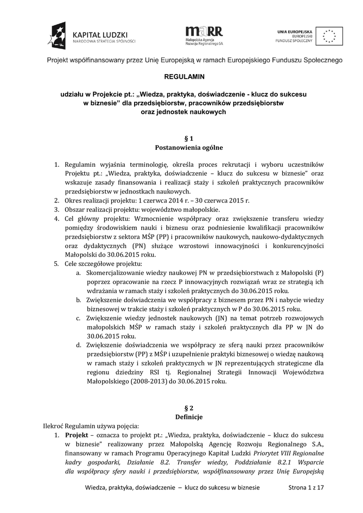 REGULAMIN udziału w Projekcie pt.: „Wiedza, praktyka, doświadczenie - klucz do sukcesu w biznesie” dla przedsiębiorstw, pracowników przedsiębiorstw oraz jednostek naukowych §1 Postanowienia ogólne 1. Regulamin wyjaśnia terminologię, określa proces rekrutacji i wyboru uczestników Projektu pt.: „Wiedza, praktyka, doświadczenie – klucz do sukcesu w biznesie” oraz wskazuje zasady finansowania i realizacji staży i szkoleń praktycznych pracowników przedsiębiorstw w jednostkach naukowych. 2. Okres realizacji projektu: 1 czerwca 2014 r. – 30 czerwca 2015 r. 3. Obszar realizacji projektu: województwo małopolskie. 4. Cel główny projektu: Wzmocnienie współpracy oraz zwiększenie transferu wiedzy pomiędzy środowiskiem nauki i biznesu oraz podniesienie kwalifikacji pracowników przedsiębiorstw z sektora MŚP (PP) i pracowników naukowych, naukowo-dydaktycznych oraz dydaktycznych (PN) służące wzrostowi innowacyjności i konkurencyjności Małopolski do 30.06.2015 roku. 5. Cele szczegółowe projektu: a. Skomercjalizowanie wiedzy naukowej PN w przedsiębiorstwach z Małopolski (P) poprzez opracowanie na rzecz P innowacyjnych rozwiązań wraz ze strategią ich wdrażania w ramach staży i szkoleń praktycznych do 30.06.2015 roku. b. Zwiększenie doświadczenia we współpracy z biznesem przez PN i nabycie wiedzy biznesowej w trakcie staży i szkoleń praktycznych w P do 30.06.2015 roku. c. Zwiększenie wiedzy jednostek naukowych (JN) na temat potrzeb rozwojowych małopolskich MŚP w ramach staży i szkoleń praktycznych dla PP w JN do 30.06.2015 roku. d. Zwiększenie doświadczenia we współpracy ze sferą nauki przez pracowników przedsiębiorstw (PP) z MŚP i uzupełnienie praktyki biznesowej o wiedzę naukową w ramach staży i szkoleń praktycznych w JN reprezentujących strategiczne dla regionu dziedziny RSI tj. Regionalnej Strategii Innowacji Województwa Małopolskiego (2008-2013) do 30.06.2015 roku. §2 Definicje Ilekroć Regulamin używa pojęcia: 1. Projekt – oznacza to projekt pt.: „Wiedza, praktyka, doświadczenie – klucz do sukcesu w biznesie” realizowany przez Małopolską Agencję Rozwoju Regionalnego S.A., finansowany w ramach Programu Operacyjnego Kapitał Ludzki Priorytet VIII Regionalne kadry gospodarki, Działanie 8.2. Transfer wiedzy, Poddziałanie 8.2.1 Wsparcie dla współpracy sfery nauki i przedsiębiorstw, współfinansowany przez Unię Europejską Wiedza, praktyka, doświadczenie – klucz do sukcesu w biznesie Strona 1 z 17 2. 3. 4. 5. w ramach Europejskiego Funduszu Społecznego na podstawie umowy o dofinansowanie projektu w ramach Programu Operacyjnego Kapitał Ludzki zawartej w dniu 3 lipca 2014 roku pomiędzy Małopolską Agencję Rozwoju Regionalnego S.A. a Województwem Małopolskim - Wojewódzkim Urzędem Pracy w Krakowie. WIP Doświadczenie – oznacza to projekt pt.: „Wiedza, praktyka, doświadczenie – klucz do sukcesu w biznesie”. Realizator projektu – oznacza to Małopolską Agencję Rozwoju Regionalnego S.A. (MARR S.A.) z siedzibą w Krakowie przy ul. Kordylewskiego 11, 31-542 Kraków, odpowiedzialną za rekrutację pracowników mikro, małych, średnich przedsiębiorstw oraz jednostek naukowych, organizację i rozliczanie staży i szkoleń praktycznych dla pracowników przedsiębiorstw w jednostkach naukowych. RSI – oznacza to dokument pt.: Regionalna Strategia Innowacji Województwa Małopolskiego na lata 2008 - 2013. Kandydat do projektu – oznacza to: a) przedsiębiorstwo (P) – mikroprzedsiębiorstwo, małe lub średnie przedsiębiorstwo 1 zaliczane do kategorii MŚP, prowadzące działalność gospodarczą na terenie województwa małopolskiego (posiadające tu jednostkę organizacyjną tj. siedzibę, oddział lub filię - zgodnie z wpisem do właściwego rejestru), które może skorzystać z pomocy de minimis, które zarejestrowało się uzupełniając elektroniczny formularz zgłoszeniowy oraz złożyło wymagane dokumenty rekrutacyjne i jest zainteresowane opracowaniem dzieła przez swojego pracownika w ramach realizacji stażu i szkolenia praktycznego w jednostce naukowej (JN). b) pracownika przedsiębiorstwa (PP) – pracownik zatrudniony na podstawie umowy o pracę w przedsiębiorstwie prowadzącym działalność gospodarczą na terenie województwa małopolskiego (posiadającym tu jednostkę organizacyjną tj. siedzibę, oddział lub filię), wykonujący pracę w ramach form organizacyjnych przedsiębiorstwa znajdujących się w województwie małopolskim, odpowiedzialny za rozwój innowacji lub mający kluczowy wpływ na rozwój przedsiębiorstwa, posiadający minimum średnie wykształcenie, który jest zainteresowany wzmocnieniem współpracy i zwiększeniem transferu wiedzy pomiędzy środowiskiem nauki i biznesu oraz zwiększeniem doświadczenia we współpracy ze sferą nauki i podniesieniem kompetencji zawodowych oraz uzupełnieniem praktyki biznesowej o wiedzę naukową poprzez uczestnictwo w stażu i szkoleniu praktycznym w jednostce naukowej (JN) oraz opracowaniem w ramach realizacji stażu dzieła na rzecz P, w którym jest zatrudniony jak również dostarczeniem wiedzy JN-Przyjmującej na staż o potrzebach rozwojowych P-Wysyłającego na staż, który zarejestrował się uzupełniając elektroniczny formularz zgłoszeniowy oraz złożył wymagane dokumenty rekrutacyjne. 1 w rozumieniu ustawy z 2 lipca 2004 r. o swobodzie działalności gospodarczej (j.t. Dz. U. z 2013 r., poz. 672 z późn. zm.). Wiedza, praktyka, doświadczenie – klucz do sukcesu w biznesie Strona 2 z 17 c) jednostkę naukową (JN) – oznacza jednostkę naukową2, o której mowa w art. 2 pkt 9 ustawy z dnia 30 kwietnia 2010r. o zasadach finansowania nauki (Dz. U. Nr 96, poz. 615), reprezentującej strategiczne dla regionu dziedziny określone w RSI tj.: inżynieria środowiska wraz z projektowaniem architektonicznym i przemysłowym, infrastruktura techniczna i transport, ochrona środowiska i krajobrazu, ene