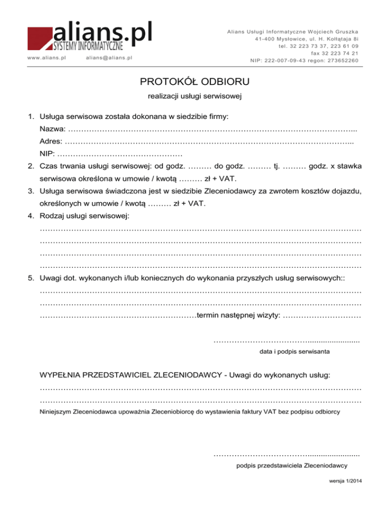 www. a l i a ns. pl A li ans Usł ugi I nf orm at yc zne W ojci ec h G rus zk a 4 1 -400 Mysł owi ce , ul. H. Koł ł ąt aj a 8i t el . 32 223 73 37, 223 61 09 f ax 32 223 74 21 NIP: 222 -0 0 7 -0 9 -43 regon: 273652260 al i ans@ a li a ns.p l PROTOKÓŁ ODBIORU realizacji usługi serwisowej 1. Usługa serwisowa została dokonana w siedzibie firmy: Nazwa: ………………………………………………………………………………………………... Adres: ………………………………………………………………………………………………... NIP: ………………………………………… 2. Czas trwania usługi serwisowej: od godz. ……… do godz. ……… tj. ……… godz. x stawka serwisowa określona w umowie / kwotą ……… zł + VAT. 3. Usługa serwisowa świadczona jest w siedzibie Zleceniodawcy za zwrotem kosztów dojazdu, określonych w umowie / kwotą ……… zł + VAT. 4. Rodzaj usługi serwisowej: …………………………………………………………………………………………………………… …………………………………………………………………………………………………………… …………………………………………………………………………………………………………… …………………………………………………………………………………………………………… 5. Uwagi dot. wykonanych i/lub koniecznych do wykonania przyszłych usług serwisowych:: …………………………………………………………………………………………………………… …………………………………………………………………………………………………………… ……………………………………………………termin następnej wizyty: ………………………… ………………………………........................ data i podpis serwisanta WYPEŁNIA PRZEDSTAWICIEL ZLECENIODAWCY - Uwagi do wykonanych usług: …………………………………………………………………………………………………………… …………………………………………………………………………………………………………… Niniejszym Zleceniodawca upoważnia Zleceniobiorcę do wystawienia faktury VAT bez podpisu odbiorcy ………………………………........................ podpis przedstawiciela Zleceniodawcy wersja 1/2014