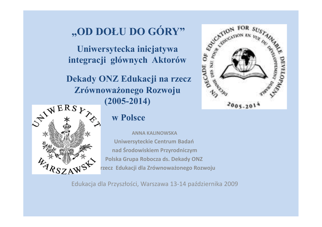 „OD DOŁU DO GÓRY” Uniwersytecka inicjatywa integracji głównych Aktorów Dekady ONZ Edukacji na rzecz ZrównowaŜonego Rozwoju (2005-2014) w Polsce ANNA KALINOWSKA Uniwersyteckie Centrum Badań nad Środowiskiem Przyrodniczym Polska Grupa Robocza ds. Dekady ONZ na rzecz Edukacji dla Zrównoważonego Rozwoju Edukacja dla Przyszłości, Warszawa 13-14 października 2009 Uniwersyteckie Centrum Badań nad Środowiskiem Przyrodniczym Międzywydziałowa placówka Uniwersytetu Warszawskiego powstała w 1989 roku jako wyraz potrzeby interdyscyplinarności w ochronie środowiska. W 2009 Rada Naukowa UCBS ( przedstawiciele Wydz. Biologii, Chemii, Geologii, Geografii , Fizyki, Nauk Ekonomicznych, Prawa i Administracji, Socjologii i Filozofii) rozpoczęła procedurę zmiany nazwy na : Uniwersyteckie Centrum Badań nad Środowiskiem i Zrównoważonym Rozwojem Dydaktyka • Ponad 25 prac magisterskich na MSOŚ poświęconych edukacji ekologicznej, wdrażania zrównoważonego rozwoju i komunikacji społ. • Zajęcia kursowe :Edukacja ekologiczna w Polsce i na świecie - wykład i ćwiczenia • Od 17 lat prowadzone otwarte wykłady : Wybrane zagadnienia z ochrony środowiska • Ponad 100 absolwentów Studiów Podyplom. :Metody i treści edukacji ekologicznej • Kilkuset absolwentów kursów i warsztatów w dziedzinie teorii i praktyki edukacji dla ZR Biblioteka • 2700 pozycji książkowych. • Czasopisma i materiały dydaktyczne. • Ponad 1000 odwiedzających rocznie. Publikacje Ponad 40 tytułów wydawnictw- książek, podręczników, poradników, programów szkolnych poświęconych edukacji dla ZR Działalność popularyzatorska • Organizacja otwartych wykładów, pokazów filmowych i wystaw z okazji Dni UW, obchodów Dnia Ziemi , Dnia Ochrony Środowiska itp. • Udział w programach radiowych i telewizyjnych poświęconych ochronie środowiska i ich tworzenie Działalność badawcza i ekspercka w zakresie zrównoważonego rozwoju m.in. dla MŚ, NFOŚiGW, MEN, MON, samorządów i POE • Przygotowywanie, opiniowanie krajowych oraz regionalnych polityk i strategii dotyczących zrównoważonego rozwoju, • dokumentów edukacji ekologicznej, (Narodowa Strategia, Narodowy Program EE), • wdrażania konwencji (Konwencja o różnorodności biologicznej, Ramowa konwencja klimatyczna), • ocen oddziaływania na środowisko, • udziału społecznego w zarządzaniu środowiskiem. • Tworzenie i konsultowanie krajowych i stołecznych programów EZR . Szeroka współpraca międzynarodowa Studium NATO-Edukacja Ekologiczna w Siłach Zbrojnych Committee on the Challenges of Modern Society Wybrane projekty krajowe i międzynarodowe UCBS • • • • • 2008-2010-BEAGLE- „Edukacja dla różnorodności biologicznej w kontekście zrównoważonego rozwoju „ ( program UE Lifelong Learning) 2004 - Tworzenie strony Internetowej poświęconej EZR www.ekoedu.uw.edu.pl dla wspierania DEZR (NFOŚiGW). 2004 - „Edukacja ekologiczna dla niepełnosprawnych” – Bułgaria, Łotwa, Słowacja, Wlk. Brytania ( program UE SOCRATES/Leonardo da Vinci) 2001 - 2003 - „Interaktywne strony internetowe poświęcone EZR” www.efseurope.org/pl - (Program UE SOCRATES/Minerva.) 2000 - 2001 - „Szkolenia dla nauczycieli w zakresie wykorzystania edukacji ekologicznej w internecie” - ( The British Council). • 1999 „Edukacja ekologiczna w parkach narodowych i krajobrazowych płn. -wsch. Polski” ( Know How Fund i Field Studies Council). • 1998 - 1999 - „Stworzenie sieci instruktorów Edukacji Ekologicznej” ( The British Council). Od Johannesburga 2002 do Warszawy 2009spotkania międzynarodowe i krajowe z udziałem UCBS ważne dla powstania Grupy Roboczej i jej działania • • • • • • • • Johannesburg 2002—Szczyt ONZ nt ZR.- przygotowania DZR Początek DEZR 2005 Warszawa 2006- Konferencja INE i Wuppertal Institut Bonn 2006- Konferencja UNESCO- DEZR na świecie Ahmedabad 2007- IV Konferencja UNESCO- Partnerzy DEZR Bonn 2008- KRB 9COP (Inicjatywa CEPA) Barcelona2008 Światowy Kongres Ochrony Przyrody Bonn 2009 Konferencja UNESCO w połowie Dekady Warszawa 2009 Na szlaku … Konferencja MŚ Ważne jest, by osoby odpowiedzialne za formalną, nieformalną i pozaformalną edukację współpracowały z właściwymi organami państwowymi… Istnieje potrzeba..dzielenia się informacją i stymulowania partnerstwa pomiędzy różnymi podmiotami. Jedną z opcji jest ustanowienie „krajowej platformy EZR” Wzór- organizacja Dekady w Niemczech • Jedność wizji EZR mimo autonomii programów edukacji w landach • Patronat nad Dekadą objął prezydent Republiki Federalnej Niemiec • 2002 Uchwała Bundestagu wspierająca wprowadzenie Dekady ONZ EZR 2005-2014 w Niemczech • 2005 uchwalenie przez Bundestag „Planu działań w ramach Dekady ” • Szeroki sojusz świata polityki i społeczeństwa obywatelskiego: powstanie platformy najważniejszych podmiotów, które opracowały zasady realizacji projektu Edukacji dla ZR. Powstał Komitet Narodowy: – ponad 100 podmiotów • Co roku zbiera się Okrągły Stół Dekady, Od dołu do góry: inicjatywy „grass root” działań DEZR w Polsce • Działalność informacyjna - wykłady, referaty na konferencjach , publikacje, wystąpienia w mediach • Wykłady informacyjne na temat założeń Dekady dla starających się o dofinansowanie z NFOŚiGW • Zapraszanie do współpracy centralnych instytucji min. poprzez ubieganie się o ich patronat (UNESCO,MŚ,MEN) • Prowadzenie projektów edukacyjnych propagujących założenia Dekady EZR • Prowadzenie stron internetowych i portali EZR Inicjatywa zwołania Polskiej Grupy Roboczej przy UCBS w celu spotkania i współdziałania Aktorów Dekady EZR Z inicjatywy UCBS powstał zespół nazwany Polską Grupą Roboczą do spraw DEZR, do którego przyjęli zaproszenie przedstawiciele zainteresowanych Dekadą EZR instytucji rządowych, organizacji pozarządowych i placówek edukacyjnych: • PK UNESCO,