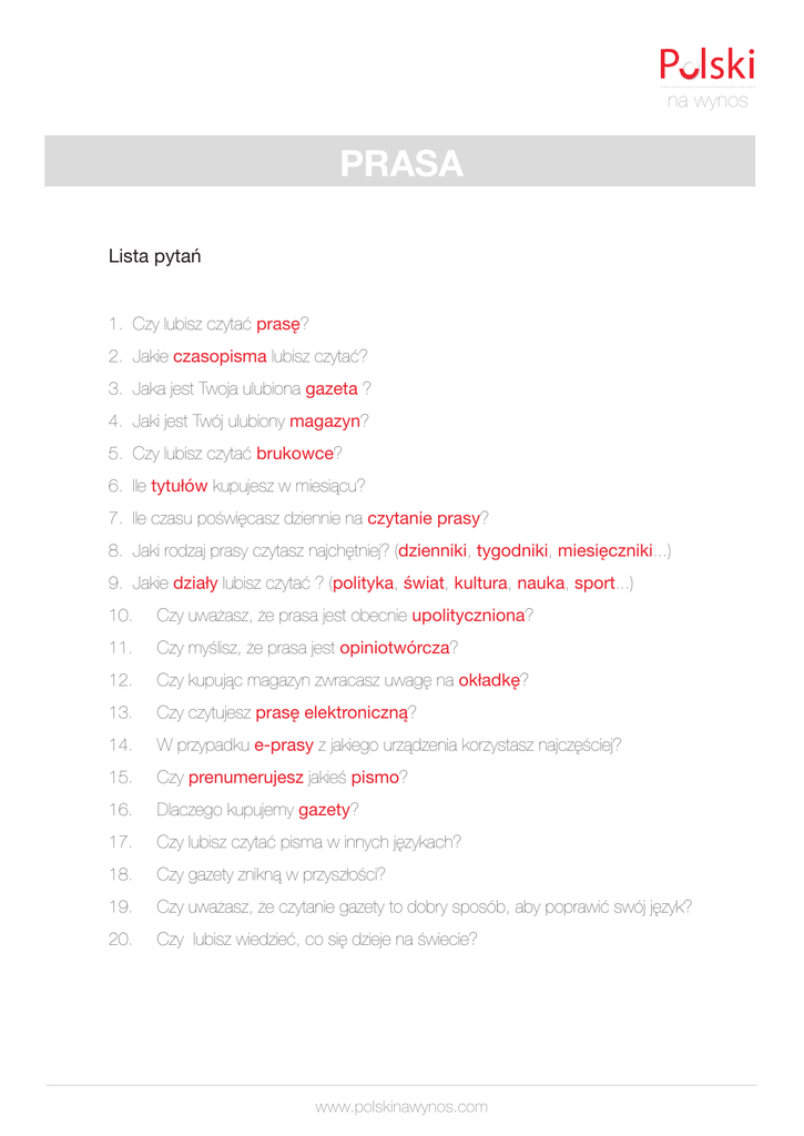 na wynos PRASA Lista pytań 1. Czy lubisz czytać prasę? 2. Jakie czasopisma lubisz czytać? 3. Jaka jest Twoja ulubiona gazeta ? 4. Jaki jest Twój ulubiony magazyn? 5. Czy lubisz czytać brukowce? 6. Ile tytułów kupujesz w miesiącu? 7. Ile czasu poświęcasz dziennie na czytanie prasy? 8. Jaki rodzaj prasy czytasz najchętniej? (dzienniki, tygodniki, miesięczniki...) 9. Jakie działy lubisz czytać ? (polityka, świat, kultura, nauka, sport...) 10. Czy uważasz, że prasa jest obecnie upolityczniona? 11. Czy myślisz, że prasa jest opiniotwórcza? 12. Czy kupując magazyn zwracasz uwagę na okładkę? 13. Czy czytujesz prasę elektroniczną? 14. W przypadku e-prasy z jakiego urządzenia korzystasz najczęściej? 15. Czy prenumerujesz jakieś pismo? 16. Dlaczego kupujemy gazety? 17. Czy lubisz czytać pisma w innych językach? 18. Czy gazety znikną w przyszłości? 19. Czy uważasz, że czytanie gazety to dobry sposób, aby poprawić swój język? 20. Czy lubisz wiedzieć, co się dzieje na świecie? www.polskinawynos.com