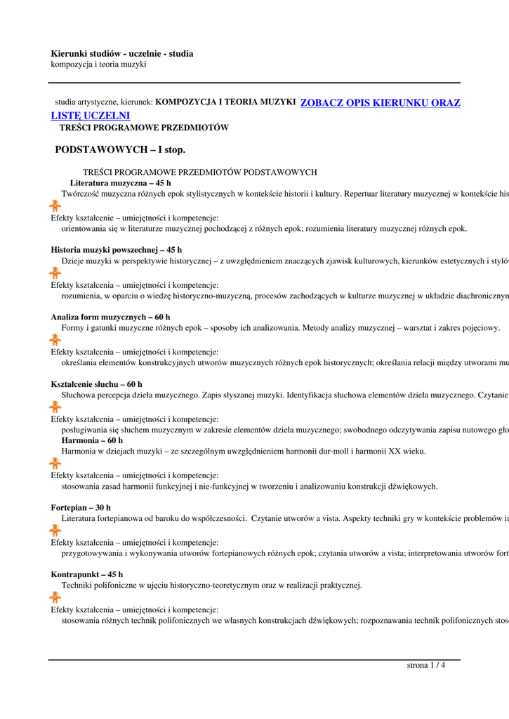 Kierunki studiów - uczelnie - studia kompozycja i teoria muzyki studia artystyczne, kierunek: KOMPOZYCJA I TEORIA MUZYKI LISTĘ UCZELNI ZOBACZ OPIS KIERUNKU ORAZ TREŚCI PROGRAMOWE PRZEDMIOTÓW PODSTAWOWYCH – I stop. TREŚCI PROGRAMOWE PRZEDMIOTÓW PODSTAWOWYCH Literatura muzyczna – 45 h Twórczość muzyczna różnych epok stylistycznych w kontekście historii i kultury. Repertuar literatury muzycznej w kontekście his Efekty kształcenie – umiejętności i kompetencje: orientowania się w literaturze muzycznej pochodzącej z różnych epok; rozumienia literatury muzycznej różnych epok. Historia muzyki powszechnej – 45 h Dzieje muzyki w perspektywie historycznej – z uwzględnieniem znaczących zjawisk kulturowych, kierunków estetycznych i stylów Efekty kształcenia – umiejętności i kompetencje: rozumienia, w oparciu o wiedzę historyczno-muzyczną, procesów zachodzących w kulturze muzycznej w układzie diachronicznym Analiza form muzycznych – 60 h Formy i gatunki muzyczne różnych epok – sposoby ich analizowania. Metody analizy muzycznej – warsztat i zakres pojęciowy. Efekty kształcenia – umiejętności i kompetencje: określania elementów konstrukcyjnych utworów muzycznych różnych epok historycznych; określania relacji między utworami mu Kształcenie słuchu – 60 h Słuchowa percepcja dzieła muzycznego. Zapis słyszanej muzyki. Identyfikacja słuchowa elementów dzieła muzycznego. Czytanie Efekty kształcenia – umiejętności i kompetencje: posługiwania się słuchem muzycznym w zakresie elementów dzieła muzycznego; swobodnego odczytywania zapisu nutowego gło Harmonia – 60 h Harmonia w dziejach muzyki – ze szczególnym uwzględnieniem harmonii dur-moll i harmonii XX wieku. Efekty kształcenia – umiejętności i kompetencje: stosowania zasad harmonii funkcyjnej i nie-funkcyjnej w tworzeniu i analizowaniu konstrukcji dźwiękowych. Fortepian – 30 h Literatura fortepianowa od baroku do współczesności. Czytanie utworów a vista. Aspekty techniki gry w kontekście problemów in Efekty kształcenia – umiejętności i kompetencje: przygotowywania i wykonywania utworów fortepianowych różnych epok; czytania utworów a vista; interpretowania utworów fort Kontrapunkt – 45 h Techniki polifoniczne w ujęciu historyczno-teoretycznym oraz w realizacji praktycznej. Efekty kształcenia – umiejętności i kompetencje: stosowania różnych technik polifonicznych we własnych konstrukcjach dźwiękowych; rozpoznawania technik polifonicznych stoso strona 1 / 4 Kierunki studiów - uczelnie - studia kompozycja i teoria muzyki KIERUNKOWYCH – I stop. TREŚCI PROGRAMOWE PRZEDMIOTÓW KIERUNKOWYCH – 195 h Podstawy kompozycji Warsztat kompozytorski. Rozwój osobowości twórczej. Efekty kształcenia – umiejętności i kompetencje: komponowania utworów instrumentalnych, wokalnych i wokalno-instrumentalnych w oparciu o własne predyspozycje twórcze i w Instrumentacja Technika instrumentacji w utworach o różnorodnej obsadzie instrumentalnej i wokalno-instrumentalnej – od klasycyzmu do współ Efekty kształcenia – umiejętności i kompetencje: orkiestrowania z pomocą instrumentarium oraz środków fakturalnych, kolorystycznych i stylistycznych charakterystycznych dla da Czytanie partytur Odczytywanie partytur kompozycji kameralnych, symfonicznych i wielkich form wokalno-instrumentalnych pod kątem ich odtwar Efekty kształcenia –umiejętności i kompetencje: odtwarzania na fortepianie partytur kompozycji kameralnych, symfonicznych i wielkich form wokalno-instrumentalnych; stylistycz Harmonia praktyczna Zasady harmonii w praktyce muzycznej. Efekty kształcenia – umiejętności i kompetencje: realizowania i tworzenia konstrukcji korzystając ze środków właściwych dla danego systemu harmonicznego. Techniki kompozytorskie XX wieku Techniki kompozytorskie XX wieku – zakres ich stosowania. Efekty kształcenia – umiejętności i kompetencje: stosowania wybranych technik kompozytorskich XX wieku w kompozycjach własnych, w analizie słuchowej i w opracowaniach p Muzyka polska XX i XXI wieku Twórczość kompozytorów polskich XX i XXI wieku w kontekście uwarunkowań polityczno-społecznych, kulturowych i stylistycz Efekty kształcenia – umiejętności i kompetencje: rozróżniania twórców, dzieł, kierunków, stylów i technik kompozytorskich reprezentatywnych dla polskiej twórczości muzycznej X Propedeutyka dyrygowania Podstawy warsztatu dyrygenckiego. Warsztat dyrygencki w przypadku wybranych utworów wokalnych i instrumentalnych różnych Efekty kształcenia – umiejętności i kompetencje: wykorzystywania warsztatu dyrygenckiego w przypadku utworów chóralnych i symfonicznych w kontekście stylu i tradycji wykon PODSTAWOWYCH – II stop. strona 2 / 4 Kierunki studiów - uczelnie - studia kompozycja i teoria muzyki TREŚCI PROGRAMOWE PRZEDMIOTÓW PODSTAWOWYCH Estetyka muzyki – 30 h Estetyka muzyki w ujęciu historycznym z uwzględnieniem problematyki wartości. Efekty kształcenia – umiejętności i kompetencje: stosowania wiedzy z zakresu estetyki muzyki; analizy dzieła muzycznego w aspekcie doktryn estetycznych. Psychologia muzyki – 30 h Obszary badawcze psychologii muzyki. Psychologia twórczości. Psychologia odbioru. Efekty kształcenia – umiejętności i kompetencje: orientowania się w psychologii muzyki jako dziedzinie badań naukowych i zastosowań praktycznych; korzystania z wiedzy psycho Analiza dzieła muzycznego – 30 h Analiza dzieła muzycznego w relacji do utworów różnych epok i kierunków stylistycznych. Metody analityczne. Efekty kształcenia – umiejętności i kompetencje: posługiwania się warsztatem analizy i interpretacji dzieła muzycznego z uwzględnieniem różnych metod i strategii badawczych; w Promocja i marketing – 15 h Istota marketingu oraz zarządzania instytucjami kultury. Działania marketingowe w zarządzaniu kulturą. Efekty kształcenia – umiejętności i kompete