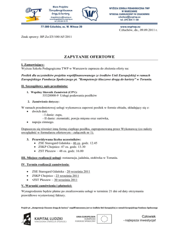 Człuchów, dn., 09.09.2011 r. Znak sprawy: BP.Zo/Z5/100/AF/2011 ZAPYTANIE OFERTOWE I. Zamawiający: Wyższa Szkoła Pedagogiczna TWP w Warszawie zaprasza do złożenia oferty na: Posiłek dla uczestników projektu współfinansowanego ze środków Unii Europejskiej w ramach Europejskiego Funduszu Społecznego pt. ”Kompetencje kluczowe drogą do kariery” w Toruniu. II. Szczegółowy opis przedmiotu: 1. Wspólny Słownik Zamówień (CPV): 55320000-9 Usługi podawania posiłków 2. Zamówienie dotyczy: W ramach przedmiotowej usługi wykonawca zapewni posiłek w formie obiadu, składający się z: dwóch dań: - I danie: zupa, - II danie: ziemniaki, porcja mięsna oraz surówka, napoju zimnego. Dopuszcza się również inną formę ciepłego posiłku, zaproponowaną przez Wykonawcę (co należy uwzględnić w formularzu ofertowym - załącznik nr 1). 3. Przewidywana liczba uczestników: ZSE Starogard Gdańska - 46 os. godz. 12.45 ZSKP Chojnice- 47 os. godz. 13.30 ZST Pleszew – 48 os. godz. 16.00 III. Miejsce realizacji usługi: restauracja, jadalnia, stołówka w Toruniu. IV. Termin realizacji zamówienia: ZSE Starogard Gdańska - 20 września 2011 ZSKP Chojnice - 23 września 2011 •ZST Pleszew – 30 września 2011 V. Warunki zamówienia i płatności: Wynagrodzenie będzie płatne po zrealizowaniu usługi w terminie 21 dni od daty otrzymania prawidłowo wystawionej faktury. VI. Kryterium wyboru oferty: 1) cena za 1 osobę – 100 %, Oferta maksymalnie może otrzymać 100 pkt. Uwaga: Zamawiający zastrzega sobie prawo odrzucenia oferty w przypadku, gdy zaproponowana przez Wykonawcę cena przekroczy możliwości finansowe Zamawiającego. VII. Miejsce i termin złożenia oferty: Wyższa Szkoła Pedagogiczna TWP w Warszawie Wydział Zamiejscowy w Człuchowie, os. Witosa 20, 77-300 Człuchów, Biuro Projektu „Kompetencje kluczowe drogą do kariery”, w terminie do dnia 16 września 2011 r. do godziny 13.00 VIII. Termin otwarcia ofert – dnia 16 września 2011 r. od godziny 13.15 IX. Sposób przygotowania oferty: Ofertę należy przygotować zgodnie z załącznikiem do niniejszego zapytania (formularz ofertowy), następnie przesłać Zamawiającemu e-mailem na adres [email protected] lub faxem na nr 59 83 443 72 z poniższym opisem: Oferta na: Posiłek dla uczestników projektu współfinansowanego ze środków Unii Europejskiej w ramach Europejskiego Funduszu Społecznego pt. ”Kompetencje kluczowe drogą do kariery” w Toruniu.- nie otwierać do dnia 16 września 2011 r. do godziny 13.00 Magdalena Werner Koordynator Projektu „Kompetencje kluczowe drogą do kariery”