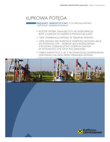 BROSZURA PRODUKTOWa Sierpień 2013 Raiffeisen Centrobank AG Łupkowa Potęga Produkt inwest ycyjny z ochroną kapitału Certyfikat gwarantowany1 ▪▪ KOSZYK SPÓŁEK ZAJMUJĄCYCH SIĘ EKSPLOATACJĄ ROPY Z ŁUPKÓW W AMERYCE PÓŁNOCNEJ (USA) ▪▪ 100% GWARANCJI KAPITAŁU W TERMINIE WYKUPU ▪▪ 100% UDZIAŁU WE WZROŚCIE WARTOŚCI KOSZYKA AKCJI DO POZIOMU 27% – WZROST AKCJI KAŻDEJ SPÓŁKI Z KOSZYKA OGRANICZONY GÓRNYM LIMITEM W WYSOKOŚCI 27% CENY POCZĄTKOWEJ ▪▪ OKRES INWESTYCJI: 5 LAT Z MOŻLIWOŚCIĄ ODSPRZEDANIA CERTYFIKATU NA GPW PRZED TERMINEM WYKUPU 1 … W rozumieniu Prospektu Bazowego z dn. 10.06.2013 oraz Warunków Końcowych nr 1434 z dn. 02.08.2013 r. Certyfikat Gwarantowany typu Winner z Limitem Górnym Raiffeisen Centrobank AG Łupkowa Potęga WZROSTOWY POTENCJAŁ SPÓŁEK Inwestycja w certyfikat strukturyzowany RCB – Łupkowa Potęga daje Inwestorowi możliwość uzyskania stopy zwrotu na poziomie maksymalnie 27% za okres 5 lat. W przypadku spadku wartości koszyka akcji Inwestor w dniu wykupu otrzymuje zwrot w wysokości 100% zainwestowanego kapitału (wyłączając opłatę subskrypcyjną). Wykup certyfikatów nastąpi w sierpniu 2018 r. NAJWAŻNIEJSZE INFORMACJE Emitent Raiffeisen Centrobank AG Gwarant* Raiffeisen Centrobank AG ISINAT0000A114V7 Kwota nominalna 1000 zł Cena emisyjna 1000 zł Opłata subskrypcyjna 10 zł za jeden certyfikat Subskrypcja1 12 - 27.08.2013 Dzień pierwszej wyceny 29.08.2013 Dzień ostatecznej wyceny 27.08.2018 Dzień wykupu 30.08.2018 Oczekiwany pierwszy dzień notowania na GPW2 16.09.2013 Ochrona kapitału 100% (w dniu wykupu) Kwota gwarantowana 1000 zł (w dniu wykupu) Górny limit zysku (cap) 27% Kwota wykupu (wykup przez Raiffeisen Centrobank AG* w terminie wykupu) Inwestor otrzymuje za każdy certyfikat sumę kwoty gwarantowanej 1000 zł oraz iloczynu kwoty nominalnej i stopy zwrotu z koszyka akcji 7 spółek ograniczonej do wysokości 27%. W przypadku gdy stopa zwrotu z koszyka przyjmie wartość ujemną, wartość iloczynu będzie równa wartości zero, a Inwestorowi będzie wypłacona kwota gwarantowana. NotowaniaGPW2 Aktualna cena www.rcb.at Wartość certyfikatu opiera się o koszyk akcji 7 spółek zajmujących się zarówno eksploatacją złóż łupkowych w Ameryce Północnej, jak również „klasycznym” wydobyciem ropy oraz gazu w różnych rejonach świata, przy czym głównym rejonem ich działań jest USA. Wyselekcjonowane spółki posiadają bardzo wysoki udział rekomendacji analityków typu trzymaj lub kupuj (na poziomie 99% wszystkich aktualnych rekomendacji). W horyzoncie jednorocznym potencjał wzrostu dla większości z nich przekracza 10%, a dla części jest bliski 20%. Dodatkowo dla większości z nich wyceny sporządzone na podstawie danych fundamentalnych znajdują się poniżej średnich dla sektora, a jednocześnie ich akcje znajdują się w stabilnym trendzie wzrostowym z wycenami giełdowymi bliskimi maksymalnym poziomom historycznym (co wskazuje na ich niedowartościowanie przez rynek). Za sprawą rosnącego udziału wykorzystania ropy WTI3 w USA kosztem udziału ropy Brent, w notowaniach akcji wybranych spółek tworzących koszyk można oczekiwać utrzymania się obecnych trendów wzrostowych oraz ustanowienia nowych maksymalnych poziomów kursowych na lokalnych giełdach. Składowe koszyka akcji Spółka Bloomberg Ticker Apache CorpAPA UN Devon Energy Corporation DVN UN Andarko Petroleum CorpAPC UN Chevron Corp CVX UN Marathon Oil Corp MRO UN Occidental Petroleum CorpOXY UN EOG Resources INC EOG UN Waga w koszyku 1/7 1/7 1/7 1/7 1/7 1/7 1/7 Zasady funkcjonowania Na koniec okresu inwestycji Inwestor w każdym wypadku otrzymuje przynajmniej 100% kwoty nominalnej, czyli 1000 zł za jeden certyfikat. Potencjalny zysk zależy od wzrostu wartości koszyka akcji 7 spółek z tym, że stopa zwrotu z akcji pojedynczej spółki używana do obliczenia stopy zwrotu z całego koszyka ograniczona jest górnym limitem tzw. cap do wysokości 27%. Ostateczna stopa zwrotu z inwestycji kalkulowana jest w terminie wykupu. Przykładowe obliczenie wartości koszyka w dniu wykupu 1 … Raiffeisen Centrobank AG zastrzega sobie prawo do przedwczesnego zakończenia lub wydłużenia okresu subskrypcji. 2 … Intencją Emitenta jest ubieganie się o dopuszczenie certyfikatów do obrotu na GPW. Termin pierwszego notowania może ulec przesunięciu z przyczyn niezależnych od Emitenta. 3 … Ropa naftowa typu West Texas Intermediate (WTI), znana również pod nazwą Texas light sweet to jeden z typów surowca służący, jako jego benchmark na globalnym rynku. Przykładowo ropa WTI jest używana jako instrument bazowy dla kontraktów terminowych na ropę na Giełdzie Towarowej w Chicago (Chicago Mercantile Exchange). Przykładowa Wartość Wpływ zmianapo uwzględnieniU Wagana wartość Spółkawartościgórnego limitu W koszyku Formułakoszyka Apache Corp -10% -10% 1/7 -10% x 1/7 -1,4% Devon Energy Corporation +42% +27% 1/7 +27% x 1/7 3,9% Andarko Petroleum Corp +35% +27% 1/7 +27% x 1/7 3,9% Chevron Corp +27% +27% 1/7 +27% x 1/7 3,9% Marathon Oil Corp +20% +20% 1/7 +20% x 1/7 2,9% Occidental Petroleum Corp +15% +15% 1/7 +15% x 1/7 2,1% EOG Resources INC +50% +27% 1/7 +27% x 1/7 3,9% ∑+19,2% www.rcb.at Kapitał podlega ochronie w wysokości 100% kwoty nominalnej certyfikatu (1000 zł) wyłącznie w dniu wykupu. Przed terminem wykupu może zdarzyć się, że cena rynkowa certyfikatu znajdzie się poniżej kwoty nominalnej. Jednakże w dniu wykupu, niezależnie od sytuacji rynkowej, Inwestor otrzyma zwrot co najmniej 100% kwoty nominalnej za każdy certyfikat. Gwarantem wypłaty w tym wypadku jest Raiffeisen Centrobank AG. Raiffeisen Centrobank AG *Raiffeisen Centrobank AG należy w 100 % do Raiffeisen Bank International AG – rating RBI: www.rbinternational.com/ir/ratings O Emitencie: Raiffeisen Centrobank jest wiodącym austriackim bankiem inwestycyjnym oferującym szeroką paletę usług i produktów związanych 