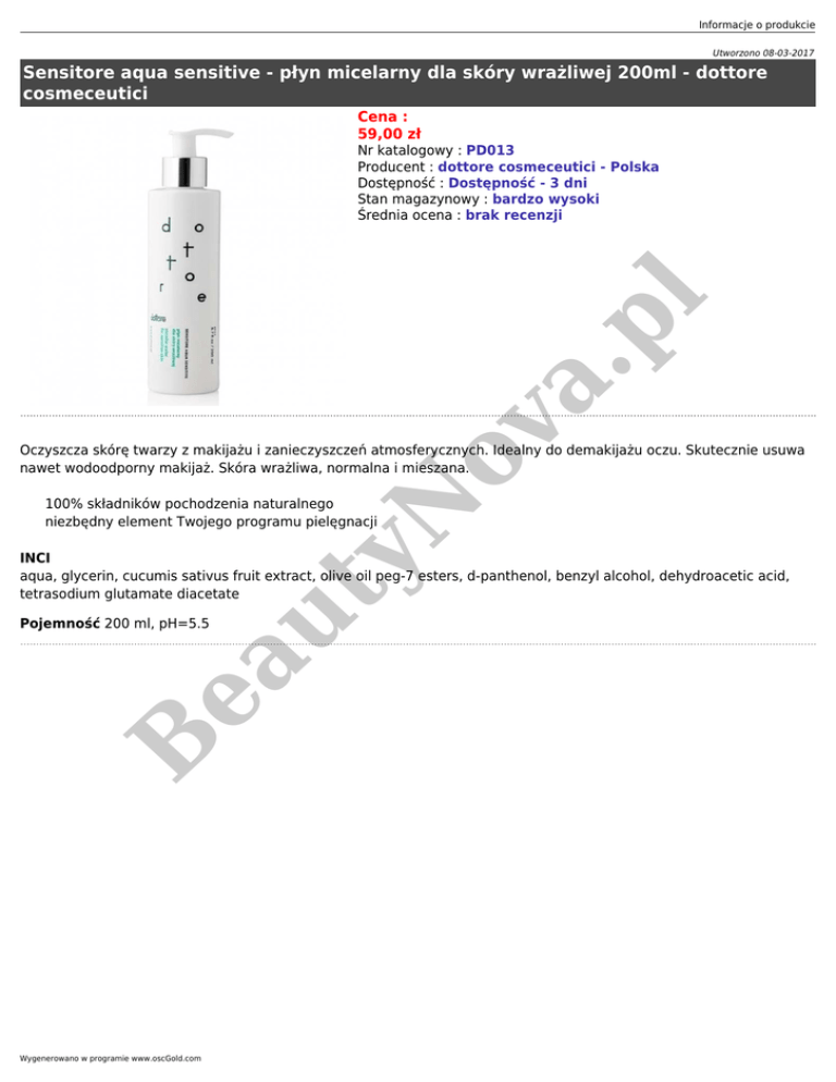Informacje o produkcie Utworzono 08-03-2017 Sensitore aqua sensitive - płyn micelarny dla skóry wrażliwej 200ml - dottore cosmeceutici Cena : 59,00 zł ov a. pl Nr katalogowy : PD013 Producent : dottore cosmeceutici - Polska Dostępność : Dostępność - 3 dni Stan magazynowy : bardzo wysoki Średnia ocena : brak recenzji yN Oczyszcza skórę twarzy z makijażu i zanieczyszczeń atmosferycznych. Idealny do demakijażu oczu. Skutecznie usuwa nawet wodoodporny makijaż. Skóra wrażliwa, normalna i mieszana. 100% składników pochodzenia naturalnego niezbędny element Twojego programu pielęgnacji B ea Pojemność 200 ml, pH=5.5 ut INCI aqua, glycerin, cucumis sativus fruit extract, olive oil peg-7 esters, d-panthenol, benzyl alcohol, dehydroacetic acid, tetrasodium glutamate diacetate Wygenerowano w programie www.oscGold.com