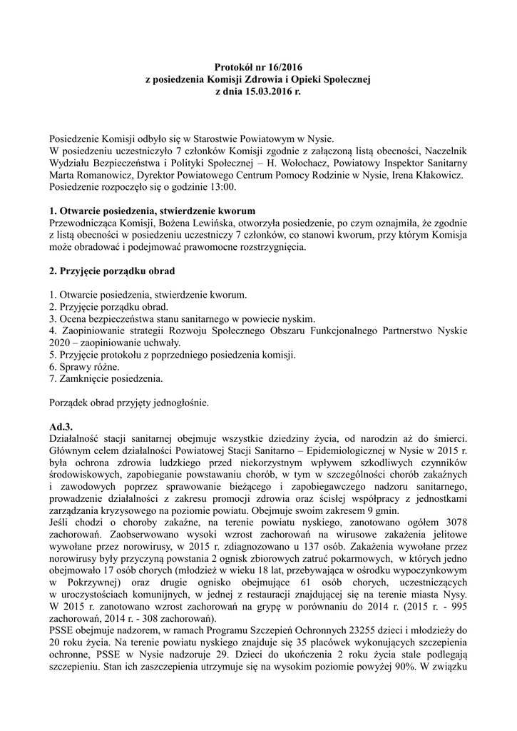 Protokół nr 16/2016 z posiedzenia Komisji Zdrowia i Opieki Społecznej z dnia 15.03.2016 r. Posiedzenie Komisji odbyło się w Starostwie Powiatowym w Nysie. W posiedzeniu uczestniczyło 7 członków Komisji zgodnie z załączoną listą obecności, Naczelnik Wydziału Bezpieczeństwa i Polityki Społecznej – H. Wołochacz, Powiatowy Inspektor Sanitarny Marta Romanowicz, Dyrektor Powiatowego Centrum Pomocy Rodzinie w Nysie, Irena Kłakowicz. Posiedzenie rozpoczęło się o godzinie 13:00. 1. Otwarcie posiedzenia, stwierdzenie kworum Przewodnicząca Komisji, Bożena Lewińska, otworzyła posiedzenie, po czym oznajmiła, że zgodnie z listą obecności w posiedzeniu uczestniczy 7 członków, co stanowi kworum, przy którym Komisja może obradować i podejmować prawomocne rozstrzygnięcia. 2. Przyjęcie porządku obrad 1. Otwarcie posiedzenia, stwierdzenie kworum. 2. Przyjęcie porządku obrad. 3. Ocena bezpieczeństwa stanu sanitarnego w powiecie nyskim. 4. Zaopiniowanie strategii Rozwoju Społecznego Obszaru Funkcjonalnego Partnerstwo Nyskie 2020 – zaopiniowanie uchwały. 5. Przyjęcie protokołu z poprzedniego posiedzenia komisji. 6. Sprawy różne. 7. Zamknięcie posiedzenia. Porządek obrad przyjęty jednogłośnie. Ad.3. Działalność stacji sanitarnej obejmuje wszystkie dziedziny życia, od narodzin aż do śmierci. Głównym celem działalności Powiatowej Stacji Sanitarno – Epidemiologicznej w Nysie w 2015 r. była ochrona zdrowia ludzkiego przed niekorzystnym wpływem szkodliwych czynników środowiskowych, zapobieganie powstawaniu chorób, w tym w szczególności chorób zakaźnych i zawodowych poprzez sprawowanie bieżącego i zapobiegawczego nadzoru sanitarnego, prowadzenie działalności z zakresu promocji zdrowia oraz ścisłej współpracy z jednostkami zarządzania kryzysowego na poziomie powiatu. Obejmuje swoim zakresem 9 gmin. Jeśli chodzi o choroby zakaźne, na terenie powiatu nyskiego, zanotowano ogółem 3078 zachorowań. Zaobserwowano wysoki wzrost zachorowań na wirusowe zakażenia jelitowe wywołane przez norowirusy, w 2015 r. zdiagnozowano u 137 osób. Zakażenia wywołane przez norowirusy były przyczyną powstania 2 ognisk zbiorowych zatruć pokarmowych, w których jedno obejmowało 17 osób chorych (młodzież w wieku 18 lat, przebywająca w ośrodku wypoczynkowym w Pokrzywnej) oraz drugie ognisko obejmujące 61 osób chorych, uczestniczących w uroczystościach komunijnych, w jednej z restauracji znajdującej się na terenie miasta Nysy. W 2015 r. zanotowano wzrost zachorowań na grypę w porównaniu do 2014 r. (2015 r. - 995 zachorowań, 2014 r. - 308 zachorowań). PSSE obejmuje nadzorem, w ramach Programu Szczepień Ochronnych 23255 dzieci i młodzieży do 20 roku życia. Na terenie powiatu nyskiego znajduje się 35 placówek wykonujących szczepienia ochronne, PSSE w Nysie nadzoruje 29. Dzieci do ukończenia 2 roku życia stale podlegają szczepieniu. Stan ich zaszczepienia utrzymuje się na wysokim poziomie powyżej 90%. W związku z okresowymi brakami szczepionki przeciwko błonicy, tężcowi i krztuścowi oraz przeciwko odrze, śwince i różyczce, dzieci 6-letnie, 10-letnie, 14-letnie były szczepione z opóźnieniem, dlatego w 2015 r. nastąpił spadek wykonawstwa szczepień. W ubiegłym roku zostało również zakupione urządzenie do zasilania awaryjnego z akumulatorami (UPS), które na 8h gwarantuje zapewnienie energii elektrycznej dla chłodziarek i lodówek, w których przechowywane są szczepionki. Jeśli chodzi o stan sanitarny podmiotów prowadzących działalność leczniczą, pod nadzorem PSSE w 2015 r. znajdowało się 303 podmioty prowadzące działalność leczniczą. Skontrolowano ogółem 182 placówki, z czego pod względem sanitarnym wszystkie obiekty zostały ocenione pozytywnie. We wszystkich nadzorowanych placówkach prawidłowo prowadzone były procesy dezynfekcji i sterylizacji. Dostatecznie zaopatrzone były w sprzęt jednorazowego użycia, materiał opatrunkowy, środki dezynfekcyjne i czystościowe. PSSE w Nysie skontrolowała oba nadzorowane szpitale tj. Opolskie Centrum Rehabilitacji w Korfantowie oraz Nyskie Centrum Sercowo–Naczyniowe PAKS. Stan obu obiektów uległ zdecydowanej poprawie. Na terenie szpitala OCR w Korfantowie wybudowano nowy budynek, w którym mieści się blok operacyjny z trzema salami ( Centralna Sterylizatornia, stacja gazów medycznych, zaplecze magazynowe tj. magazyn odpadów medycznych, komunalnych oraz magazyn brudnej i czystej pościeli). Ponadto OCR w Korfantowie uzyskał pozwolenie na budowę nowego pawilonu z salami chorych, w których będzie się mieścić 100 łóżek dla pacjentów szpitala. W przypadku NCS-N PAKS w Nysie, w dalszym ciągu problem stanowią występujące okresowo zanieczyszczenia wody ciepłej w instalacji wewnętrznej szpitala pałeczkami Legionella. Inne obiekty użyteczności publicznej bez uwag. Mamy wzrost hoteli z kategoryzacją. Hotele, które spełniają standardy, dążą do tego, aby podnieść jakość, standard hoteli, ilość gwiazdek. W powiecie mamy 38 obiektów, z czego 10 ma nadane kategorie. Bazę sezonową stanowi 10 obiektów, z czego 2 posiadają nadaną kategorię. Pozostałe obiekty użyteczności publicznej (zakłady fryzjerskie, salony odnowy biologicznej, tatuażu)są kontrolowane, należy jednak podkreślić, że w dalszym ciągu prowadzenie bieżącego nadzoru sanitarnego jest utrudnione ze względu na brak szczegółowych przepisów prawnych. W ubiegłym roku, PSSE w Nysie przy współudziale firmy MEDILAB, zorganizowała w PWSZ w Nysie dla tych obiektów i studentów Wydziału Kosmetologii, szkolenie w zakresie dezynfekcji, zapobiegania zakażeniom w zakładach fryzjerskich, kosmetycznych itp. PSSE w Nysie ma pod kontrolą 1 kąpielisko i 1 miejsce wyznaczone dla kąpieli. Sezon kąpielowy trwał od 15 czerwca do 31.08.2015r. W trakcie trwania sezonu kąpielowego jakość wody w kąpielisku była regularnie badana pod kątem bakteriol