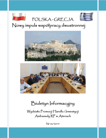 POLSKA - GRECJA Nowy impuls współpracy dwustronnej Biuletyn Informacyjny Wydziału Promocji Handlu i Inwestycji Ambasady RP w Atenach Nr10/2014 POLSKA-GRECJA Nowy impuls współpracy dwustronnej nr 10/2014 Spis Treści Wstęp Informacje bieżące z rynku greckiego Działania i opracowania WPHI Międzynarodowe targi w Grecji w 2014 roku Oferty współpracy firm greckich otrzymane przez WPHI Ateny Grecja na wesoło: 2 3 6 13 16 18 Okładka: Spotkanie przedstawicieli delegacji dyplomacji ekonomicznej państw Grupy Wyszehradzkiej na Krecie z Wicegubernatorem Krety Panią Theano Vrentzu – Skordalaki w siedzibie Urzędzie Gubernatora w Heraklionie. 1 Wydział Promocji Handlu i Inwestycji Ambasada RP w Atenach Skra 10, Holargos, 155 62 Ateny, Grecja, tel. +30 210 677 02 48, fax +30 210 672 19 52 www.athens.trade.gov.pl [email protected] POLSKA-GRECJA Nowy impuls współpracy dwustronnej nr 10/2014 Wstęp Szanowni Państwo, W I półroczu 2014 r., Grecję odwiedziło 132 920 Polaków. Przyjazdy turystów z Polski wzrosły o 35,5 proc. w stosunku do analogicznego okresu ubiegłego roku. Większość turystów polskich wybiera Kretę. Jest ważna destynacja turystyczna, ale także ważny partner gospodarczy dla polskich eksporterów. Odwiedzana jest przez ponad 4 mln turystów rocznie. Na Krecie zlokalizowanych jest 21 % greckich hoteli. Udział Krety w imporcie produktów rolno - spożywczych Grecji szacowany jest na ok. 10%. Import dotyczy niemal całości dostaw asortymentu HO.RE.CA. Dlatego jesteśmy aktywni na Krecie. Cieszy nas rozpoczęta współpraca Krety z Lubskiem oraz pierwsze kontrakty. Importerzy z Krety będą prowadzić rozmowy z polskim biznesem na naszym stoisku informacyjnym na targach Meat Days & Dairy Expo w Atenach. Podczas wydarzenia Grecos Family Adventure na Krecie objętego patronatem WPHI Ateny, mieliśmy okazję zobaczyć niezwykłą atencję, z jaką przyjmowani byli najlepsi agenci touroperatora. Polscy turyści wyrobili w Grecji znakomitą markę. Polscy przedsiębiorcy podążając ich śladem mają okazję wypromowania własnych marek w dostawach żywości i wyposażenia hoteli. Klimat na biznes w Grecji jest doskonały. Zachęcamy do współpracy. Mirosław Gojdź Radca Kierownik WPHI Ateny 2 Wydział Promocji Handlu i Inwestycji Ambasada RP w Atenach Skra 10, Holargos, 155 62 Ateny, Grecja, tel. +30 210 677 02 48, fax +30 210 672 19 52 www.athens.trade.gov.pl [email protected] POLSKA-GRECJA Nowy impuls współpracy dwustronnej nr 10/2014 Informacje bieżące z rynku greckiego Odbywa się Misja Gospodarcza do Aten w związku z targami MEAT DAYS & DAIRY EXPO & FROZEN FOOD 2014 Wydział Promocji Handlu i Inwestycji Ambasady RP w Atenach zorganizował misję gospodarcza do Aten przedsiębiorców branży mięsnej oraz mleczarskiej w dniach 1 – 3 listopada br. WPHI zorganizował stoisko informacyjne (hall 03, stand D06), podczas Międzynarodowych Targów MEAT DAYS & DAIRY EXPO & FROZEN FOOD 2014 w Metropolitan Expo w Atenach. Zorganizował spotkania, tłumaczenia, spotkania biznesowe uczestników misji z partnerami branżowymi w siedzibie WPHI Ateny i wizytacje w siedzibach firm greckich, seminarium ”Dostęp do rynku greckiego możliwości współpracy z Polonią” oraz spotkania z przedsiębiorcami polonijnymi oraz przedstawicielami Grecko - Polskiej Izby Przemysłowo – Handlowej. W misji udział biorą przedstawiciele pięciu firm polskich; Agraimpex Sp. z o.o. http://www.agraimpex.pl ,Tarczynski S.A. http://www.tarczynski.eu , Meat Masters Poland Sp. z o.o., http://www.meatmasters.pl , Zakład Masarski Zbójnik S. C. M. Sroka A. Sroka, ATT Sp. z o.o. http://www.att.eu . Na stoisku WPHI uczestniczą także przedstawiciele regionalni dziesięciu firm polskich: Kaskat Sp. z.o.o. http://www.kaskat.com , Spółdzielnia Mleczarska Gostyń http://www.smgostyn.pl, Okręgowa Spółdzielnia Mleczarska w Łowiczu http://www.mleczarnia.lowicz.pl , Polmlek Grup http://www.polmlek.com , ROTR Spółdzielnia Mleczarska w Rypinie http://www.rotr.pl/en.html , P.P.H.U. KAROL http://www.zpm-karol.pl , P.P.H.U. Mark's http://www.marks.biz.pl , CEDROB Sp. z o.o.. http://www.cedrob.com.pl , BOLERO PREMIUM Sp. z o.o. http://boleropremium.pl , Wilbo S.A. http://www.wilbo.pl . MEAT DAYS 2014 to międzynarodowe targi mięsa i wyposażenia przeznaczone do konkretnych potrzeb przedsiębiorców i handlowców branży mięsnej. Asortyment obejmuje mięso i produkty mięsne, maszyny i sprzęt do przetwarzania mięsa oraz transportu do rzeźni, systemy chłodzenia, rozwiązania w zakresie bezpieczeństwa, sprawdzone i innowacyjne wyposażenie dla rzeźników. Targi skierowane są do rzeźni i zakładów przetwórstwa mięsnego, jak również hurtowników i detalistów oraz do firm inżynieryjnych, przedstawicieli nauki i instytucji badań naukowych, jak również organizacji branżowych i stowarzyszeń. http://www.meatdays.gr/en/ Targi DAIRY EXPO http://www.dairyexpo.gr organizowane są, jako impreza towarzysząca targom Meat Days. Targi wyrobów mleczarskich przeznaczone są dla potrzeb przedsiębiorców i handlowców tej branży. Polskie oferty tych dwóch branż są już obecne na greckim rynku. 3 Wydział Promocji Handlu i Inwestycji Ambasada RP w Atenach Skra 10, Holargos, 155 62 Ateny, Grecja, tel. +30 210 677 02 48, fax +30 210 672 19 52 www.athens.trade.gov.pl [email protected] POLSKA-GRECJA Nowy impuls współpracy dwustronnej nr 10/2014 W tym roku po raz pierwszy podczas targów MEAT DAYS odbędą się targi FROZEN FOOD 2014. W zeszłym roku, podczas targów MEAT DAYS and DAIRY EXPO 2013 oferty polskich firm cieszyły się wielkim zainteresowaniem, szczególnie polska oferta mięsa wołowego, bydło hodowlane oraz wyroby mleczarskie. Greccy importerzy w sposób entuzjastyczny wypowiadali się o polskiej ofercie z branży mięsnej i mleczarskiej, wskazując Polskę, jako strategicznego dostawcę. Udział w misji stanowi doskonałą okazją do nawiązania długotrwałych relacji b