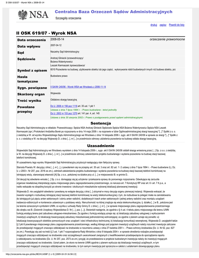 II OSK 619/07 - Wyrok NSA z 2008-05-14 Centralna Baza Orzeczeń Sądów Administracyjnych Szczegóły orzeczenia drukuj zapisz Powrót do listy II OSK 619/07 - Wyrok NSA Data orzeczenia 2008-05-14 Data wpływu 2007-04-12 Sąd Naczelny Sąd Administracyjny Sędziowie Andrzej Gliniecki /przewodniczący/ Bożena Walentynowicz Leszek Kiermaszek /sprawozdawca/ Symbol z opisem 6010 Pozwolenie na budowę, użytkowanie obiektu lub jego części, wykonywanie robót budowlanych innych niż budowa obiektu, prz Hasła tematyczne Budowlane prawo Sygn. powiązane II SA/Wr 240/06 - Wyrok WSA we Wrocławiu z 2006-11-14 Skarżony organ Wojewoda Treść wyniku Oddalono skargę kasacyjną Powołane przepisy Dz.U. 2006 nr 156 poz 1118 art. 35 ust. 1 pkt 1 orzeczenie prawomocne Ustawa z dnia 7 lipca 1994 r. - Prawo budowlane - tekst jednolity Dz.U. 2002 nr 153 poz 1270 art. 141 par. 4, art. 145 Ustawa z dnia 30 sierpnia 2002 r. Prawo o postępowaniu przed sądami administracyjnymi. Sentencja Naczelny Sąd Administracyjny w składzie: Przewodniczący: Sędzia NSA Andrzej Gliniecki Sędziowie Sędzia NSA Bożena Walentynowicz Sędzia NSA Leszek Kiermaszek (spr.) Protokolant Andżelika Borek po rozpoznaniu w dniu 14 maja 2008 r. na rozprawie w Izbie Ogólnoadministracyjnej skargi kasacyjnej "[...]" Spółki z o. o. z siedzibą w W. od wyroku Wojewódzkiego Sądu Administracyjnego we Wrocławiu z dnia 14 listopada 2006 r. sygn. akt II SA/Wr 240/06 w sprawie ze skargi "[...]" Spółki z o. o. z siedzibą w W. na decyzję Wojewody D. z dnia [...], nr [...] w przedmiocie odmowy udzielenia pozwolenia na budowę oddala skargę kasacyjną. Uzasadnienie Wojewódzki Sąd Administracyjny we Wrocławiu wyrokiem z dnia 14 listopada 2006 r., sygn. akt II SA/Wr 240/06 oddalił skargę wniesioną przez [...] Sp. z o.o. z siedzibą w W. na decyzję Wojewody D. z dnia [...], nr [...] w przedmiocie odmowy zatwierdzenia projektu budowlanego i wydania pozwolenia na budowę stacji bazowej telefonii komórkowej. W uzasadnieniu tego wyroku Wojewódzki Sąd Administracyjny przytoczył następujący stan faktyczny sprawy. Starosta Powiatu W. decyzją z dnia [...], nr [...], z powołaniem się na przepisy art. 35 ust. 3 oraz art. 82 ust. 1 i 2 ustawy z dnia 7 lipca 1994 r. - Prawo budowlane (t.j. Dz. U. z 2003 r. Nr 207, poz. 2016 ze zm.), odmówił zatwierdzenia projektu budowlanego i wydania pozwolenia na budowę stacji bazowej telefonii komórkowej na istniejącej wieży, stanowiącej własność [A] Sp. z o.o., położonej na działce przy ul. [...] w miejscowości B. w gminie D.. Od decyzji tej odwołanie wniosła [...] Sp. z o.o. domagając się jej uchylenia i przekazania sprawy do ponownego rozpoznania. Odwołująca się zarzuciła organowi niewłaściwą interpretację zapisu miejscowego planu zagospodarowania przestrzennego, co narusza art. 7 Konstytucji RP oraz art. 6 i art. 7 K.p.a., a nadto wskazała na obopólną korzyść po stronie inwestora i okolicznych mieszkańców wybranej lokalizacji planowanej inwestycji. Wojewoda D. nie uwzględnił odwołania i powołaną na wstępie decyzją z dnia [...] utrzymał w mocy decyzję organu pierwszej instancji. Wojewoda wskazał, że inwestor wystąpił o rozbudowę istniejącej stacji bazowej telefonii komórkowej na wieży telekomunikacyjnej z tym, że rozbudowa ta polegać miała na zainstalowaniu do istniejących już pięciu anten sektorowych i ośmiu anten radiolinii, dodatkowych trzech anten sektorowych i jednej anteny radiolinii oraz montażu urządzeń nadawczo-odbiorczych w kontenerze ustawionym u podstawy wieży. Nieruchomość na której znajduje się wieża telekomunikacyjna, tj. działka [...] w B., położona jest na terenie oznaczonym symbolem U/MN, co wynika z uchwały Rady Gminy D. z dnia [...], nr [...] w sprawie miejscowego planu zagospodarowania przestrzennego dla obrębu wsi B. (Dziennik Urzędowy Województwa D. Nr [...], poz. [...]). Stwierdził następnie, że zgodnie z § 4 ust. 4 tekstu planu miejscowego dla terenu U/MN funkcją wiodącą terenu jest zabudowa usługowo-mieszkaniowa. Za zgodne z funkcją wiodącą uznaje się: a) lokalizację zabudowy usługowej z wykluczeniem inwestycji uciążliwych, b) lokalizację towarzyszącej zabudowy mieszkaniowej jednorodzinnej wolnostojącej; za zgodne z planem uznaje się ponadto: a) lokalizację towarzyszących obiektów pomocniczych oraz urządzeń i sieci infrastruktury technicznej, b) lokalizację komunikacji wewnętrznej. Wojewoda D. uwzględnił także § 2 pkt 6 powołanego miejscowego planu zagospodarowania przestrzennego, według którego pod pojęciem inwestycji uciążliwych należy rozumieć inwestycje zaliczane do przedsięwzięć mogących znacząco oddziaływać na środowisko w rozumieniu ustawy z dnia 27 kwietnia 2001 r. - Prawo ochrony środowiska (Dz. U. Nr 62, poz. 627 ze zm.). Powołując się zaś na treść § 2 ust. 1 pkt 7 rozporządzenia Rady Ministrów z dnia 9 listopada 2004 r. w sprawie określenia rodzajów przedsięwzięć mogących znacząco oddziaływać na środowisko oraz szczegółowych uwarunkowań związanych z kwalifikowaniem przedsięwzięcia do sporządzenia raportu o oddziaływaniu na środowisko (Dz. U. Nr 257, poz. 2573 ze zm.) przyjął, że przedstawiona w projekcie budowlanym inwestycja należy do inwestycji mogących znacząco oddziaływać na środowisko. Uznał zatem, że skoro na terenie U/MN zgodnie z planem wyklucza się lokalizację inwestycji uciążliwych, w tym przedsięwzięć mogących znacząco oddziaływać na środowisko, to tym samym inwestycja jest sprzeczna w całości z ustaleniami obowiązującego planu http://orzeczenia.nsa.gov.pl/doc/8E2411A58F (1 z 4) [2009-10-19 16:58:13] II OSK 619/07 - Wyrok NSA z 2008-05-14 zagospodarowania przestrzennego. Plan miejscowy całkowicie neguje możliwość realizacji zamierzenia inwestycyjnego na działce nr [...] w B., co uniemożliwia określenie zmian projektu budowlanego, koniecznych do doprowadzenia tego 