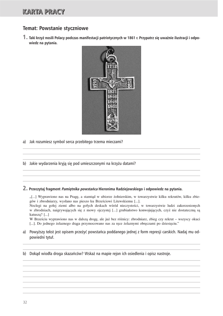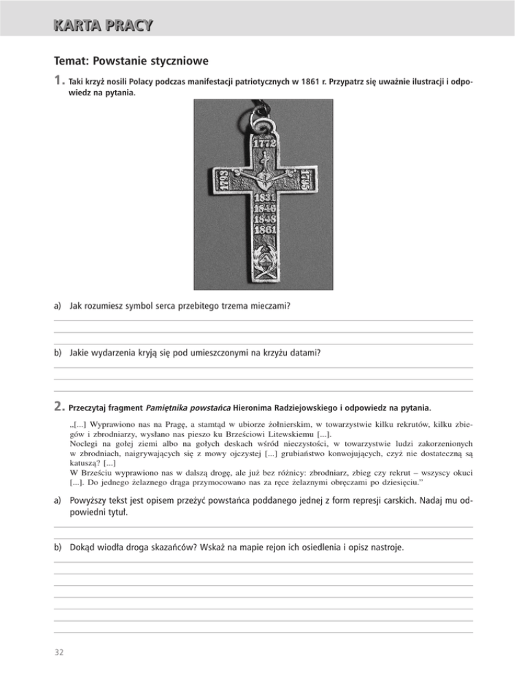 KARTA PRACY Temat: Powstanie styczniowe 1. Taki krzy˝ nosili Polacy podczas manifestacji patriotycznych w 1861 r. Przypatrz si´ uwa˝nie ilustracji i odpowiedz na pytania. a) Jak rozumiesz symbol serca przebitego trzema mieczami? b) Jakie wydarzenia kryjà si´ pod umieszczonymi na krzy˝u datami? 2. Przeczytaj fragment Pami´tnika powstaƒca Hieronima Radziejowskiego i odpowiedz na pytania. „[...] Wyprawiono nas na Pragę, a stamtąd w ubiorze żołnierskim, w towarzystwie kilku rekrutów, kilku zbiegów i zbrodniarzy, wysłano nas pieszo ku Brześciowi Litewskiemu [...]. Noclegi na gołej ziemi albo na gołych deskach wśród nieczystości, w towarzystwie ludzi zakorzenionych w zbrodniach, naigrywających się z mowy ojczystej [...] grubiaństwo konwojujących, czyż nie dostateczną są katuszą? [...] W Brześciu wyprawiono nas w dalszą drogę, ale już bez różnicy: zbrodniarz, zbieg czy rekrut – wszyscy okuci [...]. Do jednego żelaznego drąga przymocowano nas za ręce żelaznymi obręczami po dziesięciu.” a) Powy˝szy tekst jest opisem prze˝yç powstaƒca poddanego jednej z form represji carskich. Nadaj mu odpowiedni tytu∏. b) Dokàd wiod∏a droga skazaƒców? Wska˝ na mapie rejon ich osiedlenia i opisz nastroje. 32