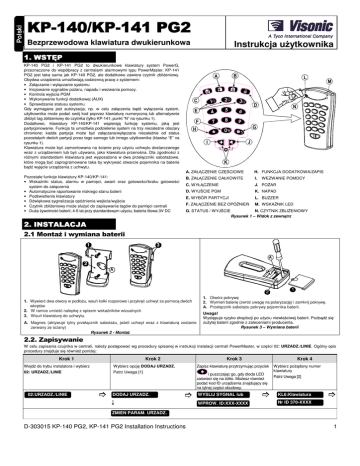Polski KPKP-140/KP 140/KP-141 PG2 Bezprzewodowa klawiatura dwukierunkowa Instrukcja użytkownika 1. WSTĘP KP-140 PG2 i KP-141 PG2 to dwukierunkowe klawiatury system PowerG, przeznaczone do współpracy z centralami alarmowymi typu PowerMaster. KP-141 PG2 jest taka sama jak KP-140 PG2, ale dodatkowo zawiera czytnik zbliżeniowy. Obydwa urządzenia umożliwiają codzienną pracę z systemem: • Załączanie i wyłączanie systemu • Inicjowanie sygnałów pożaru, napadu i wezwania pomocy. • Kontrola wyjścia PGM • Wykonywanie funkcji dodatkowej (AUX) • Sprawdzanie statusu systemu Gdy wymagana jest autoryzacja, np. w celu załączenia bądź wyłączenia system, użytkownika może podać swój kod poprzez klawiaturę numeryczną lub alternatywnie zbliżyć tag zbliżeniowy do czytnika (tylko KP-141; punkt “N” na rysunku 1). Dodatkowo, klawiatury KP-140/KP-141 wspierają funkcję systemu, jaką jest partycjonowanie. Funkcja ta umożliwia podzielenie system na trzy niezależne obszary chronione; każda partycja może być załączana/wyłączana niezależnie od status pozostałych dwóch partycji przez tego samego lub innego użytkownika (klawisz “E” na rysunku 1). Klawiatura może być zamontowana na ścianie przy użyciu uchwytu dostarczanego wraz z urządzeniem lub być używana, jako klawiatura przenośna. Dla zgodności z różnymi standardami klawiatura jest wyposażona w dwa przełączniki sabotażowe, które mogą być zaprogramowane taka by wykrywać otwarcie pojemnika na baterie bądź wyjęcie urządzenia z uchwytu. B A L M C D N E F G H J I K Pozostałe funkcje klawiatury KP-140/KP-141: • Wskaźniki status, alarmu w pamięci, awarii oraz gotowości/braku gotowości system do załączenia • Automatyczne raportowanie niskiego stanu baterii • Podświetlenie klawiatury • Dźwiękowa sygnalizacja opóźnienia wejścia/wyjścia • Czytnik zbliżeniowy może służyć do zapisywania tagów do pamięci centrali • Duża żywotność baterii; 4-5 lat przy standardowym użyciu, bateria litowa 3V DC A. ZAŁĄCZENIE CZĘŚCIOWE H. FUNKCJA DODATKOWA/ZAPIS B. ZAŁĄCZENIE CAŁKOWITE I. C. WYŁĄCZENIE J. POŻAR WEZWANIE POMOCY D. WYJŚCIE PGM K. NAPAD E. WYBÓR PARTYCJI L. BUZZER F. ZAŁĄCZENIE BEZ OPÓŹNIEŃ M. WSKAŹNIK LED G. STATUS / WYJŚCIE N. CZYTNIK ZBLIŻENIOWY Rysunek 1 – Widok z zewnątrz 2. INSTALACJA 2.1 Montaż i wymiana baterii 1 3 A 2 A 2 1. Wywierć dwa otwory w podłożu, wsuń kołki rozporowe i przykręć uchwyt za pomocą dwóch wkrętów 2. W ramce umieść nalepkę z opisem wskaźników wizualnych 3. Wsuń klawiaturę do uchwytu. A. Magnes (aktywuje tylny przełącznik sabotażu, jeżeli uchwyt wraz z klawiaturą zostanie zerwany ze ściany) Rysunek 2 - Montaż 1 1. Otwórz pokrywę 2. Wymień baterię (zwróć uwagę na polaryzację) i zamknij pokrywę. A. Przełącznik sabotażu pokrywy pojemnika baterii. Uwaga! Występuje ryzyko eksplozji po użyciu niewłaściwej baterii. Pozbądź się zużytej baterii zgodnie z zaleceniami producenta. Rysunek 3 – Wymiana baterii 2.2. Zapisywanie W celu zapisania czujnika w centrali, należy postępować wg procedury opisanej w instrukcji instalacji centrali PowerMaster, w części 02: URZADZ./LINIE. Ogólny opis procedury znajduje się również poniżej: Krok 1 Krok 2 Wejdź do trybu instalatora i wybierz 02: URZADZ./LINIE 02:URZADZ./LINIE Krok 3 Wybierz opcję DODAJ URZADZ. Patrz Uwaga [1] DODAJ URZADZ. Krok 4 Zapisz klawiaturę przytrzymując przycisk i puszczając go, gdy dioda LED zaświeci się na żółto. Możesz również podać kod ID urządzenia znajdujący się na tylnej części obudowy. WYSLIJ SYGNAL lub WPROW. ID:XXX-XXXX Wybierz pożądany numer klawiatury Patrz Uwaga [2] KL6:Klawiatura Nr ID 370-XXXX ZMIEN PARAM. URZADZ. D-303015 KP-140 PG2, KP-141 PG2 Installation Instructions 1 Krok 5 Krok 6 Określanie partycji Patrz Uwaga [3] Krok 7 Przypisz partycję do klawiatury wciskając klawisze , na klawiaturze centrali. KL6.PARTYCJA oznacza przesunięcie KL6:P1 P2 Przejdź do punktu 2.3 poniżej. i P3 K06.USTAWIENIA i wciśnięcie Uwagi: 1. Jeżeli klawiatura jest już zapisana możesz zmienić jej parametry i przypisać partycje poprzez opcję “ZMIEN PARAM. URZADZ.” – patrz krok 2 powyżej. 2. Pierwsze trzy cyfry kodu ID “370-XXXX” odnoszą się do klawiatur KP-140. Dla klawiatur KP-141 pierwsze trzy cyfry kodu to 371. 3. Opcja PARTYCJE pojawi się tylko, jeżeli w panelu została wcześniej uaktywniona funkcja partycjonowania (patrz rozdział PARTYCJE w instrukcji instalacji central PowerMaster). 2.3. Konfiguracja parametrów klawiatury Wejdź do menu USTAWIENIA i postępuj wg procedury opisanej w tabeli poniżej. OPCJA Konfiguracja W tym miejscu możesz określić, które przełączniki sabotażowe (tampery) będą aktywne. RODZAJ TAMPERA Możliwe opcje: wyłączone; ścienny+bateria; tylko bateria W tym miejscu można określić czy central będzie monitorowała sygnały nadzoru wysyłane przez klawiaturę (patrz uwaga poniżej). NADZOROWANIE Możliwe opcje: ZALACZONE lub WYLACZONE Uwaga: 1. Klawiatura co 5 minut przeprowadza test komunikacji z centralą (sygnał nadzoru;kontrola) aby sprawdzić jakość sygnału radiowego. Jeżeli przynajmniej raz w określonym czasie klawiatura nie wyśle sygnału nadzoru, zostanie wygenerowany alert o braku aktywności. Dlatego też, jeżeli planujesz wynosić klawiaturę z chronionego obszaru, należy wyłączyć sygnały nadzoru w celu uniknięcia alertu. W tym miejscu możesz określić czy klawiatura będzie wydawała lub nie, dźwięki odliczające czas opóźnienia na wejście/wyjście lub czy dźwięki te mają być wydawane tylko przy załączeniu całkowitym i pominięte przy załączeniu częściowym. DŹWIĘK ZAL/WYL Możliwe opcje: WYLACZONE; ZALACZONE i WYL @ ZAL. CZESC. KLAWISZ ( ) W tym miejscu możesz wybrać dodatkową funkcję przycisku . Wyboru można dokonać spośród 4 opcji: Status systemu: Naciśnięcie spowoduje 
