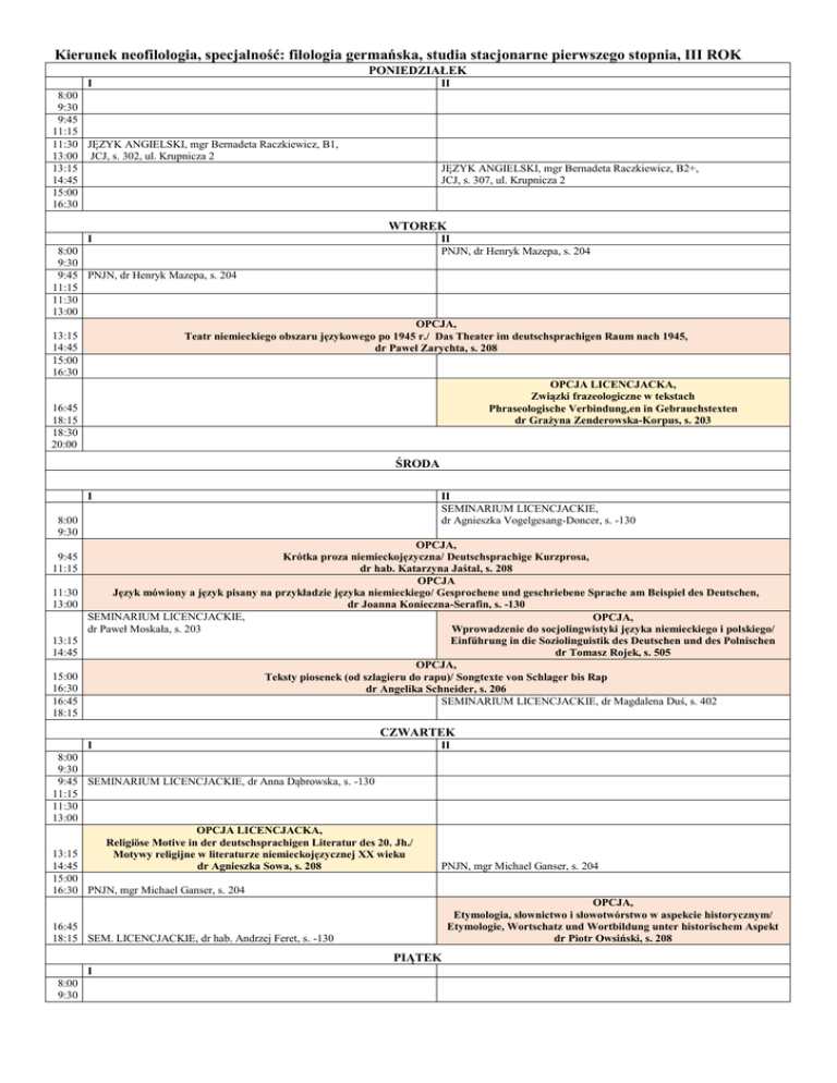 Kierunek neofilologia, specjalność: filologia germańska, studia stacjonarne pierwszego stopnia, III ROK PONIEDZIAŁEK I II 8:00 9:30 9:45 11:15 11:30 JĘZYK ANGIELSKI, mgr Bernadeta Raczkiewicz, B1, 13:00 JCJ, s. 302, ul. Krupnicza 2 13:15 14:45 15:00 16:30 JĘZYK ANGIELSKI, mgr Bernadeta Raczkiewicz, B2+, JCJ, s. 307, ul. Krupnicza 2 WTOREK I II PNJN, dr Henryk Mazepa, s. 204 8:00 9:30 9:45 PNJN, dr Henryk Mazepa, s. 204 11:15 11:30 13:00 OPCJA, Teatr niemieckiego obszaru językowego po 1945 r./ Das Theater im deutschsprachigen Raum nach 1945, dr Paweł Zarychta, s. 208 13:15 14:45 15:00 16:30 OPCJA LICENCJACKA, Związki frazeologiczne w tekstach Phraseologische Verbindung,en in Gebrauchstexten dr Grażyna Zenderowska-Korpus, s. 203 16:45 18:15 18:30 20:00 ŚRODA I II SEMINARIUM LICENCJACKIE, dr Agnieszka Vogelgesang-Doncer, s. -130 8:00 9:30 9:45 11:15 11:30 13:00 13:15 14:45 15:00 16:30 16:45 18:15 OPCJA, Krótka proza niemieckojęzyczna/ Deutschsprachige Kurzprosa, dr hab. Katarzyna Jaśtal, s. 208 OPCJA Język mówiony a język pisany na przykładzie języka niemieckiego/ Gesprochene und geschriebene Sprache am Beispiel des Deutschen, dr Joanna Konieczna-Serafin, s. -130 SEMINARIUM LICENCJACKIE, OPCJA, dr Paweł Moskała, s. 203 Wprowadzenie do socjolingwistyki języka niemieckiego i polskiego/ Einführung in die Soziolinguistik des Deutschen und des Polnischen dr Tomasz Rojek, s. 505 OPCJA, Teksty piosenek (od szlagieru do rapu)/ Songtexte von Schlager bis Rap dr Angelika Schneider, s. 206 SEMINARIUM LICENCJACKIE, dr Magdalena Duś, s. 402 CZWARTEK I II 8:00 9:30 9:45 SEMINARIUM LICENCJACKIE, dr Anna Dąbrowska, s. -130 11:15 11:30 13:00 OPCJA LICENCJACKA, Religiöse Motive in der deutschsprachigen Literatur des 20. Jh./ 13:15 Motywy religijne w literaturze niemieckojęzycznej XX wieku 14:45 dr Agnieszka Sowa, s. 208 15:00 16:30 PNJN, mgr Michael Ganser, s. 204 PNJN, mgr Michael Ganser, s. 204 OPCJA, Etymologia, słownictwo i słowotwórstwo w aspekcie historycznym/ Etymologie, Wortschatz und Wortbildung unter historischem Aspekt dr Piotr Owsiński, s. 208 16:45 18:15 SEM. LICENCJACKIE, dr hab. Andrzej Feret, s. -130 PIĄTEK I 8:00 9:30