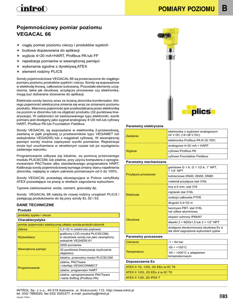 POMIARY POZIOMU B Pojemnościowy pomiar poziomu VEGACAL 66 ● ● ● ● ● ● ciąg ą ły pomiar poziomu cieczy i produktów sypkich budowa dopasowana do aplikacji wyjście 4÷20 mA+HART, Profibus PA lub FF rejestracja pomiarów w wewnętrznej pamięci wykonania zgodne z dyrektywą ATEX element rodziny PLICS Sondy pojemnościowe VEGACAL 66 są przeznaczone do ciągłego pomiaru poziomu produktów sypkich i cieczy. Sondy są wyposażone w elektrodę linową, całkowicie izolowaną. Pozostałe elementy urządzenia, takie jak obudowa, przyłącze procesowe czy elektronika, mogą być dobierane stosownie do aplikacji. Elektroda sondy tworzy wraz ze ścianą zbiornika kondensator, którego pojemność elektryczna zmienia się wraz ze zmianami poziomu produktu. Mierzona pojemność jest przekształcana przez elektronikę na poziom w zbiorniku lub na objętość produktu (32-punktowa linearyzacja). W zależności od zastosowanego typu elektroniki, wynik pomiaru jest dostępny jako sygnał analogowy 4÷20 mA lub cyfrowy HART, Profibus PA lub Foundation Fieldbus. Sondy VEGACAL są wyposażane w elektronikę 2-przewodową, zasilaną w pętli prądowej (z przetworników typu VEGAMET lub wskaźników VEGADIS) lub z magistrali cyfrowej. W wewnętrznej pamięci sondy można zapisywać wyniki pomiarów. Rejestracja może być uruchamiana w określonym czasie lub po wystąpieniu zadanego warunku. Programowanie odbywa się lokalnie, za pomocą przenośnego modułu PLICSCOM, lub zdalnie, przy użyciu komputera z oprogramowaniem PACTware albo standardowego programatora HART. Kalibracja sondy pojemnościowej wymaga zmiany stanu napełnienia zbiornika, najlepiej w całym zakresie pomiarowym od 0 do 100%. Parametry elektryczne Zasilanie elektronika Profibus PA 9÷32 VDC analogowe 4÷20 mA + HART Wyjście Parametry mechaniczne gwintowe G 1 A, G 1 1/2 A, 1” NPT, 1 1/2” NPT Przyłącze procesowe lina ø 6 mm, stal 316 ciężarek stal 316L Elektroda izolacja całkowita PTFE długość 0,4÷32 m DANE TECHNICZNE tworzywo PBT, stal 316L lub odlew aluminiowy Produkt produkty sypkie i ciecze stopień ochrony IP66/67 Obudowa Charakterystyka dławiki 2 × M20x1,5 lub 2 × 1/2” NPT pomiar pojemności elektrycznej układu sonda-produkt-zbiornik Zakres 0,2÷32 m (elektroda prętowa) Wyświetlacz graficzny LCD (moduł PLICSCOM), w obudowie sondy lub jako zewnętrzny wskaźnik VEGADIS 61 dostępna dwukomorowa obudowa Ex d dla stref zagrożenia wybuchem pyłów Parametry procesowe Ciśnienie 3200 pomiarów 32-punktowa linearyzacja (wyliczanie objętości) zdalne, PACTware i interfejs VEGACONNECT zdalne, programator HART zdalne, oprogramowanie PACTware i karta Softing (Profibus PA) -50 ÷ +200°C z adapterem temperaturowym Dopuszczenia Ex ATEX II 1G, 1/2G, 2G EEx ia IIC T6 ATEX II 1/2G, 2G EEx d ia IIC T6 ATEX II 1/2D, 2D IP6X T INTROL Sp. z o.o., 40-519 Katowice, ul. Ko ściusz ki 112, http://www.introl.pl tel. 032/ 7890020, fax 032/ 2053377, e-mail: [email protected] edycja 1/20 / 05 -1 ÷ 64 bar -50 ÷ +150°C Temperatura lokalne, przenośny moduł PLICSCOM Programowanie kołnierzowe DN40, DN50, DN80 materiał przyłącza stal 316L Typowe zastosowania: woda, cement, granulaty itp. Wewnętrzna pamięć cyfrowe Profibus PA cyfrowe Foundation Fieldbus Sondy VEGACAL posiadają obowiązujące w Polsce certyfikaty ATEX pozwalające na pracę w strefach zagrożenia wybuchem. Sondy VEGACAL 66 należą do nowej rodziny urządzeń PLICS i zastępują produkowane do tej pory sondy EL 52 i 53. elektronika z wyjściem analogowym 24 V DC (14÷36 V DC) B POMIARY POZIOMU WYMIARY Obudowa ze stali VEGACAL 66 z przyłączem gwintowym VEGACAL 66 z adapterem temperaturowym 22mm (2 1/4") G 1 A, G 11/2 A ø 40mm (1 37/64") ø8mm (5/16") 177mm (2 1/4") L Obudowa aluminiowa 73mm (2 7/8") 56 mm (2 1/4") Obudowa z tworzywa ø30 (1 3/16") SCHEMATY POŁĄCZEŃ POŁĄCZENIA DLA OBUDOWY JEDNOKOMOROWEJ – wersja Ex ia oraz nie-Ex 1. Gniazdo do podłączenia intefejsu VEGACONNECT (I2C) 2. Zaciski do podłączenia zewnętrznego wskaźnika VEGADIS 61 3. Zacisk „Uziemienie” do podłączenia ekranu kabla 4. Zaciski do podłączenia linii prądowej (4÷20 mA + zasilanie) B84 1. Podłączenie linii prądowej (4÷20 mA + zasilanie) INTROL Sp. z o.o., 40-519 Katowice, ul. Ko ściusz ki 112, http://www.introl.pl tel. 032/ 7890020, fax 032/ 2053377, e-mail: [email protected] edycja 1/2005 POMIARY POZIOMU POŁĄCZENIA DLA OBUDOWY DWUKOMOROWEJ Komora zasilania (boczna) – wersja Ex ia oraz nie-Ex 1. Gniazdo do podłączenia intefejsu VEGACONNECT (I2C) 2. Zacisk „Uziemienie” do podłączenia ekranu kabla 3. Zaciski do podłączenia linii prądowej (4÷20 mA + zasilanie) 1. Podłączenie linii prądowej (4÷20 mA + zasilanie) Komora elektroniki (górna) – wersja Ex ia, Ex d oraz nie-Ex 1 Display I2C 1 2 5 6 7 8 3 2 1. Gniazdo do podłączenia intefejsu VEGACONNECT (I2C) 2. Kabel wewnętrzny do komory zasilania ą wskaźnika VEGADIS 61 3. Zaciski do podłączenia Komora zasilania (boczna) – wersja Ex d 1. Zaciski do podłączenia linii zasilającej 2. Zacisk „Uziemienie” do podłączenia ekranu kabla 1. Podłączenie linii zasilające UWAGA! W wersji obudowy Ex d, moduł wyswietlania i programowania PLICSCOM może być używany tylko w komorze elektroniki (górnej). INTROL Sp. z o.o., 40-519 Katowice, ul. Ko ściusz ki 112, http://www.introl.pl tel. 032/ 7890020, fax 032/ 2053377, e-mail: [email protected] edycja 1/2005 B