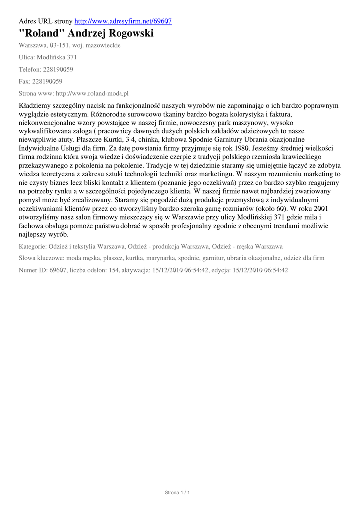 Adres URL strony http://www.adresyfirm.net/69607 "Roland" Andrzej Rogowski Warszawa, 03-151, woj. mazowieckie Ulica: Modlińska 371 Telefon: 228190059 Fax: 228190059 Strona www: http://www.roland-moda.pl Kładziemy szczególny nacisk na funkcjonalność naszych wyrobów nie zapominając o ich bardzo poprawnym wyglądzie estetycznym. Różnorodne surowcowo tkaniny bardzo bogata kolorystyka i faktura, niekonwencjonalne wzory powstające w naszej firmie, nowoczesny park maszynowy, wysoko wykwalifikowana załoga ( pracownicy dawnych dużych polskich zakładów odzieżowych to nasze niewątpliwie atuty. Płaszcze Kurtki, 3 4, chinka, klubowa Spodnie Garnitury Ubrania okazjonalne Indywidualne Usługi dla firm. Za datę powstania firmy przyjmuje się rok 1980. Jesteśmy średniej wielkości firma rodzinna która swoja wiedze i doświadczenie czerpie z tradycji polskiego rzemiosła krawieckiego przekazywanego z pokolenia na pokolenie. Tradycje w tej dziedzinie staramy się umiejętnie łączyć ze zdobyta wiedza teoretyczna z zakresu sztuki technologii techniki oraz marketingu. W naszym rozumieniu marketing to nie czysty biznes lecz bliski kontakt z klientem (poznanie jego oczekiwań) przez co bardzo szybko reagujemy na potrzeby rynku a w szczególności pojedynczego klienta. W naszej firmie nawet najbardziej zwariowany pomysł może być zrealizowany. Staramy się pogodzić dużą produkcje przemysłową z indywidualnymi oczekiwaniami klientów przez co stworzyliśmy bardzo szeroka gamę rozmiarów (około 60). W roku 2001 otworzyliśmy nasz salon firmowy mieszczący się w Warszawie przy ulicy Modlińskiej 371 gdzie mila i fachowa obsługa pomoże państwu dobrać w sposób profesjonalny zgodnie z obecnymi trendami możliwie najlepszy wyrób. Kategorie: Odzież i tekstylia Warszawa, Odzież - produkcja Warszawa, Odzież - męska Warszawa Słowa kluczowe: moda męska, płaszcz, kurtka, marynarka, spodnie, garnitur, ubrania okazjonalne, odzież dla firm Numer ID: 69607, liczba odsłon: 154, aktywacja: 15/12/2010 06:54:42, edycja: 15/12/2010 06:54:42 Strona 1 / 1