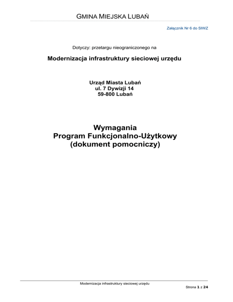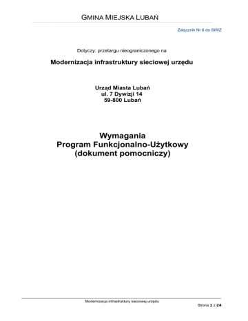 GMINA MIEJSKA LUBAŃ nowią __________________________________________________________________________________________________________________________________________________________________________________________________________________________________________________________________________________________________________________________________________________________________________________________________________________________________________________ Załącznik Nr 6 do SIWZ Dotyczy: przetargu nieograniczonego na Modernizacja infrastruktury sieciowej urzędu Urząd Miasta Lubań ul. 7 Dywizji 14 59-800 Lubań Wymagania Program Funkcjonalno-Użytkowy (dokument pomocniczy) Modernizacja infrastruktury sieciowej urzędu Strona 1 z 24 GMINA MIEJSKA LUBAŃ nowią __________________________________________________________________________________________________________________________________________________________________________________________________________________________________________________________________________________________________________________________________________________________________________________________________________________________________________________ Wymagania ogólne w zakresie projektowanej i budowanej infrastruktury sieciowej urzędu 1. W zakresie zaprojektowanie i wybudowanie infrastruktury dostępowej pomiędzy wskazanymi budynkami 1. 2. 3. 4. 5. 6. 7. 8. 9. 10. 11. 12. 13. Wybudowanie zewnętrznej infrastruktury sieciowej i dostępowej, w tym roboty budowlane związane z wybudowaniem połączenia światłowodowego oraz montażu urządzeń dostępowych na podstawie wskazań Zamawiającego w trybie „zaprojektuj-wybuduj” pomiędzy dwoma lokalizacjami Zamawiającego. Zamawiający przekaże Wykonawcy wymagane prawem pozwolenia/zgody na budowę i inwestycje zgodnie z w wymaganiami prawa jeśli takie będą wymagane w procesie inwestycyjnym Zamawiający wymaga aby zaprojektowana i wybudowana zewnętrzna sieć dostępowa pomiędzy budynkiem zlokalizowanym przy ul. 7 Dywizji 14 a ul. Mickiewicza była oparta na światłowodzie o wielkości wiązki wskazanej przez oferenta z zachowaniem rezerwy na rozbudowę lub działania awaryjne którą określa bezpośrednio Wykonawca Zaprojektowana i wybudowana zewnętrzna sieć dostępowa pomiędzy budynkiem zlokalizowanym przy ul. 7 Dywizji 14 a ul. Mickiewicza była oparta na światłowodzie który docelowo będzie dzierżawiony od wykonawcy , który zrealizuje połączenie budynków jako operator telekomunikacyjny działający na podstawie wpisu do Rejestru Przedsiębiorców Telekomunikacyjnych prowadzonego przez Urząd Komunikacji Elektronicznej Wymagane jest aby Operator Telekomunikacyjny (Wykonawca) realizował w okres 12 miesięcy od daty zakończenia realizacji umowy usługę dzierżawy łącza i dostawy Internetu synchronicznego o minimalnej szybkości 40 Mb40Mb. Wszelkie roboty remontowo-budowlane niezbędne do realizacji projektu muszą być zgodne z dołączonymi do SIWZ dokumentami elektrycznymi, budowlanymi, specyfikacjami technicznymi wykonania i odbioru robót instalacyjnych na podstawie których oferent przygotuje do akceptacji dokumentacje projektowo-wykonawczą. Zakres prac remontowo-budowlanych opisują pliki załączone do ogłoszenia jako podstawa do przygotowania wyceny oraz dostarczonej do zatwierdzenia po podpisaniu umowy do 21 dni dokumentacji projektowo-wykonawczej zgodnie z procedurą i wymagania trybu „zaprojektujwybuduj” jako wymagane prawem projekty budowlano-inwestorskie niezbędne w zakresie realizowanej inwestycji do akceptacji przez Zamawiającego. Zamawiający informuje iż w zakresie połączenia budynków nie dysponuje żadna własną infrastrukturą czy też podbudową a tym samym nie determinuje trasy przebiegu wymaganego okablowania. Uzyskanie powyższej akceptacji jest warunkiem przekazania placu budowy Wykonawcy celem rozpoczęcia prac montażowych. Minimalny okres wymaganej gwarancji na dostarczony sprzęt i wykonane prace to 36 m-ce. Prace budowlane, modernizacyjne, adaptacyjne są rozliczane jako wynagrodzenie ryczałtowe zgodnie z wymaganiami opisanymi w zaakceptowanej dokumentacji. Wybudowane połączenie zewnętrzne musi być w pełni uruchomione, skonfigurowane i zakończone odpowiednimi jakościowo i wydajnościowo urządzeniami i wpięte do sieci wewnętrznych LAN w obu budynkach tak aby zapewniały pełną komunikację , dostęp do Internetu i przepływ danych z systemów informatycznych urzędu. Wybudowana wewnętrzna sieć musi być w pełni uruchomiona, skonfigurowana i zakończone odpowiednimi jakościowo i wydajnościowo urządzeniami i wpięta do sieci zewnętrznej jak i Modernizacja infrastruktury sieciowej urzędu Strona 2 z 24 GMINA MIEJSKA LUBAŃ nowią __________________________________________________________________________________________________________________________________________________________________________________________________________________________________________________________________________________________________________________________________________________________________________________________________________________________________________________ wewnętrznej LAN w obu budynkach tak aby zapewniać pełną komunikację , dostęp do Internetu i przepływ danych z systemów informatycznych urzędu poprzez dostarczenie odpowiedniej ilości media-konwerterów dla urządzeń peryferyjnych urzędu i pozostałych stacji roboczych oraz/lub odpowiednich kart/wkładek sieciowych. 14. W ramach odbioru Wykonawca przedstawi dokumentację powykonawczą wraz z mapkami, odpowiednimi pomiarami , odbiorami technologiczno-prawnymi. 15. Wykonawca do 21 dni od daty podpisania umowy przekaże Zamawiającemu do uzgodnienia i zatwierdzenia projekt realizacyjny. W zakresie modernizacji i zaprojektowania, wybudowanie infrastruktury LAN, zasilania dedykowanego 230V oraz sieci zasilającej 230V 2. Wybudowanie wewnętrznej infrastruktury