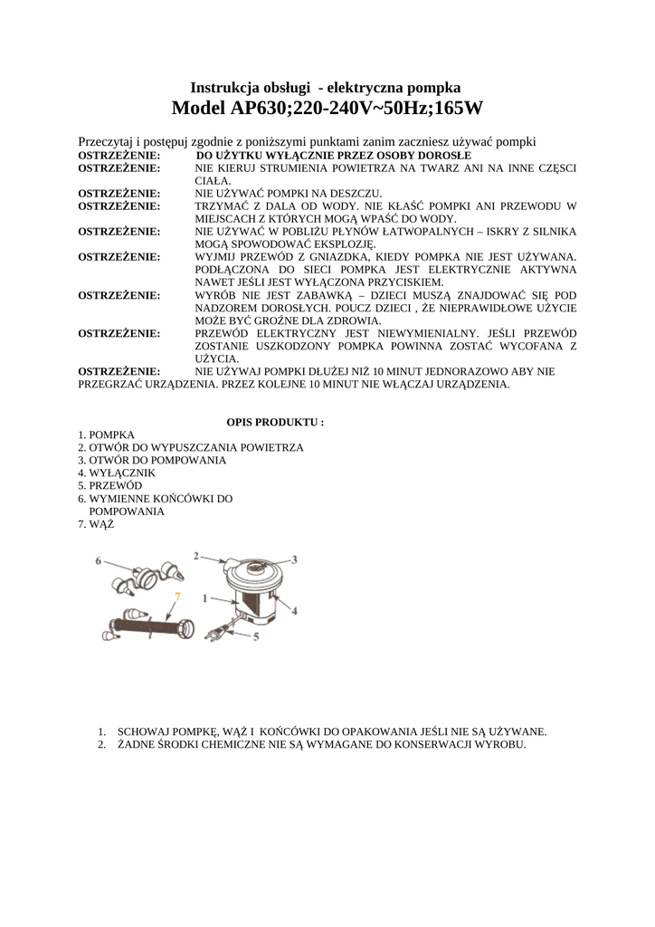 Instrukcja obsługi - elektryczna pompka Model AP630;220-240V~50Hz;165W Przeczytaj i postępuj zgodnie z poniższymi punktami zanim zaczniesz używać pompki OSTRZEŻENIE: OSTRZEŻENIE: DO UŻYTKU WYŁĄCZNIE PRZEZ OSOBY DOROSŁE NIE KIERUJ STRUMIENIA POWIETRZA NA TWARZ ANI NA INNE CZĘSCI CIAŁA. OSTRZEŻENIE: NIE UŻYWAĆ POMPKI NA DESZCZU. OSTRZEŻENIE: TRZYMAĆ Z DALA OD WODY. NIE KŁAŚĆ POMPKI ANI PRZEWODU W MIEJSCACH Z KTÓRYCH MOGĄ WPAŚĆ DO WODY. OSTRZEŻENIE: NIE UŻYWAĆ W POBLIŻU PŁYNÓW ŁATWOPALNYCH – ISKRY Z SILNIKA MOGĄ SPOWODOWAĆ EKSPLOZJĘ. OSTRZEŻENIE: WYJMIJ PRZEWÓD Z GNIAZDKA, KIEDY POMPKA NIE JEST UŻYWANA. PODŁĄCZONA DO SIECI POMPKA JEST ELEKTRYCZNIE AKTYWNA NAWET JEŚLI JEST WYŁĄCZONA PRZYCISKIEM. OSTRZEŻENIE: WYRÓB NIE JEST ZABAWKĄ – DZIECI MUSZĄ ZNAJDOWAĆ SIĘ POD NADZOREM DOROSŁYCH. POUCZ DZIECI , ŻE NIEPRAWIDŁOWE UŻYCIE MOŻE BYĆ GROŹNE DLA ZDROWIA. OSTRZEŻENIE: PRZEWÓD ELEKTRYCZNY JEST NIEWYMIENIALNY. JEŚLI PRZEWÓD ZOSTANIE USZKODZONY POMPKA POWINNA ZOSTAĆ WYCOFANA Z UŻYCIA. OSTRZEŻENIE: NIE UŻYWAJ POMPKI DŁUŻEJ NIŻ 10 MINUT JEDNORAZOWO ABY NIE PRZEGRZAĆ URZĄDZENIA. PRZEZ KOLEJNE 10 MINUT NIE WŁĄCZAJ URZĄDZENIA. OPIS PRODUKTU : 1. POMPKA 2. OTWÓR DO WYPUSZCZANIA POWIETRZA 3. OTWÓR DO POMPOWANIA 4. WYŁĄCZNIK 5. PRZEWÓD 6. WYMIENNE KOŃCÓWKI DO POMPOWANIA 7. WĄŻ 1. 2. SCHOWAJ POMPKĘ, WĄŻ I KOŃCÓWKI DO OPAKOWANIA JEŚLI NIE SĄ UŻYWANE. ŻADNE ŚRODKI CHEMICZNE NIE SĄ WYMAGANE DO KONSERWACJI WYROBU. OBSŁUGA POMPOWANIE 1. JEŚLI TO KONIECZNE DOŁĄCZ ODPOWIEDNIĄ KOŃCÓWKĘ LUB WĄŻ DO OTWORU DO POMPOWANIA I PRZYŁÓŻ POMPKĘ DO ZAWORU POMPOWANEGO ARTYKUŁU. PATRZ RYS. 1 UWAGA: PRZY WIĘKSZYCH ARTYKUŁACH JAK PONTONY CZY ŁÓŻKA PRZYŁÓŻ POMPKĘ BEZ KOŃCÓWKI BEZPOŚREDNIO DO ZAWORU. KOŃCÓWEK UŻYWAJ DO POMPOWANIA MAŁYCH PRZEDMIOTÓW JAK MATERACE CZY ZABAWKI PLAŻOWE ITP. 2. WŁÓŻ KOŃCÓWKĘ PRZEWODU DO GNIAZDKA .PATRZ RYS.2. 3. WŁĄCZANIE : NACIŚNIJ „I” WYŁĄCZANIE :WCIŚNIJ”0”.PATRZ RYS.3. WYPUSZCZANIE POWIETRZA 1. JEŚLI TO KONIECZNE DOŁĄCZ ODPOWIEDNIĄ KOŃCÓWKĘ LUB WĄŻ DO OTWORU DO WYPUSZCZANIA POWIETRZA I PRZYŁÓŻ POMPKĘ DO ZAWORU ARTYKUŁU, Z KTÓREGO CHCESZ SPUŚCIĆ POWIETRZE. PATRZ RYS. 4 UWAGA: PRZY WIĘKSZYCH ARTYKUŁACH JAK PONTONY CZY ŁÓŻKA PRZYŁÓŻ POMPKĘ BEZ KOŃCÓWKI BEZPOŚREDNIO DO ZAWORU. KOŃCÓWEK UŻYWAJ DO POMPOWANIA MAŁYCH PRZEDMIOTÓW JAK MATERACE CZY ZABAWKI PLAŻOWE ITP. 2. WŁOŻ KOŃCÓWKĘ PRZEWODU ZASILAJĄCEGO DO GNIAZDKA.PATRZ RYS.2. 3. WŁĄCZANIE : NACIŚNIJ „I” WYŁĄCZANIE :WCIŚNIJ”0”.PATRZ RYS.3. ZACHOWAJ NINIEJSZĄ INSTRUKCJĘ Zakaz umieszczania zużytego sprzętu łącznie z innymi odpadami. Symbol "przekreślony kosz" wskazuje na selektywne zbieranie sprzętu elektrycznego i elektronicznego. Użytkownik jest zobowiązany do oddania wyrobu wycofanego z eksploatacji do punktu zbierania zużytego sprzętu. Zapobiegnie to negatywnym skutkom dla środowiska i zdrowia ludzi wynikającym z obecności składników niebezpiecznych w sprzęcie.