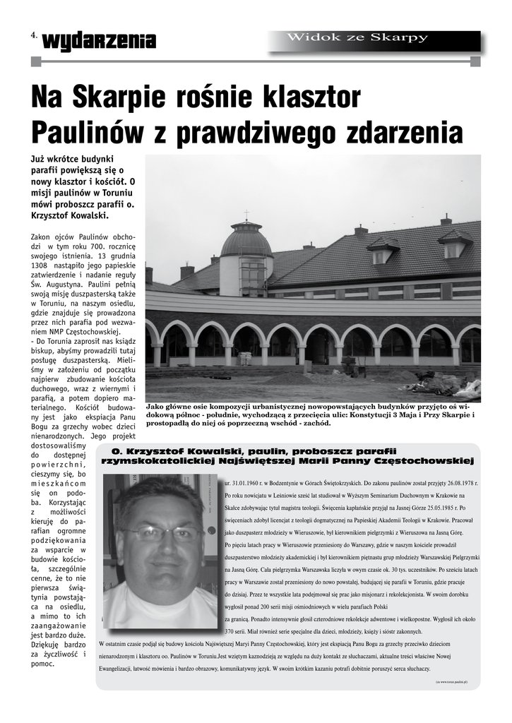 wydarzenia Widok ze Skarpy Na Skarpie rośnie klasztor Paulinów z prawdziwego zdarzenia Już wkrótce budynki parafii powiększą się o nowy klasztor i kościół. O misji paulinów w Toruniu mówi proboszcz parafii o. Krzysztof Kowalski. Zakon ojców Paulinów obchodzi w tym roku 700. rocznicę swojego istnienia. 13 grudnia 1308 nastąpiło jego papieskie zatwierdzenie i nadanie reguły Św. Augustyna. Paulini pełnią swoją misję duszpasterską także w Toruniu, na naszym osiedlu, gdzie znajduje się prowadzona przez nich parafia pod wezwaniem NMP Częstochowskiej. - Do Torunia zaprosił nas ksiądz biskup, abyśmy prowadzili tutaj posługę duszpasterską. Mieliśmy w założeniu od początku najpierw zbudowanie kościoła duchowego, wraz z wiernymi i parafią, a potem dopiero materialnego. Kościół budowa- Jako główne osie kompozycji urbanistycznej nowopowstających budynków przyjęto oś winy jest jako ekspiacja Panu dokową północ - południe, wychodzącą z przecięcia ulic: Konstytucji 3 Maja i Przy Skarpie i Bogu za grzechy wobec dzieci prostopadłą do niej oś poprzeczną wschód - zachód. nienarodzonych. Jego projekt dostosowaliśmy O. Krzysztof Kowalski, paulin, proboszcz parafii do dostępnej rzymskokatolickiej Najświętszej Marii Panny Częstochowskiej powierzchni, cieszymy się, bo mieszkańcom się on podoba. Korzystając z możliwości kieruję do parafian ogromne podziękowania za wsparcie w budowie kościoła, szczególnie cenne, że to nie pierwsza świątynia powstająca na osiedlu, a mimo to ich zaangażowanie jest bardzo duże. Dziękuję bardzo za życzliwość i pomoc. ur. 31.01.1960 r. w Bodzentynie w Górach Świętokrzyskich. Do zakonu paulinów został przyjęty 26.08.1978 r. Po roku nowicjatu w Leśniowie sześć lat studiował w Wyższym Seminarium Duchownym w Krakowie na Skałce zdobywając tytuł magistra teologii. Święcenia kapłańskie przyjął na Jasnej Górze 25.05.1985 r. Po święceniach zdobył licencjat z teologii dogmatycznej na Papieskiej Akademii Teologii w Krakowie. Pracował jako duszpasterz młodzieży w Wieruszowie, był kierownikiem pielgrzymki z Wieruszowa na Jasną Górę. Po pięciu latach pracy w Wieruszowie przeniesiony do Warszawy, gdzie w naszym kościele prowadził duszpasterstwo młodzieży akademickiej i był kierownikiem piętnastu grup młodzieży Warszawskiej Pielgrzymki na Jasną Górę. Cała pielgrzymka Warszawska liczyła w owym czasie ok. 30 tys. uczestników. Po sześciu latach pracy w Warszawie został przeniesiony do nowo powstałej, budującej się parafii w Toruniu, gdzie pracuje do dzisiaj. Przez te wszystkie lata podejmował się prac jako misjonarz i rekolekcjonista. W swoim dorobku wygłosił ponad 200 serii misji ośmiodniowych w wielu parafiach Polski i za granicą. Ponadto intensywnie głosił czterodniowe rekolekcje adwentowe i wielkopostne. Wygłosił ich około 370 serii. Miał również serie specjalne dla dzieci, młodzieży, księży i sióstr zakonnych. W ostatnim czasie podjął się budowy kościoła Najświętszej Maryi Panny Częstochowskiej, który jest ekspiacją Panu Bogu za grzechy przeciwko dzieciom nienarodzonym i klasztoru oo. Paulinów w Toruniu.Jest wziętym kaznodzieją ze względu na duży kontakt ze słuchaczami, aktualne treści właściwe Nowej Ewangelizacji, łatwość mówienia i bardzo obrazowy, komunikatywny język. W swoim krótkim kazaniu potrafi dobitnie poruszyć serca słuchaczy. (za www.torun.paulini.pl)