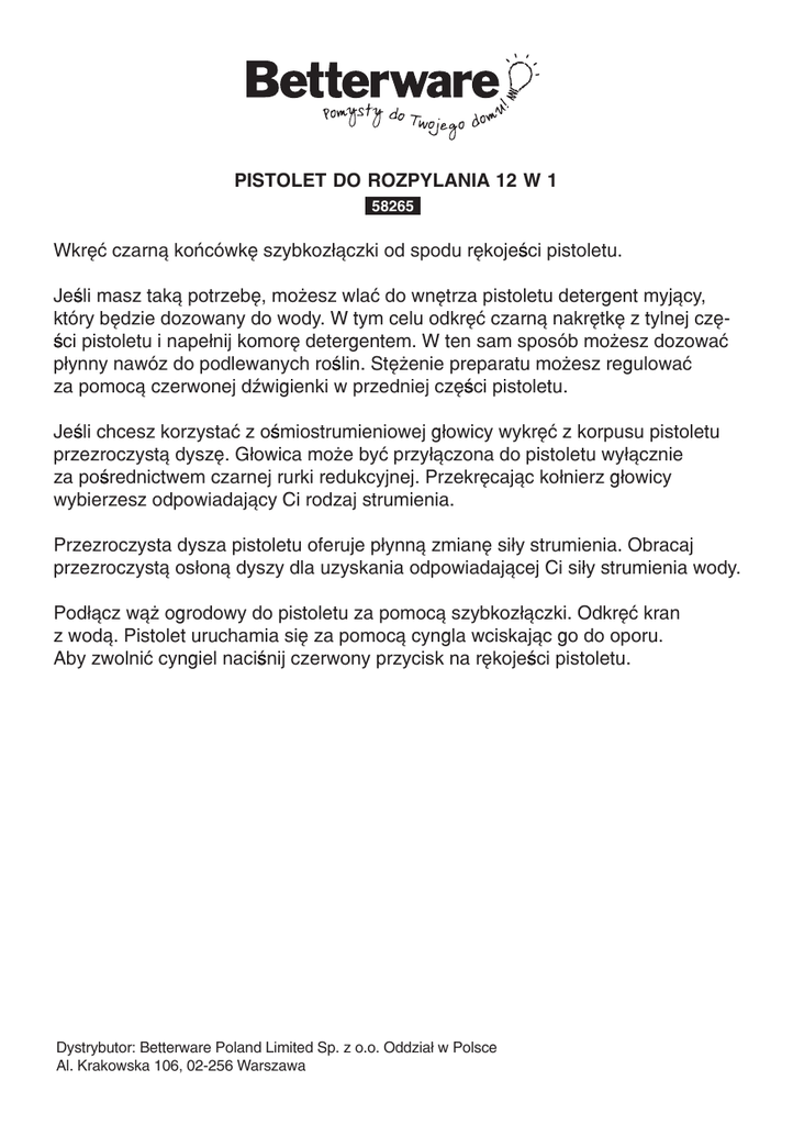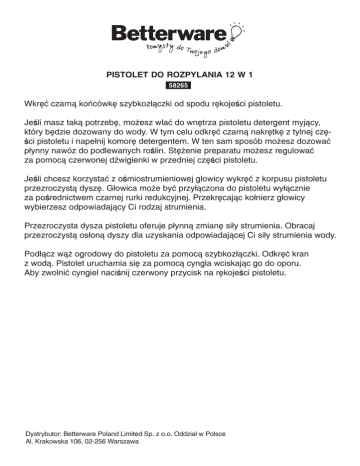 Pistolet do rozpylania 12 w 1 58265 Wkręć czarną końcówkę szybkozłączki od spodu rękojeści pistoletu. Jeśli masz taką potrzebę, możesz wlać do wnętrza pistoletu detergent myjący, który będzie dozowany do wody. W tym celu odkręć czarną nakrętkę z tylnej części pistoletu i napełnij komorę detergentem. W ten sam sposób możesz dozować płynny nawóz do podlewanych roślin. Stężenie preparatu możesz regulować za pomocą czerwonej dźwigienki w przedniej części pistoletu. Jeśli chcesz korzystać z ośmiostrumieniowej głowicy wykręć z korpusu pistoletu przezroczystą dyszę. Głowica może być przyłączona do pistoletu wyłącznie za pośrednictwem czarnej rurki redukcyjnej. Przekręcając kołnierz głowicy wybierzesz odpowiadający Ci rodzaj strumienia. Przezroczysta dysza pistoletu oferuje płynną zmianę siły strumienia. Obracaj przezroczystą osłoną dyszy dla uzyskania odpowiadającej Ci siły strumienia wody. Podłącz wąż ogrodowy do pistoletu za pomocą szybkozłączki. Odkręć kran z wodą. Pistolet uruchamia się za pomocą cyngla wciskając go do oporu. Aby zwolnić cyngiel naciśnij czerwony przycisk na rękojeści pistoletu. Dystrybutor: Betterware Poland Limited Sp. z o.o. Oddział w Polsce Al. Krakowska 106, 02-256 Warszawa