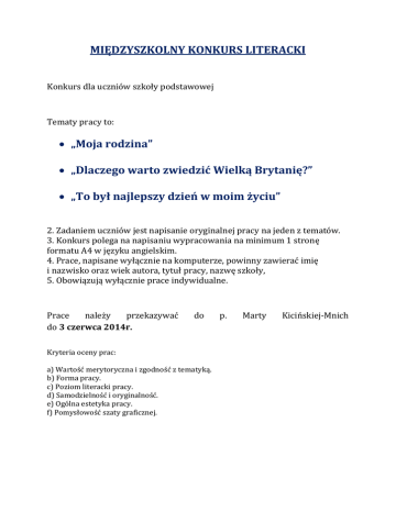 MIĘDZYSZKOLNY KONKURS LITERACKI Konkurs dla uczniów szkoły podstawowej Tematy pracy to: „Moja rodzina” „Dlaczego warto zwiedzić Wielką Brytanię?” „To był najlepszy dzień w moim życiu” 2. Zadaniem uczniów jest napisanie oryginalnej pracy na jeden z tematów. 3. Konkurs polega na napisaniu wypracowania na minimum 1 stronę formatu A4 w języku angielskim. 4. Prace, napisane wyłącznie na komputerze, powinny zawierać imię i nazwisko oraz wiek autora, tytuł pracy, nazwę szkoły, 5. Obowiązują wyłącznie prace indywidualne. Prace należy przekazywać do 3 czerwca 2014r. do Kryteria oceny prac: a) Wartość merytoryczna i zgodność z tematyką. b) Forma pracy. c) Poziom literacki pracy. d) Samodzielność i oryginalność. e) Ogólna estetyka pracy. f) Pomysłowość szaty graficznej. p. Marty Kicińskiej-Mnich