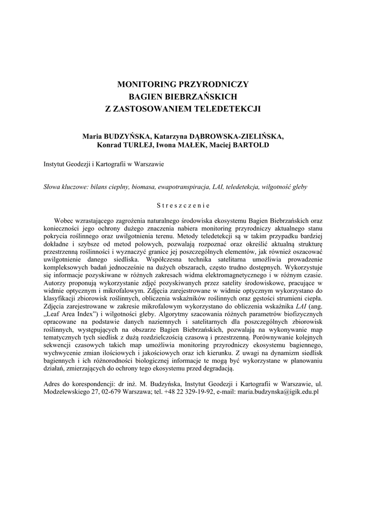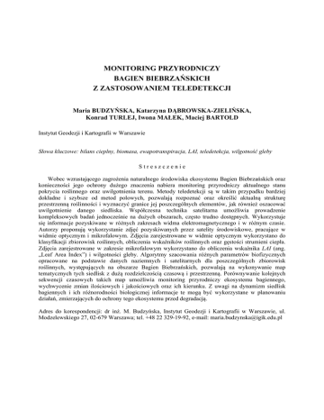 MONITORING PRZYRODNICZY BAGIEN BIEBRZAŃSKICH Z ZASTOSOWANIEM TELEDETEKCJI Maria BUDZYŃSKA, Katarzyna DĄBROWSKA-ZIELIŃSKA, Konrad TURLEJ, Iwona MAŁEK, Maciej BARTOLD Instytut Geodezji i Kartografii w Warszawie Słowa kluczowe: bilans cieplny, biomasa, ewapotranspiracja, LAI, teledetekcja, wilgotność gleby Streszczenie Wobec wzrastającego zagrożenia naturalnego środowiska ekosystemu Bagien Biebrzańskich oraz konieczności jego ochrony dużego znaczenia nabiera monitoring przyrodniczy aktualnego stanu pokrycia roślinnego oraz uwilgotnienia terenu. Metody teledetekcji są w takim przypadku bardziej dokładne i szybsze od metod polowych, pozwalają rozpoznać oraz określić aktualną strukturę przestrzenną roślinności i wyznaczyć granice jej poszczególnych elementów, jak również oszacować uwilgotnienie danego siedliska. Współczesna technika satelitarna umożliwia prowadzenie kompleksowych badań jednocześnie na dużych obszarach, często trudno dostępnych. Wykorzystuje się informacje pozyskiwane w różnych zakresach widma elektromagnetycznego i w różnym czasie. Autorzy proponują wykorzystanie zdjęć pozyskiwanych przez satelity środowiskowe, pracujące w widmie optycznym i mikrofalowym. Zdjęcia zarejestrowane w widmie optycznym wykorzystano do klasyfikacji zbiorowisk roślinnych, obliczenia wskaźników roślinnych oraz gęstości strumieni ciepła. Zdjęcia zarejestrowane w zakresie mikrofalowym wykorzystano do obliczenia wskaźnika LAI (ang. „Leaf Area Index”) i wilgotności gleby. Algorytmy szacowania różnych parametrów biofizycznych opracowane na podstawie danych naziemnych i satelitarnych dla poszczególnych zbiorowisk roślinnych, występujących na obszarze Bagien Biebrzańskich, pozwalają na wykonywanie map tematycznych tych siedlisk z dużą rozdzielczością czasową i przestrzenną. Porównywanie kolejnych sekwencji czasowych takich map umożliwia monitoring przyrodniczy ekosystemu bagiennego, wychwycenie zmian ilościowych i jakościowych oraz ich kierunku. Z uwagi na dynamizm siedlisk bagiennych i ich różnorodności biologicznej informacje te mogą być wykorzystane w planowaniu działań, zmierzających do ochrony tego ekosystemu przed degradacją. Adres do korespondencji: dr inż. M. Budzyńska, Instytut Geodezji i Kartografii w Warszawie, ul. Modzelewskiego 27, 02-679 Warszawa; tel. +48 22 329-19-92, e-mail: [email protected] Maria BUDZYŃSKA, Katarzyna DĄBROWSKA-ZIELIŃSKA, Konrad TURLEJ, Iwona MAŁEK, Maciej BARTOLD MONITORING OF THE BIEBRZA WETLANDS USING REMOTE SENSING METHODS Key words: biomass, evapotranspiration, heat budget equation, LAI, remote sensing, soil moisture Summary This study was carried out in the Biebrza Valley, a NATURA 2000 and Ramsar Convention site situated in Northeast Poland. This paper presents monitoring and mapping of various soil-vegetation variables using optical and microwave satellite data. Satellite data used in the study included: ENVISAT ASAR and MERIS; ALOS PALSAR, AVNIR-2, and PRISM; NOAA.AVHRR; Terra ASTER and MODIS; Landsat ETM+. Optical images were used for classification of wetland communities and calculation of vegetation indices. Latent Heat Flux (LE) was estimated from NOAA. AVHRR and meteorological data and soil moisture index was calculated as the ratio of Sensible Heat Flux (H) to LE. Parallel to satellite observations the soil-vegetation variables were measured at the test site. Data from optical and microwave satellite images and soil-vegetation field measurements were analysed to develop methods for the Leaf Area Index (LAI), biomass, and soil moisture assessment over wetlands. Monitoring and mapping of various soil-vegetation variables is very important part of better management and protection of wetland areas. Presented results allow for monitoring and mapping soil-vegetation parameters of wetlands and their changes over time. The methodology developed is suitable for applications in the system of wetland monitoring in Europe. The studied areas can be perceived as a reference for other wetlands.
