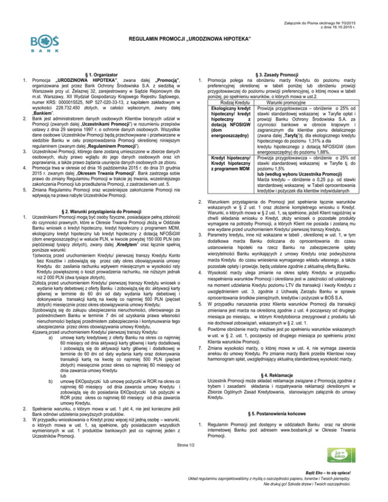 Załącznik do Pisma okólnego Nr 70/2015 z dnia 16.10.2015 r. REGULAMIN PROMOCJI „URODZINOWA HIPOTEKA” 1. 2. 3. 4. 5. § 1. Organizator Promocja „URODZINOWA HIPOTEKA”, zwana dalej „Promocją”, organizowana jest przez Bank Ochrony Środowiska S.A. z siedzibą w Warszawie przy ul. Żelaznej 32, zarejestrowany w Sądzie Rejonowym dla m.st. Warszawy, XII Wydział Gospodarczy Krajowego Rejestru Sądowego, numer KRS: 0000015525, NIP 527-020-33-13, z kapitałem zakładowym w wysokości 228.732.450 złotych, w całości wpłaconym, zwany dalej „Bankiem”. Bank jest administratorem danych osobowych Klientów biorących udział w Promocji (zwanych dalej „Uczestnikami Promocji”) w rozumieniu przepisów ustawy z dnia 29 sierpnia 1997 r. o ochronie danych osobowych. Wszystkie dane osobowe Uczestników Promocji będą przechowywane i przetwarzane w siedzibie Banku w celu przeprowadzenia Promocji określonej niniejszym regulaminem (zwanym dalej „Regulaminem Promocji”). Uczestnikowi Promocji, którego dane zostaną umieszczone w zbiorze danych osobowych, służy prawo wglądu do jego danych osobowych oraz ich poprawiania, a także prawo żądania usunięcia danych osobowych ze zbioru. Promocja trwa w okresie od dnia 16 października 2015 r. do dnia 31 grudnia 2015 r. zwanym dalej „Okresem Trwania Promocji”. Bank zastrzega sobie prawo do zmiany Regulaminu Promocji w trakcie jej trwania, wcześniejszego zakończenia Promocji lub przedłużenia Promocji, z zastrzeżeniem ust. 5. Zmiana Regulaminu Promocji oraz wcześniejsze zakończenie Promocji nie wpływają na prawa nabyte Uczestników Promocji. 1. 2. 1. 2. 3. § 2. Warunki przystąpienia do Promocji Uczestnikami Promocji mogą być osoby fizyczne, posiadające pełną zdolność do czynności prawnych, które w Okresie Trwania Promocji złożą w Oddziale Banku wniosek o kredyt hipoteczny, kredyt hipoteczny z programem MDM, ekologiczny kredyt hipoteczny lub kredyt hipoteczny z dotacją NFOŚiGW (dom energooszczędny) w walucie PLN, w kwocie powyżej 150 000 PLN (sto pięćdziesiąt tysięcy złotych), zwany dalej „Kredytem” oraz łącznie spełnią poniższe warunki: 1)otworzą przed uruchomieniem Kredytu/ pierwszej transzy Kredytu Konto bez Kosztów i zobowiążą się przez cały okres obowiązywania umowy Kredytu do: zasilania rachunku wpływem miesięcznym w wysokości raty Kredytu powiększonej o koszt prowadzenia rachunku, nie niższym jednak niż 2 000 PLN (dwa tysiące złotych), 2)złożą przed uruchomieniem Kredytu/ pierwszej transzy Kredytu wniosek o wydanie karty debetowej z oferty Banku i zobowiążą się do: aktywacji karty głównej w terminie do 60 dni od daty wydania karty debetowej i dokonywania transakcji kartą na kwotę co najmniej 500 PLN (pięćset złotych) miesięcznie przez okres obowiązywania umowy Kredytu; 3)zobowiążą się do zakupu ubezpieczenia nieruchomości, oferowanego za pośrednictwem Banku w terminie 7 dni od uzyskania prawa własności nieruchomości będącej przedmiotem zabezpieczenia i kontynuowania tego ubezpieczenia przez okres obowiązywania umowy Kredytu, 4)zawrą przed uruchomieniem Kredytu/ pierwszej transzy Kredytu: a) umowę karty kredytowej z oferty Banku na okres co najmniej 60 miesięcy od dnia aktywacji karty głównej i karty dodatkowej i zobowiążą się do aktywacji karty głównej i dodatkowej w terminie do 60 dni od daty wydania karty oraz dokonywania transakcji kartą na kwotę co najmniej 500 PLN (pięćset złotych) miesięcznie przez okres co najmniej 60 miesięcy od dnia zawarcia umowy Kredytu lub b) umowę EKOpożyczki lub umowę pożyczki w ROR na okres co najmniej 60 miesięcy od dnia zawarcia umowy Kredytu i zobowiążą się do posiadania EKOpożyczki lub pożyczki w ROR przez okres co najmniej 60 miesięcy od dnia zawarcia umowy Kredytu. Spełnienie warunku, o którym mowa w ust. 1 pkt 4, nie jest konieczne jeśli Bank odmówi udzielenia powyższych produktów. W przypadku wnioskowania o Kredyt przez więcej niż jedną osobę – warunki, o których mowa w ust. 1, są spełnione, gdy posiadaczem wszystkich wymienionych w ust. 1 produktów bankowych jest co najmniej jeden z Uczestników Promocji. 3. 4. 5. 6. 7. § 3. Zasady Promocji Promocja polega na obniżeniu marży Kredytu do poziomu marży preferencyjnej określonej w tabeli poniżej lub obniżeniu prowizji przygotowawczej do poziomu prowizji preferencyjnej, o której mowa w tabeli poniżej, po spełnieniu warunków, o których mowa w ust.2. Rodzaj Kredytu Warunki promocyjne Ekologiczny kredyt Prowizja przygotowawcza – obniżenie o 25% od hipoteczny/ kredyt stawki standardowej wskazanej w Taryfie opłat i hipoteczny z prowizji Banku Ochrony Środowiska S.A. za dotacją NFOSIGW czynności bankowe w obrocie krajowym i (dom zagranicznym dla klientów pionu detalicznego energooszczędny) (zwana dalej „Taryfą”)tj. dla ekologicznego kredytu hipotecznego do poziomu 1,31% a dla kredytu hipotecznego z dotacją NFOSIGW (dom energooszczędny) do poziomu 1,88%. Kredyt hipoteczny/ Prowizja przygotowawcza – obniżenie o 25% od Kredyt hipoteczny stawki standardowej wskazanej w Taryfie tj. do z programem MDM poziomu 1,5% lub (według wyboru Uczestnika Promocji) Marża kredytu – obniżenie o 0,25 p.p. od stawki standardowej wskazanej w Tabeli oprocentowania kredytów i pożyczek dla klientów indywidulanych Warunkiem przystąpienia do Promocji jest spełnienie łącznie warunków wskazanych w § 2 ust. 1 oraz złożenie kompletnego wniosku o Kredyt. Warunki, o których mowa w § 2 ust. 1, są spełnione, jeżeli Klient najpóźniej w chwili składania wniosku o Kredyt, złoży wniosek o pozostałe produkty wymagane na potrzeby Promocji, a których Klient nie posiada i zostaną mu one wydane przed uruchomieniem Kredytu/ pierwszej transzy Kredytu. Parametry kredytu, inne niż wskazane w tabeli , określonej w ust. 1, w tym dodatkowa marża Banku doliczana do oprocentowania do czasu ustanowienia hipot