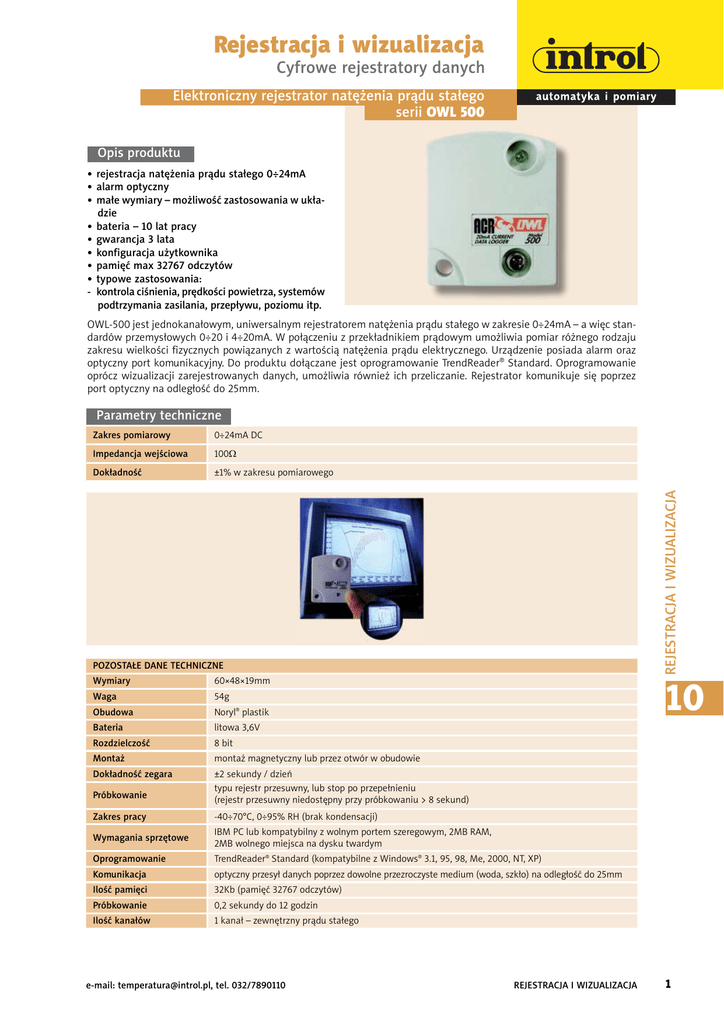 Rejestracja i wizualizacja Cyfrowe rejestratory danych Elektroniczny rejestrator natężenia prądu stałego serii OWL 500 Opis produktu • rejestracja natężenia prądu stałego 0÷24mA • alarm optyczny • małe wymiary – możliwość zastosowania w układzie • bateria – 10 lat pracy • gwarancja 3 lata • konfiguracja użytkownika • pamięć max 32767 odczytów • typowe zastosowania: - kontrola ciśnienia, prędkości powietrza, systemów podtrzymania zasilania, przepływu, poziomu itp. OWL-500 jest jednokanałowym, uniwersalnym rejestratorem natężenia prądu stałego w zakresie 0÷24mA – a więc standardów przemysłowych 0÷20 i 4÷20mA. W połączeniu z przekładnikiem prądowym umożliwia pomiar różnego rodzaju zakresu wielkości fizycznych powiązanych z wartością natężenia prądu elektrycznego. Urządzenie posiada alarm oraz optyczny port komunikacyjny. Do produktu dołączane jest oprogramowanie TrendReader® Standard. Oprogramowanie oprócz wizualizacji zarejestrowanych danych, umożliwia również ich przeliczanie. Rejestrator komunikuje się poprzez port optyczny na odległość do 25mm. Zakres pomiarowy 0÷24mA DC Impedancja wejściowa 100Ω Dokładność ±1% w zakresu pomiarowego REJESTRACJA I WIZUALIZACJA Parametry techniczne POZOSTAŁE DANE TECHNICZNE Wymiary 60×48×19mm Waga 54g Obudowa Noryl® plastik Bateria litowa 3,6V Rozdzielczość 8 bit Montaż montaż magnetyczny lub przez otwór w obudowie Dokładność zegara Próbkowanie ±2 sekundy / dzień typu rejestr przesuwny, lub stop po przepełnieniu (rejestr przesuwny niedostępny przy próbkowaniu > 8 sekund) Zakres pracy -40÷70°C, 0÷95% RH (brak kondensacji) Wymagania sprzętowe IBM PC lub kompatybilny z wolnym portem szeregowym, 2MB RAM, 2MB wolnego miejsca na dysku twardym Oprogramowanie TrendReader® Standard (kompatybilne z Windows® 3.1, 95, 98, Me, 2000, NT, XP) Komunikacja optyczny przesył danych poprzez dowolne przezroczyste medium (woda, szkło) na odległość do 25mm Ilość pamięci 32Kb (pamięć 32767 odczytów) Próbkowanie 0,2 sekundy do 12 godzin Ilość kanałów 1 kanał – zewnętrzny prądu stałego e-mail: [email protected], tel. 032/7890110 10 REJESTRACJA I WIZUALIZACJA 1