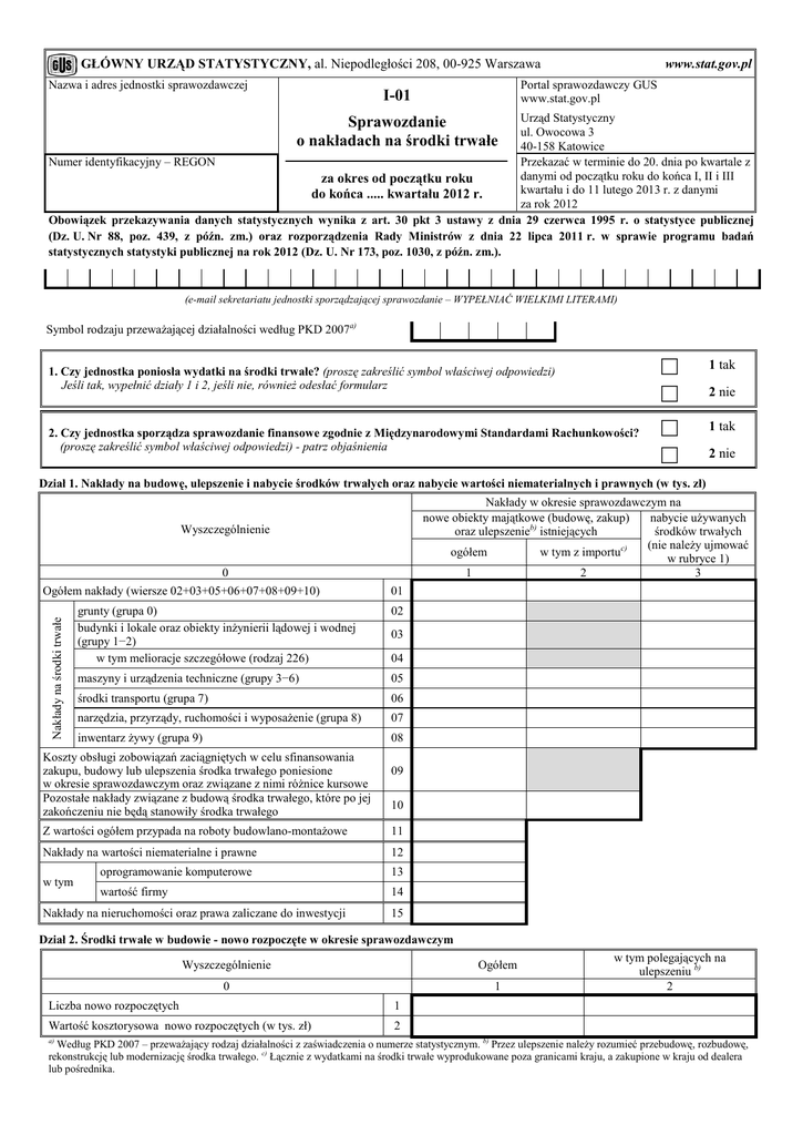 GŁÓWNY URZĄD STATYSTYCZNY, al. Niepodległości 208, 00-925 Warszawa Nazwa i adres jednostki sprawozdawczej www.stat.gov.pl Portal sprawozdawczy GUS www.stat.gov.pl I-01 Urząd Statystyczny ul. Owocowa 3 40-158 Katowice Numer identyfikacyjny – REGON Przekazać w terminie do 20. dnia po kwartale z danymi od początku roku do końca I, II i III za okres od początku roku kwartału i do 11 lutego 2013 r. z danymi do końca ..... kwartału 2012 r. za rok 2012 Obowiązek przekazywania danych statystycznych wynika z art. 30 pkt 3 ustawy z dnia 29 czerwca 1995 r. o statystyce publicznej (Dz. U. Nr 88, poz. 439, z późn. zm.) oraz rozporządzenia Rady Ministrów z dnia 22 lipca 2011 r. w sprawie programu badań statystycznych statystyki publicznej na rok 2012 (Dz. U. Nr 173, poz. 1030, z późn. zm.). Sprawozdanie o nakładach na środki trwałe (e-mail sekretariatu jednostki sporządzającej sprawozdanie – WYPEŁNIAĆ WIELKIMI LITERAMI) Symbol rodzaju przeważającej działalności według PKD 2007a) 1. Czy jednostka poniosła wydatki na środki trwałe? (proszę zakreślić symbol właściwej odpowiedzi) Jeśli tak, wypełnić działy 1 i 2, jeśli nie, również odesłać formularz 1 tak 2 nie 2. Czy jednostka sporządza sprawozdanie finansowe zgodnie z Międzynarodowymi Standardami Rachunkowości? (proszę zakreślić symbol właściwej odpowiedzi) - patrz objaśnienia 1 tak 2 nie Dział 1. Nakłady na budowę, ulepszenie i nabycie środków trwałych oraz nabycie wartości niematerialnych i prawnych (w tys. zł) Nakłady w okresie sprawozdawczym na nowe obiekty majątkowe (budowę, zakup) nabycie używanych oraz ulepszenieb) istniejących środków trwałych (nie należy ujmować c) ogółem w tym z importu w rubryce 1) 1 2 3 Wyszczególnienie 0 Nakłady na środki trwałe Ogółem nakłady (wiersze 02+03+05+06+07+08+09+10) 01 grunty (grupa 0) budynki i lokale oraz obiekty inżynierii lądowej i wodnej (grupy 1−2) w tym melioracje szczegółowe (rodzaj 226) 02 maszyny i urządzenia techniczne (grupy 3−6) 05 środki transportu (grupa 7) 06 narzędzia, przyrządy, ruchomości i wyposażenie (grupa 8) 07 inwentarz żywy (grupa 9) 08 Koszty obsługi zobowiązań zaciągniętych w celu sfinansowania zakupu, budowy lub ulepszenia środka trwałego poniesione w okresie sprawozdawczym oraz związane z nimi różnice kursowe Pozostałe nakłady związane z budową środka trwałego, które po jej zakończeniu nie będą stanowiły środka trwałego 03 04 09 10 Z wartości ogółem przypada na roboty budowlano-montażowe 11 Nakłady na wartości niematerialne i prawne 12 w tym oprogramowanie komputerowe 13 wartość firmy 14 Nakłady na nieruchomości oraz prawa zaliczane do inwestycji 15 Dział 2. Środki trwałe w budowie - nowo rozpoczęte w okresie sprawozdawczym Wyszczególnienie Ogółem 0 1 Liczba nowo rozpoczętych 1 Wartość kosztorysowa nowo rozpoczętych (w tys. zł) 2 w tym polegających na ulepszeniu b) 2 Według PKD 2007 – przeważający rodzaj działalności z zaświadczenia o numerze statystycznym. b) Przez ulepszenie należy rozumieć przebudowę, rozbudowę, rekonstrukcję lub modernizację środka trwałego. c) Łącznie z wydatkami na środki trwałe wyprodukowane poza granicami kraju, a zakupione w kraju od dealera lub pośrednika. a) Dział 3. Leasing w tys. zł (bez znaku po przecinku) finansowy w tym środki ogółem transportu (grupa 7) 1 2 Wyszczególnienie 0 Wartość nowych środków trwałych przyjętych w okresie sprawozdawczym do odpłatnego używania na mocy umowy o leasing (wypełnia leasingobiorca) Wartość środków trwałych zakupionych w okresie sprawozdawczym z przeznaczeniem do oddania w leasing (wypełnia leasingodawca) operacyjny w tym środki ogółem transportu (grupa 7) 3 4 1 2 (e-mail osoby sporządzającej sprawozdanie – WYPEŁNIAĆ WIELKIMI LITERAMI) (imię, nazwisko i telefon osoby sporządzającej sprawozdanie) (miejscowość, data) (pieczątka imienna i podpis osoby działającej w imieniu sprawozdawcy) Objaśnienia do formularza I-01 Uwaga: w e-mailu każdy znak powinien zostać wpisany w odrębnej kratce. Przykład wypełnienia e-maila: Z E N O N . K O W A L S K I @ X X X . Y Y Y . P L Objaśnienie do pyt. 2 Czy jednostka sporządza roczne sprawozdanie finansowe zgodnie z Międzynarodowymi Standardami Rachunkowości? – jednostka udziela pozytywnej odpowiedzi, zaznaczając pole 1 „tak”, jeżeli sporządza roczne sprawozdanie finansowe zgodnie z art. 45 ust. 1a lub 1b ustawy z dnia 29 września 1994 r. o rachunkowości (Dz. U. z 2009 r. Nr 152, poz. 1223, z późn. zm.). Dział 1. Nakłady na budowę, ulepszenie i nabycie środków trwałych oraz nabycie wartości niematerialnych i prawnych W dziale 1 należy wykazać wartość nakładów na środki trwałe poniesione w okresie sprawozdawczym na budowę i/lub zakup środków trwałych (w tym także niewymagających montażu lub instalacji) wraz z kosztami ponoszonymi przy ich nabyciu, tj. kosztami transportu, załadunku i wyładunku, ubezpieczenia w drodze, ceł itp., wartość nakładów na wytworzenie środków trwałych we własnym zakresie, koszty dostosowania środka trwałego do używania, koszty montażu, wartość nakładów na ulepszenie istniejących środków trwałych, w tym również na ulepszenie obcych środków trwałych oraz pełną wartość nakładów na środki trwałe nabyte na mocy umowy o leasing (finansowy, operacyjny), zgodnie z art. 3 ust. 4 ustawy z dnia 29 września 1994 r. o rachunkowości. Do klasyfikowania nakładów na środki trwałe (w tym również nakładów na środki trwałe w budowie) według grup i rodzajów należy posługiwać się Klasyfikacją Środków Trwałych wprowadzoną rozporządzeniem Rady Ministrów z dnia 10 grudnia 2010 r. w sprawie Klasyfikacji Środków Trwałych (KŚT) (Dz. U. Nr 242, poz. 1622). W wierszach od 02 do 08 należy podać: – w rubryce 1 – wartość nakładów poniesionych na obiekty produkcji krajowej, j