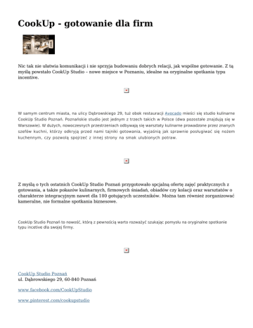 CookUp - gotowanie dla firm Nic tak nie ułatwia komunikacji i nie sprzyja budowaniu dobrych relacji, jak wspólne gotowanie. Z tą myślą powstało CookUp Studio – nowe miejsce w Poznaniu, idealne na oryginalne spotkania typu incentive. W samym centrum miasta, na ulicy Dąbrowskiego 29, tuż obok restauracji Avocado mieści się studio kulinarne CookUp Studio Poznań. Poznańskie studio jest jednym z trzech takich w Polsce (dwa pozostałe znajdują się w Warszawie). W dużych, nowoczesnych przestrzeniach odbywają się warsztaty kulinarne prowadzone przez znanych szefów kuchni, którzy odkryją przed nami tajniki gotowania, wyjaśnią jak sprawnie posługiwać się nożem kuchennym, czy pozwolą spojrzeć z innej strony na smak ulubionych potraw. Z myślą o tych ostatnich CookUp Studio Poznań przygotowało spcjalną ofertę zajęć praktycznych z gotowania, a także pokazów kulinarnych, firmowych śniadań, obiadów czy kolacji oraz warsztatów o charakterze integracyjnym nawet dla 100 gotujących uczestników. Można tam również zorganizować kameralne, nie formalne spotkania biznesowe. CookUp Studio Poznań to nowość, którą z pewnością warto rozważyć szukając pomysłu na oryginalne spotkanie typu incetive dla swojej firmy. CookUp Studio Poznań ul. Dąbrowskiego 29, 60-840 Poznań www.facebook.com/CookUpStudio www.pinterest.com/cookupstudio
