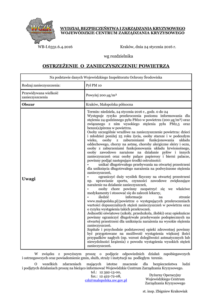 WYDZIAŁ BEZPIECZEŃSTWA I ZARZĄDZANIA KRYZYSOWEGO WOJEWÓDZKIE CENTRUM ZARZĄDZANIA KRYZYSOWEGO WB-I.6331.6.4.2016 Kraków, dnia 24 stycznia 2016 r. wg rozdzielnika OSTRZEŻENIE O ZANIECZYSZCZENIU POWIETRZA Na podstawie danych Wojewódzkiego Inspektoratu Ochrony Środowiska Rodzaj zanieczyszczenia: Pył PM 10 Przewidywana wielkość zanieczyszczenia Powyżej 200 µg/m³ Obszar Kraków, Małopolska północna Uwagi Termin: niedziela, 24 stycznia 2016 r., godz. 0 do 24 Występuje ryzyko przekroczenia poziomu informowania dla stężenia 24-godzinnego pyłu PM10 w powietrzu (200 µg/m³) oraz związanego z nim wysokiego stężenia pyłu PM2,5 oraz benzo(a)pirenu w powietrzu. Osoby szczególnie wrażliwe na zanieczyszczenie powietrza: dzieci i młodzież poniżej 25 roku życia, osoby starsze i w podeszłym wieku, osoby z zaburzeniami funkcjonowania układu oddechowego, chorzy na astmę, choroby alergiczne skóry i oczu, osoby z zaburzeniami funkcjonowania układu krwionośnego, osoby zawodowo narażone na działanie pyłów i innych zanieczyszczeń oraz osoby palące papierosy i bierni palacze, powinny podjąć następujące środki ostrożności: • unikać długotrwałego przebywania na otwartej przestrzeni dla uniknięcia długotrwałego narażenia na podwyższone stężenia zanieczyszczeń, • ograniczyć duży wysiłek fizyczny na otwartej przestrzeni np. uprawianie sportu, czynności zawodowe zwiększające narażenie na działanie zanieczyszczeń, • osoby chore powinny zaopatrzyć się we właściwe medykamenty i stosować się do zaleceń lekarzy, • śledzić informacje na stronie www.malopolska.pl/powietrze o występujących przekroczeniach wartości dopuszczalnych stężeń zanieczyszczeń w powietrzu oraz o ryzyku wystąpienia takich przekroczeń. Jednostki oświatowe (szkoły, przedszkola, żłobki) oraz opiekuńcze powinny ograniczyć długotrwałe przebywanie podopiecznych na otwartej przestrzeni dla uniknięcia narażenia na wysokie stężenia zanieczyszczeń. Szpitale i przychodnie podstawowej opieki zdrowotnej powinny być przygotowane na możliwość wystąpienia większej ilości przypadków nagłych (np. wzrost dolegliwości astmatycznych lub niewydolności krążenia) z powodu wystąpienia wysokich stężeń zanieczyszczeń. W związku z powyższym proszę o podjęcie odpowiednich działań zapobiegawczych i ostrzegawczych oraz powiadomienie gmin, służb, straży i instytucji na podległym terenie. O wszelkich zdarzeniach mających istotne znaczenie dla bezpieczeństwa ludzi i podjętych działaniach proszę na bieżąco informować Wojewódzkie Centrum Zarządzania Kryzysowego. tel.: 12 392-13-00, Dyżurny Operacyjny fax.: 12 422-72-08, Wojewódzkiego Centrum [email protected] Zarządzania Kryzysowego st. insp. Zbigniew Krakowiak Rozdzielnik: I obszar - Kraków MCZK w Krakowie PCZK w Krakowie IV obszar - Małopolska północna PCZK w Krakowie PCZK w Miechowie PCZK w Proszowicach PCZK w Wieliczce