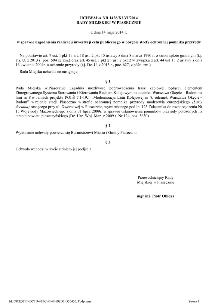 UCHWAŁA NR 1428/XLVI/2014 RADY MIEJSKIEJ W PIASECZNIE z dnia 14 maja 2014 r. w sprawie uzgodnienia realizacji inwestycji celu publicznego w obrębie strefy ochronnej pomnika przyrody Na podstawie art. 7 ust. 1 pkt 1 i art. 18 ust. 2 pkt 15 ustawy z dnia 8 marca 1990 r. o samorządzie gminnym (t.j. Dz. U. z 2013 r. poz. 594 ze zm.) oraz art. 45 ust. 1 pkt 2 i ust. 2 pkt 2 w związku z art. 44 ust 1 i 2 ustawy z dnia 16 kwietnia 2004r. o ochronie przyrody (t.j. Dz. U. z 2013 r., poz. 627, z późn. zm.) Rada Miejska uchwala co następuje: § 1. Rada Miejska w Piasecznie uzgadnia możliwość poprowadzenia trasy kablowej będącej elementem Zintegrowanego Systemu Sterowania i Kierowania Ruchem Kolejowym na odcinku Warszawa Okęcie – Radom na linii nr 8 w ramach projektu POIiŚ 7.1-19.1 „Modernizacja Linii Kolejowej nr 8, odcinek Warszawa Okęcie – Radom” w rejonie stacji Piaseczno w strefie ochronnej pomnika przyrody modrzewia europejskiego (Larix decidua) rosnącego przy ul. Dworcowej w Piasecznie, wymienionego pod lp. 125 Załącznika do rozporządzenia Nr 15 Wojewody Mazowieckiego z dnia 31 lipca 2009r. w sprawie ustanowienia pomników przyrody położonych na terenie powiatu piaseczyńskiego (Dz. Urz. Woj. Maz. z 2009 r. Nr 124, poz. 3630). § 2. Wykonanie uchwały powierza się Burmistrzowi Miasta i Gminy Piaseczno. § 3. Uchwała wchodzi w życie z dniem jej podjęcia. Przewodniczący Rady Miejskiej w Piasecznie mgr inż. Piotr Obłoza Id: 68CE5FFF-DC1D-4E7C-9F47-698D6F556450. Podpisany Strona 1 Uzasadnienie Pismem z dnia 31.03.2014 r. firma Thales Polska Sp. z o.o. z siedzibą przy ul. gen. Józefa Zajączka 9 w Warszawie zwróciła się do Urzędu Miasta i Gminy Piaseczno z prośbą o uzgodnienie poprowadzenia trasy kablowej będącej elementem Zintegrowanego Systemu Sterowania i Kierowania Ruchem Kolejowym na odcinku Warszawa Okęcie – Radom na linii nr 8 w ramach projektu POIiŚ 7.1-19.1 „Modernizacja Linii Kolejowej nr 8, odcinek Warszawa Okęcie – Radom” w rejonie stacji Piaseczno w strefie ochronnej pomnika przyrody modrzewia europejskiego (Larix decidua) rosnącego przy ul. Dworcowej w Piasecznie, wymienionego pod lp. 125 Załącznika do rozporządzenia Nr 15 Wojewody Mazowieckiego z dnia 31 lipca 2009r. w sprawie ustanowienia pomników przyrody położonych na terenie powiatu piaseczyńskiego (Dz. Urz. Woj. Maz. z 2009 r. Nr 124, poz. 3630). Modrzew europejskich rosnący przy ul. Dworcowej w Piasecznie przy ustanowieniu pomnikiem przyrody Orzeczeniem Nr 938 Prezydenta Warszawy z dnia 18.12.1986 r. (znak: RLŻ.VI-7140/28/86), miał określoną 15 metrową strefę ochronną wokół przedmiotowego drzewa. Trasa kablowa będąca elementem Zintegrowanego Systemu Sterowania i Kierowania Ruchem Kolejowym na odcinku Warszawa Okęcie – Radom na linii nr 8 w ramach projektu POIiŚ 7.1-19.1 „Modernizacja Linii Kolejowej nr 8, odcinek Warszawa Okęcie – Radom” na podstawie załączonej dokumentacji będzie przebiegać w odległości ok. 12 metrów od pnia drzewa i tym samym naruszy ww. strefę ochronną. Zgodnie z art. 45 ust. 1 pkt 2 ustawy z dnia 16 kwietnia 2004r. o ochronie przyrody (t.j. Dz. U. z 2013 r., poz. 627, z późn. zm.) w stosunku do pomników przyrody wprowadza się zakaz wykonywania prac ziemnych trwale zniekształcających rzeźbę terenu, z wyjątkiem prac związanych z zabezpieczeniem przeciwsztormowym lub przeciwpowodziowym albo z budową, odbudową, utrzymywaniem, remontem lub naprawą urządzeń wodnych, natomiast w świetle art. 45 ust. 2 i pkt 2 ww. ustawy zakazy dotyczące form ochrony przyrody nie dotyczą realizacji inwestycji celu publicznego po uzgodnieniu z organem ustanawiającym daną formę ochrony przyrody, którym na podstawie z art. 44 ust. 1 jest rada gminy. Prośba firmy Thales Polska Sp. z o.o. podyktowana jest umową Nr 90/127/0001/13/Z/I na Zaprojektowanie i wybudowanie Zintegrowanego Systemu Sterowania i Kierowania Ruchem Kolejowym na odcinku Warszawa Okęcie – Radom na linii nr 8 w ramach projektu POIiŚ 7.1-19.1 „Modernizacja Linii Kolejowej nr 8, odcinek Warszawa Okęcie – Radom”. Id: 68CE5FFF-DC1D-4E7C-9F47-698D6F556450. Podpisany Strona 2