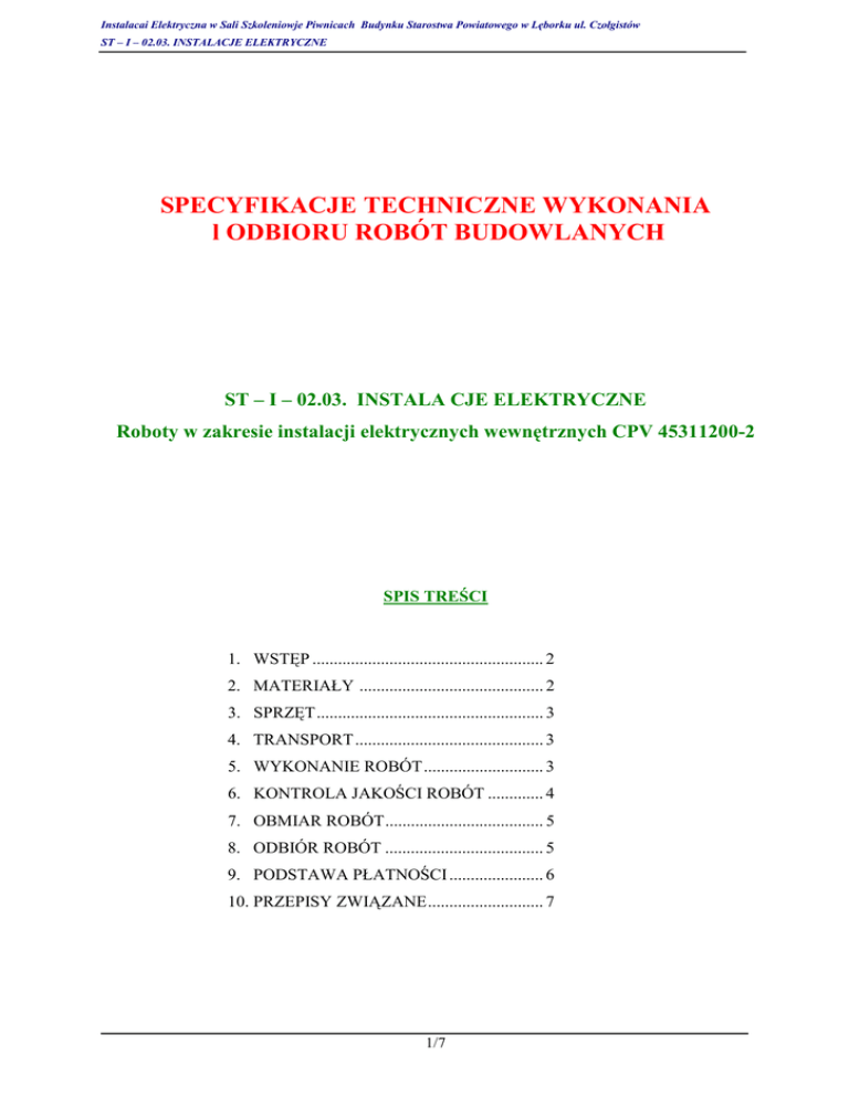 Instalacai Elektryczna w Sali Szkoleniowje Piwnicach Budynku Starostwa Powiatowego w Lęborku ul. Czołgistów ST – I – 02.03. INSTALACJE ELEKTRYCZNE SPECYFIKACJE TECHNICZNE WYKONANIA l ODBIORU ROBÓT BUDOWLANYCH ST – I – 02.03. INSTALA CJE ELEKTRYCZNE Roboty w zakresie instalacji elektrycznych wewnętrznych CPV 45311200-2 SPIS TREŚCI 1. WSTĘP ...................................................... 2 2. MATERIAŁY ........................................... 2 3. SPRZĘT ..................................................... 3 4. TRANSPORT ............................................ 3 5. WYKONANIE ROBÓT ............................ 3 6. KONTROLA JAKOŚCI ROBÓT ............. 4 7. OBMIAR ROBÓT ..................................... 5 8. ODBIÓR ROBÓT ..................................... 5 9. PODSTAWA PŁATNOŚCI ...................... 6 10. PRZEPISY ZWIĄZANE ........................... 7 1/7 Instalacai Elektryczna w Sali Szkoleniowje Piwnicach Budynku Starostwa Powiatowego w Lęborku ul. Czołgistów ST – I – 02.03. INSTALACJE ELEKTRYCZNE 1. WSTĘP 1.1. Przedmiot Specyfikacji Technicznej. Przedmiotem Specyfikacji Technicznej są wymagania dotyczące wykonania i odbioru instalacji elektrycznej w adoptowanych pomieszczeniach piwnicy na salę szkoleniową w Starostwie Powiatowym w Lęborku przy ul. Czołgistów 1.2. Zakres stosowania specyfikacji technicznej Specyfikacja Techniczna jest stosowana jako dokument przetargowy i kontraktowy przy zleceniach i realizacji robót wymienionych w pkt 1.1. 1.3. Zakres robót objętych ST. Ustalenia zawarte w niniejszej ST dotyczą prowadzenia robót elektrycznych i obejmują wykonanie kompletnej instalacji elektrycznej w adoptowanych pomieszczeniach piwnicy na salę szkoleniową w Starostwie Powiatowym w Lęborku. Zakres obejmuje : -Zasilania i rozdziału energii elektrycznej -Oświetlenia podstawowego i gniazd wtyczkowych - DemontaŜe i przebudowa istniejącej instalacji elektrycznej. 1.4. Określenia podstawowe. 1.4.1. Trasowanie - wyznaczenie trasy przebiegu przewodów i miejsc punktów gniazd. wyłączników, opraw itp. 1.4.2. Rury instalacyjne - rury stalowe lub z tworzyw sztucznych układanych po wierzchu lub w podłoŜu. 1.4.3 Kanały i korytka instalacyjne z tworzyw sztucznych układane po wierzchu lub w podłoŜu 1.4.3. PodłoŜe – mur, tynk, beton na których układane są instalacje i przewody. 1.4.4. Punkt oświetleniowy - oprawa oświetleniowa jarzeniowa lub Ŝarowa. 2. MATERIAŁY Ogólne wymagania dotyczące materiałów podano w ST – A – 00.00. „Wymagania ogólne" pkt 2. 2.1. Oprawy oświetleniowe Oświetlenie pomieszczeń wykonać naleŜy oprawami zgodnie z planami dokumentacji projektowej. 2/7 Instalacai Elektryczna w Sali Szkoleniowje Piwnicach Budynku Starostwa Powiatowego w Lęborku ul. Czołgistów ST – I – 02.03. INSTALACJE ELEKTRYCZNE 2.2. Przewody instalacji elektrycznej Całość instalacji elektrycznej wykonać przewodami YDY, YDYp, o przekrojach wg dokumentacji technicznej branŜa elektryczna oraz kablami telekomunikacyjnymi YTLY o róŜnym przekroju Ŝył wg opracowania projektu wykonawczego. 3. SPRZĘT Ogólne wymagania dotyczące sprzętu podano w ST – A – 00.00. „Wymagania ogólne" pkt.3 Ogólne wymagania dotyczące sprzętu. Wykonawca powinien uŜywać tylko takiego sprzętu i narzędzi, które gwarantują właściwą realizację robót. Sprzęt musi być zaakceptowany przez inŜyniera budowy lub inspektora nadzoru. Wykonawca powinien wykazać się moŜliwością korzystania z następujących maszyn narzędzi i sprzętu: - typowych podestów lub rusztowań, - narzędzi podręcznych , - aparatury pomiarowej i atestującej. Do obsługi sprzętu powinni być zatrudnieni pracownicy posiadający odpowiednie kwalifikacje i staŜ pracy. 4. TRANSPORT Ogólne wymagania dotyczące transportu podano w ST – A – 00.00. „Wymagania ogólne" pkt. 4. 4.1Transport materiałów Do transportu materiałów naleŜy uŜyć następujących środków transportowych: - samochodu dostawczego, - palet i opakowań do przewoŜenia sprzętu specjalistycznego oraz przewodów i kabli. Na środkach transportu przewoŜone materiały i elementy powinny być zabezpieczone przed ich przemieszczeniem, układane zgodnie z warunkami transportu wydanymi przez wytwórców dla poszczególnych elementów. 5. WYKONANIE ROBÓT Ogólne wymagania dotyczące wykonania robót podano w ST – A – 00.00. „Wymagania ogólne" pkt. 5. 5.1. Trasowanie - naleŜy wykonać uwzględniając konstrukcję budynku oraz zapewniając bezkolizyjność z innymi instalacjami. Wskazane jest aby trasa przewodów i rur instalacyjnych przebiegała w liniach poziomych i pionowych. 5.2. Bruzdy - dostosować do średnicy rur, aby w przypadku układania dwóch, więcej rur, odstępy między nimi wynosiły nie mniej niŜ 5 mm. 3/7 Instalacai Elektryczna w Sali Szkoleniowje Piwnicach Budynku Starostwa Powiatowego w Lęborku ul. Czołgistów ST – I – 02.03. INSTALACJE ELEKTRYCZNE 5.3. Wykonanie tablic - wykonać zgodnie z rysunkami szczegółowymi Dokumentacji projektowej i zamontować zgodnie z jej zaleceniami. 5.4. Wykonanie stanowisk zespołów gniazd wtyczkowych - wykonać zgodnie z rysunkami szczegółowymi Dokumentacji projektowej i zamontować zgodnie z jej zaleceniami . 5.5. Instalacja oświetlenia i gniazd wtykowych 230V - wykonać przewodami YDY o przekroju Ŝył 3 x 1,5mm2 – 750 V, YDYp 3 x 2,5mm2, YDY 5x1,5mm2, DYc 750V 2,5 mm2 oraz DYc 750V 4mm2 ułoŜonymi p/t lub w kanałach instalacyjnych . Przewody wprowadzone do puszek powinny mieć nadmiar długości niezbędny do wykonania podłączeń. Przewód neutralny powinien być nieco dłuŜszy od przewodów fazowych. Zagięcia i łuki w płaszczyźnie przewodu powinny być łagodne. Puszki naleŜy osadzić na ścianach w sposób trwały i po zamontowaniu przykryć pokrywkami montaŜowymi. 5.6. MontaŜ osprzętu, opraw oświetleniowych i aparatów elektrycznych • gniazda wtyczkowe i łączn