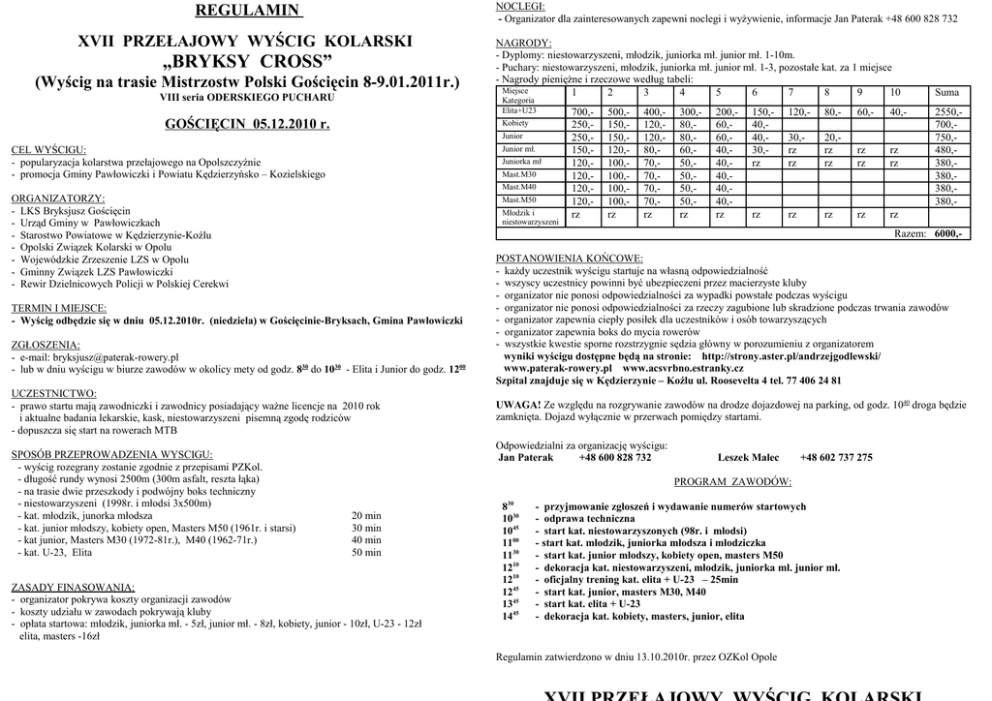 NOCLEGI: - Organizator dla zainteresowanych zapewni noclegi i wyżywienie, informacje Jan Paterak +48 600 828 732 REGULAMIN XVII PRZEŁAJOWY WYŚCIG KOLARSKI „BRYKSY CROSS” (Wyścig na trasie Mistrzostw Polski Gościęcin 8-9.01.2011r.) VIII seria ODERSKIEGO PUCHARU NAGRODY: - Dyplomy: niestowarzyszeni, młodzik, juniorka mł. junior mł. 1-10m. - Puchary: niestowarzyszeni, młodzik, juniorka mł. junior mł. 1-3, pozostałe kat. za 1 miejsce - Nagrody pieniężne i rzeczowe według tabeli: Miejsce 1 2 3 4 5 6 7 8 9 10 Kategoria Elita+U23 GOŚCIĘCIN 05.12.2010 r. Kobiety Junior CEL WYŚCIGU: - popularyzacja kolarstwa przełajowego na Opolszczyźnie - promocja Gminy Pawłowiczki i Powiatu Kędzierzyńsko – Kozielskiego Junior mł. Juniorka mł Mast.M30 Mast.M40 ORGANIZATORZY: - LKS Bryksjusz Gościęcin - Urząd Gminy w Pawłowiczkach - Starostwo Powiatowe w Kędzierzynie-Koźlu - Opolski Związek Kolarski w Opolu - Wojewódzkie Zrzeszenie LZS w Opolu - Gminny Związek LZS Pawłowiczki - Rewir Dzielnicowych Policji w Polskiej Cerekwi Mast.M50 Młodzik i niestowarzyszeni 500,150,150,120,100,100,100,100,rz 400,120,120,80,70,70,70,70,rz 300,80,80,60,50,50,50,50,rz 200,60,60,40,40,40,40,40,rz 150,40,40,30,rz 120,- 80,- 60,- 40,- 30,rz rz 20,rz rz rz rz rz rz rz rz rz rz rz 2550,700,750,480,380,380,380,380,- Razem: 6000,- TERMIN I MIEJSCE: - Wyścig odbędzie się w dniu 05.12.2010r. (niedziela) w Gościęcinie-Bryksach, Gmina Pawłowiczki ZGŁOSZENIA: - e-mail: [email protected] - lub w dniu wyścigu w biurze zawodów w okolicy mety od godz. 830 do 1030 - Elita i Junior do godz. 1200 UCZESTNICTWO: - prawo startu mają zawodniczki i zawodnicy posiadający ważne licencje na 2010 rok i aktualne badania lekarskie, kask, niestowarzyszeni pisemną zgodę rodziców - dopuszcza się start na rowerach MTB SPOSÓB PRZEPROWADZENIA WYSCIGU: - wyścig rozegrany zostanie zgodnie z przepisami PZKol. - długość rundy wynosi 2500m (300m asfalt, reszta łąka) - na trasie dwie przeszkody i podwójny boks techniczny - niestowarzyszeni (1998r. i młodsi 3x500m) - kat. młodzik, junorka młodsza - kat. junior młodszy, kobiety open, Masters M50 (1961r. i starsi) - kat junior, Masters M30 (1972-81r.), M40 (1962-71r.) - kat. U-23, Elita 700,250,250,150,120,120,120,120,rz Suma POSTANOWIENIA KOŃCOWE: - każdy uczestnik wyścigu startuje na własną odpowiedzialność - wszyscy uczestnicy powinni być ubezpieczeni przez macierzyste kluby - organizator nie ponosi odpowiedzialności za wypadki powstałe podczas wyścigu - organizator nie ponosi odpowiedzialności za rzeczy zagubione lub skradzione podczas trwania zawodów - organizator zapewnia ciepły posiłek dla uczestników i osób towarzyszących - organizator zapewnia boks do mycia rowerów - wszystkie kwestie sporne rozstrzygnie sędzia główny w porozumieniu z organizatorem wyniki wyścigu dostępne będą na stronie: http://strony.aster.pl/andrzejgodlewski/ www.paterak-rowery.pl www.acsvrbno.estranky.cz Szpital znajduje się w Kędzierzynie – Koźlu ul. Roosevelta 4 tel. 77 406 24 81 UWAGA! Ze względu na rozgrywanie zawodów na drodze dojazdowej na parking, od godz. 1040 droga będzie zamknięta. Dojazd wyłącznie w przerwach pomiędzy startami. Odpowiedzialni za organizację wyścigu: Jan Paterak +48 600 828 732 Leszek Malec +48 602 737 275 PROGRAM ZAWODÓW: 20 min 30 min 40 min 50 min ZASADY FINASOWANIA: - organizator pokrywa koszty organizacji zawodów - koszty udziału w zawodach pokrywają kluby - opłata startowa: młodzik, juniorka mł. - 5zł, junior mł. - 8zł, kobiety, junior - 10zł, U-23 - 12zł elita, masters -16zł 830 1030 1045 1100 1130 1210 1210 1245 1345 1445 - przyjmowanie zgłoszeń i wydawanie numerów startowych - odprawa techniczna - start kat. niestowarzyszonych (98r. i młodsi) - start kat. młodzik, juniorka młodsza i młodziczka - start kat. junior młodszy, kobiety open, masters M50 - dekoracja kat. niestowarzyszeni, młodzik, juniorka mł. junior mł. - oficjalny trening kat. elita + U-23 – 25min - start kat. junior, masters M30, M40 - start kat. elita + U-23 - dekoracja kat. kobiety, masters, junior, elita Regulamin zatwierdzono w dniu 13.10.2010r. przez OZKol Opole