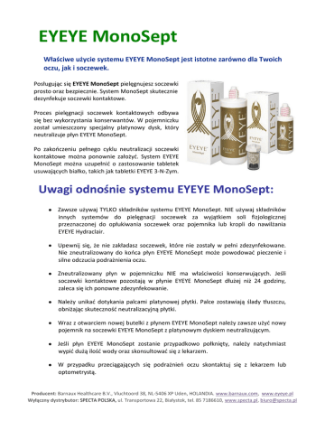 EYEYE MonoSept Właściwe użycie systemu EYEYE MonoSept jest istotne zarówno dla Twoich oczu, jak i soczewek. Posługując się EYEYE MonoSept pielęgnujesz soczewki prosto oraz bezpiecznie. System MonoSept skutecznie dezynfekuje soczewki kontaktowe. Proces pielęgnacji soczewek kontaktowych odbywa się bez wykorzystania konserwantów. W pojemniczku został umieszczony specjalny platynowy dysk, który neutralizuje płyn EYEYE MonoSept. Po zakończeniu pełnego cyklu neutralizacji soczewki kontaktowe można ponownie założyć. System EYEYE MonoSept można uzupełnić o zastosowanie tabletek usuwających białko, takich jak tabletki EYEYE 3-N-Zym. Uwagi odnośnie systemu EYEYE MonoSept: Zawsze używaj TYLKO składników systemu EYEYE MonoSept. NIE używaj składników innych systemów do pielęgnacji soczewek za wyjątkiem soli fizjologicznej przeznaczonej do opłukiwania soczewek oraz pojemnika lub kropli do nawilżania EYEYE Hydraclair. Upewnij się, że nie zakładasz soczewek, które nie zostały w pełni zdezynfekowane. Nie zneutralizowany do końca płyn EYEYE MonoSept może powodować pieczenie i silne odczucia podrażnienia oczu. Zneutralizowany płyn w pojemniczku NIE ma właściwości konserwujących. Jeśli soczewki kontaktowe pozostają w płynie EYEYE MonoSept dłużej niż 24 godziny, zaleca się ich ponowne zdezynfekowanie. Należy unikać dotykania palcami platynowej płytki. Palce zostawiają ślady tłuszczu, obniżając skuteczność neutralizacyjną płytki. Wraz z otwarciem nowej butelki z płynem EYEYE MonoSept należy zawsze użyć nowy pojemnik na soczewki EYEYE MonoSept z platynowym dyskiem neutralizującym. Jeśli płyn EYEYE MonoSept zostanie przypadkowo połknięty, należy natychmiast wypić dużą ilość wody oraz skonsultować się z lekarzem. W przypadku przeciągających się podrażnień oczu skontaktuj się z lekarzem lub optometrystą. Producent: Barnaux Healthcare B.V., Vluchtoord 38, NL-5406 XP Uden, HOLANDIA. www.barnaux.com, www.eyeye.pl Wyłączny dystrybutor: SPECTA POLSKA, ul. Transportowa 22, Białystok, tel. 85 7186610, www.specta.pl, [email protected] EYEYE MonoSept - Unikalny system, który oczyszcza Twoje soczewki kontaktowe Wskazówki prawidłowego używania systemu EYEYE MonoSept do dezynfekcji Twoich soczewek kontaktowych: 1. Higiena: Przed zdejmowaniem soczewek lub wyjmowaniem ich z pojemnika należy starannie umyć ręce. Osusz ręce czystym ręcznikiem. Możesz zastosować specjalny preparat dezynfekujący dłonie EYEYE Sanilon. 2. Umieszczanie soczewek w koszyczkach pojemnika: Włóż lewą soczewkę do sferycznego koszyczka oznaczonego literą L, następnie go zamknij. Włóż prawą soczewkę do prawego sferycznego koszyczka pojemnika, następnie go zamknij. 3. Napełnianie pojemnika: Wypełnij specjalny pojemniczek na soczewki płynem EYEYE MonoSept do zaznaczonego poziomu. UWAGA: płynu nie może być ani za mało, ani za dużo. W przypadku gdy płynu jest za dużo może się on spienić; gdy płynu jest za mało istnieje ryzyko skażenia soczewek. Należy zawsze używać świeżego płynu do każdorazowej dezynfekcji. 4. Umieszczanie koszyczka w pojemniku: Umieść koszyczek w pojemniczku, po czym zakręć go. Nie potrząsaj pojemniczkiem, ponieważ może to spowodować przyklejenie się cząsteczek nadtlenku wodoru do wewnętrznej części pojemniczka. Podczas zakładania soczewek kontaktowych cząsteczki te mogą spowodować silne pieczenie oczu. Należy wtedy natychmiast opłukać oczy dużą ilością czystej wody. 5. Dezynfekcja i przechowywanie: Pozostaw soczewki kontaktowe w preparacie EYEYE MonoSept na okres co najmniej sześciu godzin, a najlepiej na całą noc. 6. Zakładanie: Wyjmij soczewki kontaktowe z pojemniczka. Przed założeniem opłucz je roztworem soli fizjologicznej EYEYE Saline. Możesz je teraz założyć i nosić. 7. Spłukiwanie i suszenie pojemniczka: Zawsze należy natychmiast wylewać zużyty płyn EYEYE MonoSept. Następnie dokładnie opłukać koszyczek, pojemniczek oraz platynową płytkę solą fizjologiczną EYEYE Saline lub płynem EYEYE MonoSept. NIGDY nie należy używać w tym celu wody! Opłukanie płytki jest niezbędne do usunięcia pozostałych zanieczyszczeń, które mogą zakłócić neutralizację płynu EYEYE MonoSept. Pozostaw pojemnik na powietrzu do wyschnięcia. NIE osuszaj go ściereczką. Producent: Barnaux Healthcare B.V., Vluchtoord 38, NL-5406 XP Uden, HOLANDIA. www.barnaux.com, www.eyeye.pl Wyłączny dystrybutor: SPECTA POLSKA, ul. Transportowa 22, Białystok, tel. 85 7186610, www.specta.pl, [email protected] EYEYE MonoSept – Zalecenia: Należy zużyć zawartość butelki EYEYE MonoSept w ciągu 3 miesięcy od jej otwarcia. Nie używać preparatu EYEYE MonoSept po upływie terminu przydatności. Przechowywać butelkę EYEYE MonoSept w temperaturze pomiędzy 5°C a 25°C. Należy zamykać butelkę EYEYE MonoSept bezpośrednio po użyciu. W celu uniknięcia skażenia nie dotykać czubka butelki. Trzymać preparat EYEYE MonoSept poza zasięgiem dzieci. Niektóre typy soczewek mogą ulec deformacji w kontakcie z wodą. Jeśli zalecono ci lek do oczu, przed użyciem leku w połączeniu z soczewkami kontaktowymi oraz preparatem EYEYE MonoSept, skonsultuj się z okulistą lub optometrystą. Skutki uboczne Nie używać EYEYE MonoSept przy uczuleniu na którykolwiek ze składników płynu! Producent: Barnaux Healthcare B.V., Vluchtoord 38, NL-5406 XP Uden, HOLANDIA. www.barnaux.com, www.eyeye.pl Wyłączny dystrybutor: SPECTA POLSKA, ul. Transportowa 22, Białystok, tel. 85 7186610, www.specta.pl, [email protected]