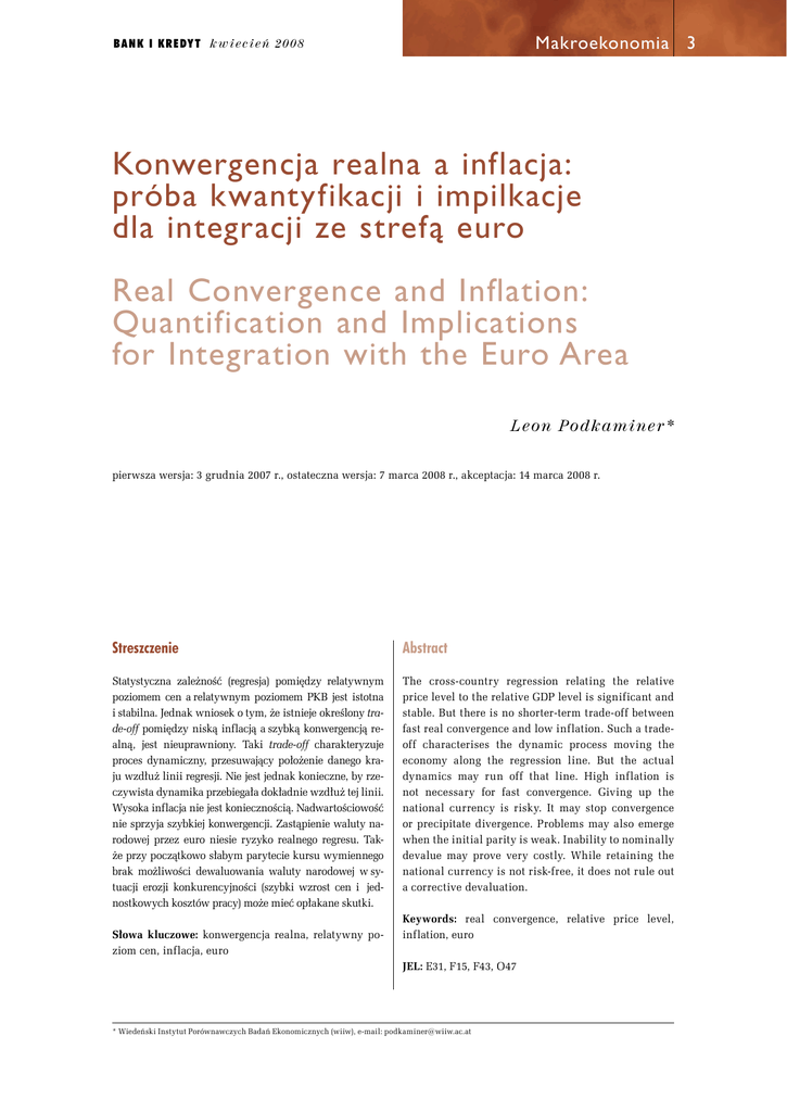 Makroekonomia B a n k i K r e dy t k w i e c i e ń 2 0 0 8 Konwergencja realna a inflacja: próba kwantyfikacji i impilkacje dla integracji ze strefą euro Real Convergence and Inflation: Quantification and Implications for Integration with the Euro Area Leon Podkaminer* pierwsza wersja: 3 grudnia 2007 r., ostateczna wersja: 7 marca 2008 r., akceptacja: 14 marca 2008 r. Streszczenie Abstract Statystyczna zależność (regresja) pomiędzy relatywnym poziomem cen a relatywnym poziomem PKB jest istotna i stabilna. Jednak wniosek o tym, że istnieje określony trade-off pomiędzy niską inflacją a szybką konwergencją realną, jest nieuprawniony. Taki trade-off charakteryzuje proces dynamiczny, przesuwający położenie danego kraju wzdłuż linii regresji. Nie jest jednak konieczne, by rzeczywista dynamika przebiegała dokładnie wzdłuż tej linii. Wysoka inflacja nie jest koniecznością. Nadwartościowość nie sprzyja szybkiej konwergencji. Zastąpienie waluty narodowej przez euro niesie ryzyko realnego regresu. Także przy początkowo słabym parytecie kursu wymiennego brak możliwości dewaluowania waluty narodowej w sytuacji erozji konkurencyjności (szybki wzrost cen i jednostkowych kosztów pracy) może mieć opłakane skutki. The cross-country regression relating the relative price level to the relative GDP level is significant and stable. But there is no shorter-term trade-off between fast real convergence and low inflation. Such a tradeoff characterises the dynamic process moving the economy along the regression line. But the actual dynamics may run off that line. High inflation is not necessary for fast convergence. Giving up the national currency is risky. It may stop convergence or precipitate divergence. Problems may also emerge when the initial parity is weak. Inability to nominally devalue may prove very costly. While retaining the national currency is not risk-free, it does not rule out a corrective devaluation. Słowa kluczowe: konwergencja realna, relatywny poziom cen, inflacja, euro Keywords: real convergence, relative price level, inflation, euro JEL: E31, F15, F43, O47 * Wiedeński Instytut Porównawczych Badań Ekonomicznych (wiiw), e-mail: [email protected] Macroeconomics Poziom cen, definiowany jako stosunek (iloraz) parytetu siły nabywczej i kursu walutowego, odpowiada – z dość dużą dokładnością – poziomowi PKB na 1 mieszkańca (mierzonemu parytetem siły nabywczej). Zjawisko to ilustruje wykres 1, z danymi o relatywnych poziomach cen i relatywnych poziomach PKB (na 1 mieszkańca) dla 27 krajów (obecnych członków Unii Europejskiej) w 2001 r. Relatywny poziom cen w krajach dość zamożnych jest zasadniczo wyższy niż w krajach uboższych. Zjawisko to jest raczej uniwersalne: obserwuje się je w badaniach porównawczych dla różnych przekrojów geograficznych i czasowych. U podłoża omawianej zależności leży fakt strukturalny. Poziomy cen (i wolumenu spożycia) usług w krajach zamożnych są z reguły dużo wyższe niż w krajach uboższych. Powszechnie fakt ten objaśnia się tzw. efektem Balassy-Samuelsona (BSE). Wzrost relatywnego poziomu cen w danym kraju dokonuje się w wyniku kombinacji dwu procesów: (1) nominalnej aprecjacji kursu walutowego przy stałych cenach, (2) inflacji wyższej niż średnio w UE (a ściślej mówiąc: nominalnej deprecjacji parytetu siły nabywczej) przy stałym kursie nominalnym. (O nominalnej deprecjacji parytetu siły nabywczej mówimy, gdy jego wartość liczbowa wzrasta. Przykładowo, w 2000 r. nastąpiła nominalna deprecjacja parytetu siły nabywczej złotego – do 1,82 zł/euro, z 1,75 zł/euro w 1999 r.). W reżimie stałego kursu walutowego – a tym bardziej w reżimie izby walutowej (currency board) – „ciężar” zmian relatywnego poziomu cen spada na inflację krajową. Dość podobnie sprawy się mają w krajach, które przystępując do Europejskiego Mechanizmu Kursowego II (ERM II), zobowiązują się do zachowania stabilności kursu walutowego. Rodzi się tu pytanie o możli W naszym przypadku poziomy relatywne (cen i PKB) są stosunkami odpowiednich wielkości absolutnych dla poszczególnych krajów UE i średniego absolutnego poziomu (cen i PKB) dla UE. Oczywiście, występują także wyjątki – potwierdzające wszak ogólną regułę. Wyjątkowa jest w szczególności pozycja bardzo małych krajów – takich jak Luksemburg, charakteryzujący się najwyższym poziomem GDP i stosunkowo umiarkowanym poziomem cen (tzw. outlier na wykresie 1). Anomalię Luksemburga tłumaczy się jego rozmiarami i położeniem (pomiędzy Belgią, Francją i Niemcami). Ceny (również usług, także mieszkaniowych) w Luksemburgu nie mogą znacznie odbiegać od cen przeważających w sąsiadujących miejscowościach i centrach handlowych położonych za jego granicą. Przeciwną anomalię (systematycznie wysoki poziom cen przy relatywnie niskim PKB) obserwuje się często w małych krajach czerpiących duże dochody z turystyki zagranicznej (np. w Chorwacji). Wyjaśnienie to jest – dla mnie – teoretycznie niezadowalające – czemu dałem już wyraz (Podkaminer 2003a; 2003b; 2004). W tym miejscu nie ma potrzeby dyskutowania na temat BSE – nie interesują nas teraz przyczyny jego realności. Interesuje nas tu tylko i wyłącznie zależność „makro”, ilustrowana wykresem 1. Stosowniejsze wyjaśnienie faktu strukturalnego nawiązuje do zróżnicowania elastyczności popytu na towary i usługi przy rosnącym poziomie dochodów realnych (por. Podkaminer 1998; 2004). Należy dodać, że szeroko zakrojone badania ekonometryczne nie potwierdzają empirycznej adekwatności BSE. Podsumowując wieloletnie badania (także własne) nad występowaniem BSE, Égert (2007, s. 1) uznaje za właściwe mówić o nekrologu dla tej hipotezy („our estimation results provide the obituary notice for the Balassa-Samuelson effect”). Wykres 1. Relatywne poziomy PKB per capita oraz relatywne poziomy cen w 2001 r., E