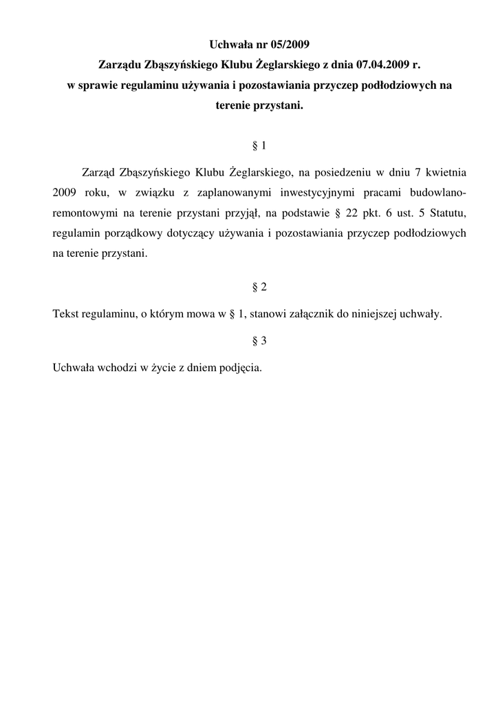 Uchwała nr 05/2009 Zarządu Zbąszyńskiego Klubu Żeglarskiego z dnia 07.04.2009 r. w sprawie regulaminu używania i pozostawiania przyczep podłodziowych na terenie przystani. §1 Zarząd Zbąszyńskiego Klubu Żeglarskiego, na posiedzeniu w dniu 7 kwietnia 2009 roku, w związku z zaplanowanymi inwestycyjnymi pracami budowlanoremontowymi na terenie przystani przyjął, na podstawie § 22 pkt. 6 ust. 5 Statutu, regulamin porządkowy dotyczący używania i pozostawiania przyczep podłodziowych na terenie przystani. §2 Tekst regulaminu, o którym mowa w § 1, stanowi załącznik do niniejszej uchwały. §3 Uchwała wchodzi w życie z dniem podjęcia. Zbąszyński Klub Żeglarski Zbąszyn, ul. Łąkowa 7 Załącznik nr 1 do Uchwały nr 5/09 z dnia 7 kwietnia 2009r. Zarządu Zbąszyńskiego Klubu Żeglarskiego REGULAMIN PORZĄDKOWY DOTYCZĄCY UŻYWANIA I POZOSTAWIANIA PRZYCZEP PODŁODZIOWYCH NA TERENIE PRZYSTANI Zbąszyńskiego Klubu Żeglarskiego 1. 2. 3. 4. §1 Przystań jachtowa Zbąszyńskiego Klubu Żeglarskiego jest położona w Zbąszyniu nad jeziorem Błędno przy ulicy Łąkowej 7. Teren przystani jest terenem zamkniętym. Władzę na przystani sprawuje Zarząd Klubu, a w jego imieniu Kierownik Przystani, który odpowiada za organizację, porządek i bezpieczeństwo. Na terenie przystani obowiązuje przestrzeganie zasad niniejszego Regulaminu, Regulaminu Porządkowego oraz ogólnie przyjętej etykiety żeglarskiej. §2 1. Miejsce czasowego pozostawienia przyczepy każdorazowo wskazuje Kierownik Przystani, względnie osoba upoważniona przez Zarząd Klubu lub Kierownika Przystani. 2. W przypadku zastępowania Kierownika Przystani w czynnościach określonych w pkt. 1, dane kontaktowe zastępującego będą podane na tablicy ogłoszeń Klubu. §3 Wszystkie osoby biorące udział w manewrach związanych z parkowaniem przyczep oraz przebywające w bezpośredniej bliskości zobowiązane są do zachowania szczególnej ostrożności oraz podporządkowania się zaleceniom lub poleceniom Kierownika Przystani, jego zastępcy lub członków Zarządu Klubu. §4 1. Podczas manewrów parkingowych zabronione jest zaśmiecanie, zanieczyszczanie terenu oraz uszkadzanie terenu i budowli. 2. Powstałe szkody winny być niezwłocznie usunięte lub naprawione przez sprawcę. 3. O zdarzeniach wymienionych w pkt. 1 należy każdorazowo powiadomić Kierownika Przystani, który może nakazać natychmiastowe usunięcie szkód powstałych z tego tytułu. §5 1. Manewrowanie przyczepami, ich ustawianie oraz parkowanie w ciągach komunikacyjnych, na trawnikach, w hangarach oraz miejscach specjalnie oznaczonych jest zabronione. 2. Sposób oraz miejsce ustawienia i pozostawienia przyczep nie może utrudniać lub uniemożliwiać bezpiecznego przemieszczania się innych pojazdów oraz osób. 1. 2. 3. 4. 5. §6 Czas bezpłatnego pozostawienia przyczep przez członków Klubu na terenie przystani ubiega z końcem następnego tygodnia po postawieniu łodzi na wodzie. Okres płatnego pozostawiania przyczep przez członków Klubu na terenie przystani wynosi 14 dni i liczy się od poniedziałku następującego po dniu określonym w pkt. 1, z zastrzeżeniem pkt. 3. W przypadku ustawienia przyczepy uniemożliwiającego bądź utrudniającego prowadzenie inwestycyjnych prac budowlano-remontowych na terenie przystani, przyczepa zostanie przetransportowana i umieszczona na strzeżonym płatnym parkingu. Na tę okoliczność zostanie sporządzony protokół. Również po upływie terminu określonego w pkt. 2, przyczepa zostanie przetransportowana i umieszczona na terenie strzeżonego płatnego parkingu. Każdorazowo kosztami transportu oraz parkowania przyczepy, jak również kosztami przestojów i opóźnień w pracach inwestycyjnych, powstałych w wyniku nie usunięcia przyczepy w określonym terminie, obciążony zostanie właściciel/użytkownik przyczepy. §7 Postanowienia końcowe 1. Klub Żeglarski nie ponosi odpowiedzialności za szkody wynikłe podczas manewrowania i w okresie parkowania. 2. W sprawach nieuregulowanych niniejszym Regulaminem obowiązują powszechne przepisy prawa. 3. Regulamin wchodzi w życie z dniem uchwalenia.