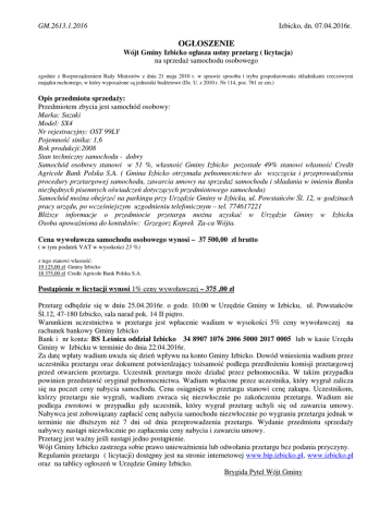 GM.2613.1.2016 Izbicko, dn. 07.04.2016r. OGŁOSZENIE Wójt Gminy Izbicko ogłasza ustny przetarg ( licytacja) na sprzeda samochodu osobowego zgodnie z Rozporz dzeniem Rady Ministrów z dnia 21 maja 2010 r. w sprawie sposobu i trybu gospodarowania składnikami rzeczowymi maj tku ruchomego, w który wyposa one s jednostki bud etowe (Dz. U. z 2010 r. Nr 114, poz. 761 ze zm.) Opis przedmiotu sprzeda y: Przedmiotem zbycia jest samochód osobowy: Marka: Suzuki Model: SX4 Nr rejestracyjny: OST 99LY Pojemno sinika: 1,6 Rok produkcji:2008 Stan techniczny samochodu - dobry Samochód osobowy stanowi w 51 %, własno Gminy Izbicko pozostałe 49% stanowi własno Credit Agricole Bank Polska S.A. ( Gmina Izbicko otrzymała pełnomocnictwo do wszcz cia i przeprowadzenia procedury przetargowej samochodu, zawarcia umowy na sprzeda samochodu i składania w imieniu Banku niezb dnych pisemnych o wiadcze dotycz cych przedmiotowego samochodu) Samochód mo na obejrze na parkingu przy Urz dzie Gminy w Izbicku, ul. Powsta ców l. 12, w godzinach pracy urz du, po wcze niejszym uzgodnieniu telefonicznym – tel. 774617221 Bli sze informacje o przedmiocie przetargu mo na uzyska w Urz dzie Gminy w Izbicku Osoba upowa niona do kontaktów: Grzegorz Koprek Za-ca Wójta. Cena wywoławcza samochodu osobowego wynosi – 37 500,00 zł brutto ( w tym podatek VAT w wysoko ci 23 %) z tego stanowi własno : 19 125,00 zł Gminy Izbicko 18 375,00 zł Credit Agricole Bank Polska S.A. Post pienie w licytacji wynosi 1% ceny wywoławczej – 375 ,00 zł Przetarg odb dzie si w dniu 25.04.2016r. o godz. 10.00 w Urz dzie Gminy w Izbicku, ul. Powsta ców l.12, 47-180 Izbicko, sala narad pok. 14 II pi tro. Warunkiem uczestnictwa w przetargu jest wpłacenie wadium w wysoko ci 5% ceny wywoławczej na rachunek bankowy Gminy Izbicko Bank i nr konta: BS Le nica oddział Izbicko 34 8907 1076 2006 5000 2017 0005 lub w kasie Urz du Gminy w Izbicku w terminie do dnia 22.04.2016r. Za dat wpłaty wadium uwa a si dzie wpływu na konto Gminy Izbicko. Dowód wniesienia wadium przez uczestnika przetargu oraz dokument potwierdzaj cy to samo podlega przedło eniu komisji przetargowej przed otwarciem przetargu. Uczestnik przetargu mo e działa przez pełnomocnika. W takim przypadku powinien przedstawi oryginał pełnomocnictwa. Wadium wpłacone przez uczestnika, który wygrał zalicza si na poczet ceny nabycia samochodu. Cena osi gni ta w przetargu stanowi cen zakupu. Uczestnikom, którzy przetargu nie wygrali, wadium zwraca si niezwłocznie po zako czeniu przetargu. Wadium nie podlega zwrotowi w przypadku gdy uczestnik, który wygrał przetarg uchyli si od zawarcia umowy. Nabywca jest zobowi zany zapłaci cen nabycia samochodu niezwłocznie po wygraniu przetargu jednak w terminie nie dłu szym ni 7 dni od dnia przeprowadzenia przetargu. Wydanie przedmiotu sprzeda y nabywcy nast pi niezwłocznie po zapłaceniu ceny nabycia i zawarciu umowy. Przetarg jest wa ny je li nast pi jedno post pienie. Wójt Gminy Izbicko zastrzega sobie prawo uniewa nienia lub odwołania przetargu bez podania przyczyny. Regulamin przetargu ( licytacji) dost pny jest na stronie internetowej www.bip.izbicko.pl, www.izbicko.pl oraz na tablicy ogłosze w Urz dzie Gminy Izbicko. Brygida Pytel Wójt Gminy