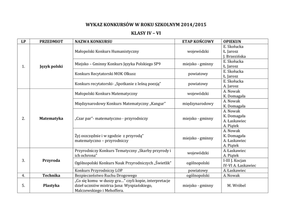 wykaz konkursów w roku szkolnym 2014/2015 klasy iv – vi