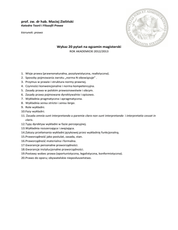 prof. zw. dr hab. Maciej Zieliński Katedra Teorii i Filozofii Prawa kierunek: prawo Wykaz 20 pytań na egzamin magisterski ROK AKADEMICKI 2012/2013 1. Wizje prawa (prawnonaturalna, pozytywistyczna, realistyczna). 2. Sposoby pojmowania zwrotu „norma N obowiązuje” . 3. Przymus w prawie i struktura normy prawnej. 4. Czynności konwencjonalne i norma kompetencyjna. 5. Zasady prawa w polskim prawoznawstwie i obcym. 6. Zasady prawa pojmowane dyrektywalnie i opisowo. 7. Wykładnia pragmatyczna i apragmatyczna. 8. Wykładnia sensu stricto i sensu largo. 9. Role wykładni. 10.Fazy wykładni. 11. Zasada omnia sunt interpretanda a paremie clara non sunt interpretanda i interpretatio cessat in claris. 12.Typy dyrektyw wykładni w fazie percepcyjnej. 13.Wykładnia rozszerzająca i zwężająca. 14.Zakazy przełamania wykładni językowej przez wykładnię funkcjonalną. 15.Praworządność jako postulat, zasada, stan. 16.Praworządność materialna i formalna. 17.Gwarancje personalne praworządności. 18.Gwarancje instytucjonalne praworządności. 19.Postawy wobec prawa (oportunistyczna, legalistyczna, konformistyczna). 20.Prawo do oporu; obywatelskie nieposłuszeństwo.