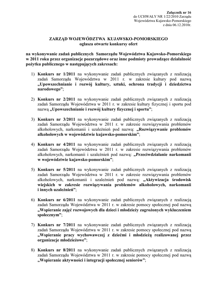 Załącznik nr 16 do UCHWAŁY NR 1/22/2010 Zarządu Województwa Kujawsko-Pomorskiego z dnia 06.12.2010r. ZARZĄD WOJEWÓDZTWA KUJAWSKO-POMORSKIEGO ogłasza otwarte konkursy ofert na wykonywanie zadań publicznych Samorządu Województwa Kujawsko-Pomorskiego w 2011 roku przez organizacje pozarządowe oraz inne podmioty prowadzące działalność poŜytku publicznego w następujących zakresach: 1) Konkurs nr 1/2011 na wykonywanie zadań publicznych związanych z realizacją zadań Samorządu Województwa w 2011 r. w zakresie kultury pod nazwą „Upowszechnianie i rozwój kultury, sztuki, ochrona tradycji i dziedzictwa narodowego”; 2) Konkurs nr 2/2011 na wykonywanie zadań publicznych związanych z realizacją zadań Samorządu Województwa w 2011 r. w zakresie kultury fizycznej i sportu pod nazwą „Upowszechnianie i rozwój kultury fizycznej i sportu”; 3) Konkurs nr 3/2011 na wykonywanie zadań publicznych związanych z realizacją zadań Samorządu Województwa w 2011 r. w zakresie rozwiązywania problemów alkoholowych, narkomanii i uzaleŜnień pod nazwą: „Rozwiązywanie problemów alkoholowych w województwie kujawsko-pomorskim”; 4) Konkurs nr 4/2011 na wykonywanie zadań publicznych związanych z realizacją zadań Samorządu Województwa w 2011 r. w zakresie rozwiązywania problemów alkoholowych, narkomanii i uzaleŜnień pod nazwą: „Przeciwdziałanie narkomanii w województwie kujawsko-pomorskim”; 5) Konkurs nr 5/2011 na wykonywanie zadań publicznych związanych z realizacją zadań Samorządu Województwa w 2011 r. w zakresie rozwiązywania problemów alkoholowych, narkomanii i uzaleŜnień pod nazwą: „Aktywizacja środowisk wiejskich w zakresie rozwiązywania problemów alkoholowych, narkomanii i innych uzaleŜnień”; 6) Konkurs nr 6/2011 na wykonywanie zadań publicznych związanych z realizacją zadań Samorządu Województwa w 2011 r. w zakresie pomocy społecznej pod nazwą „Wspieranie zajęć rozwojowych dla dzieci i młodzieŜy zagroŜonych wykluczeniem społecznym”; 7) Konkurs nr 7/2011 na wykonywanie zadań publicznych związanych z realizacją zadań Samorządu Województwa w 2011 r. w zakresie pomocy społecznej pod nazwą „Wspieranie pracy wychowawczej z dziećmi i młodzieŜą realizowanej przez organizacje młodzieŜowe”; 8) Konkurs nr 8/2011 na wykonywanie zadań publicznych związanych z realizacją zadań Samorządu Województwa w 2011 r. w zakresie pomocy społecznej pod nazwą „Wspieranie aktywności i integracji społecznej seniorów”; 9) Konkurs nr 9/2011 na wykonywanie zadań publicznych związanych z realizacją zadań Samorządu Województwa w 2010 r. w zakresie pomocy społecznej pod nazwą „Wsparcie działań z zakresu opieki nad osobami przewlekle chorymi”; 10) Konkurs nr 10/2011 na wykonywanie zadań publicznych związanych z realizacją zadań Samorządu Województwa w 2011 r. w zakresie promocji i ochrony zdrowia pod nazwą „Ochrona i promocja zdrowia”; 11) Konkurs nr 11/2011 na wykonywanie zadań publicznych związanych z realizacją zadań Samorządu Województwa w 2011 r. w zakresie turystyki pod nazwą „Upowszechnianie turystyki i krajoznawstwa”; 12) Konkurs nr 12/2011 na wykonywanie zadań publicznych związanych z realizacją zadań Samorządu Województwa w 2011 r. w zakresie działalności na rzecz osób niepełnosprawnych pod nazwą „Rehabilitacja dzieci niewidomych i słabowidzących”; 13) Konkurs nr 13/2011 na wykonywanie zadań publicznych związanych z realizacją zadań Samorządu Województwa w 2011 r. dotyczących działalności na rzecz organizacji pozarządowych oraz podmiotów wymienionych w art. 3. ust. 3, w zakresie określonym w art. 4 ust. 1 pkt 1-32 ustawy o działalności poŜytku publicznego i o wolontariacie pod nazwą: „Dofinansowanie wkładu własnego do projektów finansowanych z funduszy zewnętrznych”; 14) Konkurs nr 14/2011 na wykonywanie zadań publicznych związanych z realizacją zadań Samorządu Województwa w 2011 r. dotyczących działalności na rzecz organizacji pozarządowych oraz podmiotów wymienionych w art. 3. ust. 3, w zakresie określonym w art. 4 ust. 1 pkt 1-32 ustawy o działalności poŜytku publicznego i o wolontariacie pod nazwą: „Forum Organizacji Pozarządowych Województwa Kujawsko-Pomorskiego”; 15) Konkurs nr 15/2011 na wykonywanie zadań publicznych związanych z realizacją zadań Samorządu Województwa w 2011 r. ze środków Państwowego Funduszu Rehabilitacji Osób Niepełnosprawnych w zakresie rehabilitacji zawodowej i społecznej osób niepełnosprawnych. Pełny tekst ogłoszenia konkursowego, zawierający szczegółowe informacje dotyczące składania ofert na poszczególne zadania oraz wzory druków związanych z realizacją zadania publicznego znajdują się na stronie internetowej Urzędu Marszałkowskiego Województwa Kujawsko-Pomorskiego www.kujawsko-pomorskie.pl (zakładka: „organizacje pozarządowe”) oraz w Biuletynie Informacji Publicznej www.bip.kujawsko-pomorskie.pl. Oferty na realizację zadań publicznych naleŜy składać w następujących miejscach i terminach: Oferty dotyczące Konkursów nr 1/2011, 2/2011, 3/2011, 4/2011, 5/2011, 10/2011, 11/2011, 12/2011 oraz 15/2011 – w Urzędzie Marszałkowskim Województwa KujawskoPomorskiego, ul. Plac Teatralny 2, 87-100 Toruń, kancelaria ogólna - pokój 261 – do dnia 10 stycznia 2011 r., do godz. 15.00; Oferty dotyczące Konkursów nr 6/2011, 7/2011, 8/2011, 9/2011 – w Urzędzie Marszałkowskim Województwa Kujawsko-Pomorskiego, ul. M. Skłodowskiej-Curie 73, 87-100 Toruń, I piętro, pokój nr 128 – do dnia 10 stycznia 2011 r., do godz. 15.00; Oferty dotyczące Konkursu nr 13/2011 – w Urzędzie Marszałkowskim Województwa Kujawsko-Pomorskiego, ul. Plac Teatralny 2, 87-100 Toruń, kancelaria ogólna - pokój 261 – od dnia 10 stycznia 2011 r. do dnia 1 września 2011 r., do godz. 15.00; Oferty dotyczące Konkursu nr 14/2011 – w Urzędzie Marszałkow