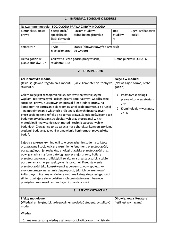 1. INFORMACJE OGÓLNE O MODULE Nazwa (tytuł) modułu: SOCJOLOGIA PRAWA Z KRYMINOLOGIĄ Kierunek studiów: Specjalność/ Poziom studiów: Rok prawo specjalizacja Jednolite magisterskie studiów: 4 (jeśli dotyczy): -------------Semestr: 7 Tryb: Status (obowiązkowy/do wyboru): niestacjonarny do wyboru Liczba godzin w planie studiów: 27 Całkowita liczba godzin pracy własnej studenta: 138 Język wykładowy: polski Liczba punktów ECTS: 6 2. OPIS MODUŁU Cel i tematyka modułu: Zajęcia w module: (Jakie są główne zagadnienia modułu i jakie kompetencje zdobywa (Nazwa zajęć, forma, liczba godzin) student?) Celem zajęć jest zaznajomienie studentów z najważniejszymi wątkami teoretycznymi i osiągnięciami empirycznymi współczesnej socjologii prawa. Kurs powinien pozwolić im z jednej strony, na kompetentne poruszanie się w omawianej problematyce, a z drugiej – na podejmowanie własnych prób analiz danych dostarczanych przez socjologiczną refleksję na temat prawa. Zajęcia poświęcone też będą tematyce badań socjologicznych oraz stosowanej w nich metodologii - najważniejszych metod i technik stosowanych w badaniach. Z uwagi na to, że zajęcia mają charakter konwersatorium, studenci będą angażowani w omawianie konkretnych przypadków badań. 1. Podstawy socjologii prawa – konwersatorium / 9h 2. Kryminologia – warsztaty / 18h Zajęcia z zakresu kryminologii to wprowadzenie studenta w istotę oraz prawne i socjologiczne rozumienie fenomenu przestępczości, poszczególnych jej rodzajów, etiologii zjawiska przestępczości oraz powiązanych z nią form patologii społecznej, sprawcy i ofiary przestępstwa oraz profilaktyki i zwalczania przestępczości, a także postrzegania ich w perspektywie historycznej. Przedstawienie przestępczości jako konsekwencji zaburzeń rozwoju społecznoekonomicznego, narastania dysproporcji, jak i ich uwarunkowań kulturowych. Zostaną omówione wybrane kategorie przestępczości, silnie rozwijające się w polskim społeczeństwie oraz interakcje pomiędzy poszczególnymi rodzajami przestępczości. 3. EFEKTY KSZTAŁCENIA Efekty modułowe: (Wiedza i umiejętności, jakie powinien posiadać student, by zaliczyć moduł) Wiedza: 1. ma rozszerzoną wiedzę z zakresu socjologii prawa, zna historię Obowiązkowa literatura: (jeśli jest wymagana) 2. 3. 4. 5. 6. tej dyscypliny, jej najważniejsze teorie oraz umie określić zakres przedmiotowy dociekań zna w sposób pogłębiony metody i narzędzia opisu zjawisk społecznych i prawnych właściwe socjologii prawa, techniki pozyskiwania danych pozwalające opisywać społeczeństwo, państwo i prawo oraz procesy w nich i między nimi zachodzące posiada pogłębioną wiedzę o wzajemnych relacjach pomiędzy normami prawnymi a innymi rodzajami norm społecznych, ma pogłębioną wiedzę o funkcjach norm prawnych ma rozszerzona wiedzę o człowieku jako twórcy prawa i struktur społecznych, zna rozumie wielość oraz znaczenie czynników oddziaływujących na tworzenie, stosowanie i naruszenia prawa ma wiedzę w zakresie poprawnego logicznie formułowania myśli, wnioskowania i definiowania pojęć, wypracowanych przez naukę kryminologii ma pogłębioną wiedzę o procesach zmian zachodzących w społeczeństwie, państwie i prawie oraz zna rządzące tymi zmianami prawidłowości Umiejętności: 1. potrafi wykorzystać wiedzę teoretyczną do szczegółowego opisu i praktycznego analizowania przyczyn i przebiegu zjawisk społecznych, w szczególności prawidłowo interpretuje i wyjaśnia zjawisko przestępczości, wpływ regulacji prawnych na jego rozwój, zmianę, ograniczanie lub zwalczanie 2. ma umiejętność samodzielnego określenia i analizowania założonych i rzeczywistych funkcji konkretnych regulacji prawnych, posiada umiejętności badawcze; formułuje problemy, dobiera adekwatne metody, techniki i narzędzia badawcze właściwe dla socjologii prawa 3. posiada umiejętność praktycznego wykorzystania zdobytej wiedzy z zakresu socjologii oraz kryminologii i prezentowania własnych poglądów w tej dziedzinie, wątpliwości i sugestii oraz popierania ich rozbudowaną argumentacją Kompetencje społeczne: 1. umie uczestniczyć w przygotowaniu projektów społecznych i potrafi przewidywać wielokierunkowe skutki społeczne swojej działalności 2. potrafi samodzielnie i krytycznie uzupełniać wiedzę i umiejętności, rozszerzone o wymiar interdyscyplinarny 3. potrafi odpowiednio określić priorytety służące przeprowadzeniu badania z zakresu socjologii prawa lub kryminologii