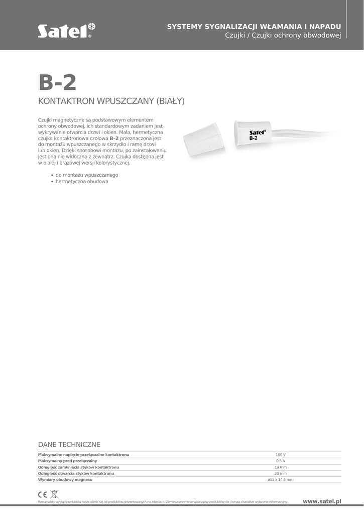 SYSTEMY SYGNALIZACJI WŁAMANIA I NAPADU Czujki / Czujki ochrony obwodowej B-2 KONTAKTRON WPUSZCZANY (BIAŁY) Czujki magnetyczne są podstawowym elementem ochrony obwodowej, ich standardowym zadaniem jest wykrywanie otwarcia drzwi i okien. Mała, hermetyczna czujka kontaktronowa czołowa B–2 przeznaczona jest do montażu wpuszczanego w skrzydło i ramę drzwi lub okien. Dzięki sposobowi montażu, po zainstalowaniu jest ona nie widoczna z zewnątrz. Czujka dostępna jest w białej i brązowej wersji kolorystycznej. do montażu wpuszczanego hermetyczna obudowa DANE TECHNICZNE Maksymalne napięcie przełączalne kontaktronu Maksymalny prąd przełączalny Odległość zamknięcia styków kontaktronu Odległość otwarcia styków kontaktronu Wymiary obudowy magnesu 100 V 0,5 A 19 mm 20 mm ø11 x 14,5 mm Rzeczywisty wygląd produktów może różnić się od produktów prezentowanych na zdjęciach. Zamieszczone w serwisie opisy produktów<br />mają charakter wyłącznie informacyjny. www.satel.pl