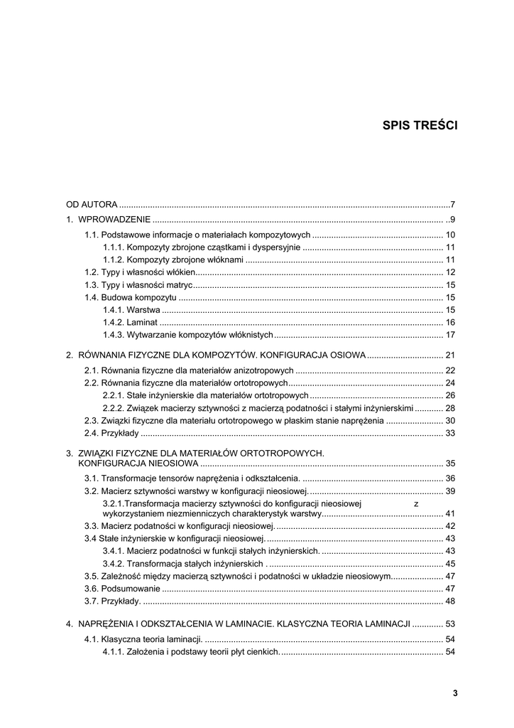 SPIS TREŚCI OD AUTORA ...........................................................................................................................................7 1. WPROWADZENIE .......................................................................................................................... ..9 1.1. Podstawowe informacje o materiałach kompozytowych ....................................................... 10 1.1.1. Kompozyty zbrojone cząstkami i dyspersyjnie ........................................................... 11 1.1.2. Kompozyty zbrojone włóknami ................................................................................... 11 1.2. Typy i własności włókien........................................................................................................ 12 1.3. Typy i własności matryc......................................................................................................... 15 1.4. Budowa kompozytu ............................................................................................................... 15 1.4.1. Warstwa ...................................................................................................................... 15 1.4.2. Laminat ....................................................................................................................... 16 1.4.3. Wytwarzanie kompozytów włóknistych....................................................................... 17 2. RÓWNANIA FIZYCZNE DLA KOMPOZYTÓW. KONFIGURACJA OSIOWA ................................ 21 2.1. Równania fizyczne dla materiałów anizotropowych .............................................................. 22 2.2. Równania fizyczne dla materiałów ortotropowych................................................................. 24 2.2.1. Stałe inżynierskie dla materiałów ortotropowych ........................................................ 26 2.2.2. Związek macierzy sztywności z macierzą podatności i stałymi inżynierskimi ............ 28 2.3. Związki fizyczne dla materiału ortotropowego w płaskim stanie naprężenia ........................ 30 2.4. Przykłady ............................................................................................................................... 33 3. ZWIĄZKI FIZYCZNE DLA MATERIAŁÓW ORTOTROPOWYCH. KONFIGURACJA NIEOSIOWA ...................................................................................................... 35 3.1. Transformacje tensorów naprężenia i odkształcenia. ........................................................... 36 3.2. Macierz sztywności warstwy w konfiguracji nieosiowej......................................................... 39 3.2.1.Transformacja macierzy sztywności do konfiguracji nieosiowej z wykorzystaniem niezmienniczych charakterystyk warstwy................................................... 41 3.3. Macierz podatności w konfiguracji nieosiowej. ...................................................................... 42 3.4 Stałe inżynierskie w konfiguracji nieosiowej. .......................................................................... 43 3.4.1. Macierz podatności w funkcji stałych inżynierskich. ................................................... 43 3.4.2. Transformacja stałych inżynierskich . ......................................................................... 45 3.5. Zależność między macierzą sztywności i podatności w układzie nieosiowym...................... 47 3.6. Podsumowanie ...................................................................................................................... 47 3.7. Przykłady. .............................................................................................................................. 48 4. NAPRĘŻENIA I ODKSZTAŁCENIA W LAMINACIE. KLASYCZNA TEORIA LAMINACJI ............. 53 4.1. Klasyczna teoria laminacji. .................................................................................................... 54 4.1.1. Założenia i podstawy teorii płyt cienkich..................................................................... 54 3 4.1.2. Wypadkowe siły i momenty w laminacie..................................................................... 57 4.1.3. Podatność w laminatach. ............................................................................................ 59 4.1.4. Macierze sztywności jako funkcje niezmienników. ..................................................... 60 4.1.5. Stałe inżynierskie. ....................................................................................................... 62 4.2. Teoria laminacji z uwzględnieniem wpływu temperatury....................................................... 62 4.3. Przykłady. .............................................................................................................................. 64 5. PODSTAWOWE TYPY LAMINATÓW WARSTWOWYCH. LAMINATY SYMETRYCZNE I ANTYSYMETRYCZNE .................................................................. 75 5.1. Klasyfikacja kompozytów....................................................................................................... 76 5.1.1. Definicje, określenia.................................................................................................... 76 5.1.2. Klasyfikacja kompozytów. ........................................................................................... 78 5.2. Kompozyty symetryczne...................................................................................................... ..79 5.2.1. Pojedyncze warstwy. ................................................................................................ ..80 5.2.2. Laminaty o kątowym ułożeniu warstw. ..................................................................... ..81 5.2.3. Laminaty o poprzecznym ułożeniu warstw. .............................................................. ..85 5.3. Kompozyty antysymetryczne..................