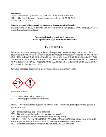 Producent: DuPont International Operations Sarl., P.O. Box 50, 2 Chemin du Pavillon, CH-1218 Le Grand Saconnex, Geneva, Switzerland tel.: +41 (0) 22 71 75 111; fax.: +41 (0) 22 71 76 088 Podmiot wprowadzający środek na terytorium Rzeczypospolitej Polskiej: DuPont Poland Sp. z o.o., ul. Postępu 17B, 02-676 Warszawa, Tel.: (22) 320 09 00, fax: (22) 320 09 50, e-mail: [email protected] Przestrzegaj etykiety – instrukcji stosowania w celu ograniczenia ryzyka dla ludzi i środowiska TREND® 90 EC Adiuwant - preparat wspomagający w formie płynu przeznaczony do łącznego stosowania z cieczą użytkową niektórych środków chwastobójczych stosowanych powschodowo: Accent® 75 WG, Aneks® SX® 50 SG, Calibre® SX® 50 SG, Chisel® Nowy 51,6 WG, Finish® SX® 40 SG, Granstar® 75 WG, Granstar® Ultra SX® 50 SG, Harmony® 75 WG, Hector® 53,6 WG, Hector® Max 66,5 WG, Olleas® 75 WG, Picaro® SX® 50 SG, Pragma®SX® 50 SG, Refine® 75 WG, Rubin® SX® 50 SG, Safari® 50 WG, Salsa® 75 WG, Titus® 25 WG. Zawartość substancji podstawowej: etoksylowany alkohol izodecylowy - 90% Niebezpieczeństwo H302 – Działa szkodliwie po połknięciu H318 – Powoduje poważne uszkodzenie oczu EUH401 - W celu uniknięcia zagrożeń dla zdrowia ludzi i środowiska, należy postępować zgodnie z instrukcją użycia. P264 – Dokładnie umyć ręce i twarz po użyciu P270 – Nie jeść, nie pić i nie palić podczas używania produktu P280 - Stosować rękawice ochronne/ochronę oczu/ochronę twarzy P305+P351+P338 – W PRZYPADU DOSTANIA SIĘ DO OCZU: Ostrożnie płukać wodą przez kilka minut. Wyjąć soczewki kontaktowe, jeżeli są i można je łatwo usunąć. Nadal płukać P310 – Natychmiast skontaktować się z OŚRODKIEM ZATRUĆ/lekarzem Należy przestrzegać etykiety (w tym wszystkich środków ostrożności) obowiązującej dla środka ochrony roślin, z którym stosuje się Trend® 90 EC. W przypadku awarii lub jeżeli źle się poczujesz, niezwłocznie zasięgnij porady lekarza – jeżeli to możliwe, pokaż etykietę. W razie połknięcia niezwłocznie zasięgnij porady lekarza i pokaż opakowanie lub etykietę. Uwaga! 1. Zabrania się stosowania środka w strefie bezpośredniej ochrony ujęć wody oraz na terenie uzdrowisk, otulin parków narodowych i rezerwatów 2. Nie zanieczyszczać wód preparatem i jego opakowaniem. DZIAŁANIE PREPARATU Trend® 90 EC powoduje: obniżenie napięcia powierzchniowego cieczy użytkowej środka chwastobójczego lepsze zwilżenie powierzchni opryskiwanych liści chwastów i ułatwienie wnikania środka do rośliny zmniejszenie zmywalności środka przez opady deszczu i silną rosę zwiększenie skuteczności i przyspieszenie działania środka chwastobójczego UWAGA Dodatek adiuwanta jest szczególnie zalecany, gdy w odchwaszczanych uprawach występują chwasty średnio wrażliwe na stosowany środek chwastobójczy lub na chwasty w starszej fazie rozwojowej, a także wówczas, gdy w kilka godzin po zabiegu opryskane rośliny mogą być narażone na silne opady deszczu. ZAKRES STOSOWANIA, TERMINY I DAWKI Zalecane stężenie: 0,05-0,1 % (50-100 ml/100 l wody). Trend® 90 EC stosować w terminach, dawkach i w sposób zalecany dla poszczególnych środków chwastobójczych: burak cukrowy - ze środkiem Safari® 50 WG oraz jego mieszankach z innymi środkami chwastobójczymi kukurydza - ze środkami Accent® 75 WG, Harmony® 75 WG, Hector® 53,6 WG, Hector® Max 66,5 WG, Refine® 75 WG, Titus® 25 WG oraz ich mieszankach z innymi środkami chwastobójczymi. rzepak ozimy – ze środkami Salsa® 75 WG i Olleas® 75 WG. ziemniak - ze środkiem Titus® 25 WG oraz jego mieszankach z innymi środkami chwastobójczymi zboża ozime i jare - ze środkami Aneks® SX® 50 SG, Calibre® SX® 50 SG, Chisel® Nowy 51,6 WG, Finish® SX® 40 SG, Granstar® 75 WG, Granstar® Ultra SX® 50 SG, Picaro® SX® 50 SG, Pragma® SX® 50 SG, Rubin® SX® 50 SG SPORZĄDZANIE CIECZY UŻYTKOWEJ Przed użyciem wstrząsnąć zawartością opakowania. Ciecz użytkową środka chwastobójczego przygotować zgodnie z etykietą-instrukcją stosowania w połowie potrzebnej ilości wody i dokładnie wymieszać. Następnie dodać odmierzoną ilość adiuwanta z włączonym mieszadłem uzupełnić wodą do potrzebnej ilości ciągle dokładnie mieszając. Opróżnione opakowania przepłukać trzykrotnie wodą a popłuczyny wlać do zbiornika opryskiwacza z cieczą użytkową. Po pracy aparaturę dokładnie wymyć. PRZECHOWYWANIE Chronić przed dziećmi. Nie przechowywać razem z żywnością, napojami i paszami dla zwierząt. Przechowywać w miejscach lub obiektach, w których zastosowano odpowiednie rozwiązania zabezpieczające przed skażeniem środowiska i dostepem osób trzecich. Przechowywać wyłącznie w oryginalnym opakowaniu, w pojemniku szczelnie zamkniętym, w odpowiednio wentylowanym miejscu w temperaturze nie przekraczającej 0-30°C. ŚRODKI OSTROŻNOŚCI ZWIĄZANE Z OCHRONĄ ŚRODOWISKA NATURALNEGO Nie zanieczyszczać wód preparatem lub jego opakowaniem. Nie myć aparatury w pobliżu wód powierzchniowych. Unikać zanieczyszczania wód poprzez rowy odwadniające z gospodarstw i dróg. Opróżnione opakowania po preparacie zwrócić do sprzedawcy. Zabrania się spalania opakowań po preparacie we własnym zakresie. UWAGA ZABRANIA SIĘ WYKORZYSTYWANIA OPRÓŻNIONYCH OPAKOWAŃ PO PREPARACIE DO INNYCH CELÓW, W TYM TAKŻE TRAKTOWANIA ICH JAKO SUROWCE WTÓRNE. ANTIDOTUM: BRAK, STOSOWAĆ LECZENIE OBJAWOWE. Pomoc medyczna W zaistniałych sytuacjach, kiedy wymagana jest lub konieczna inna pomoc medyczna niż ujęta w wyżej wymienionych ostrzeżeniach skontaktować się z najbliższym ośrodkiem toksykologicznym: Gdańsk Kraków Lublin Łódź Poznań - (58) 682-04-04 - (12) 411-99-99 - (81) 740-89-83 - (42) 657-99-00 - (61) 847-69-46 Okres ważności - 3 lata Data produkcji - ........ Zawartość netto - ........ Nr partii - ........ Rzeszów Sosnowiec Tarnów Warszawa Wrocław - (