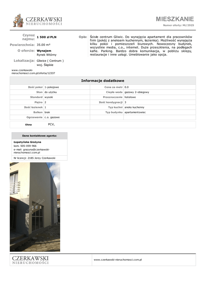 MIESZKANIE Numer oferty: Mi/2925 Czynsz 1 500 zł PLN najmu: Powierzchnia: 35.00 m² O ofercie: Wynajem Rynek Wtórny Opis: Ścisłe centrum Gliwic. Do wynajęcia apartament dla pracowników firm (pokój z aneksem kuchennym, łazienka). Możliwość wynajęcia kilku pokoi i pomieszczeń biurowych. Nowoczesny budynek, wszystkie media, c.o., internet. Duże przeszklenia, na podłogach kafle. Parking. Bardzo dobra komunikacja, w pobliżu sklepy, restauracje i inne usługi. Umeblowanie jako opcja. Lokalizacja: Gliwice ( Centrum ) woj. Śląskie www.czerkawskinieruchomosci.com.pl/oferta/12337 Informacje dodatkowe Ilość pokoi 1-pokojowe Stan do użytku Standard wysoki Piętro 2 Cena za metr 0.0 Ciepła woda gazowy 2-obiegowy Przeznaczenie hotelowe Ilość kondygnacji 3 Ilość łazienek 1 Typ kuchni aneks kuchenny Balkon brak Typ budynku apartamentowiec Ogrzewanie c.o. gazowe Okna PCV, Dane kontaktowe agenta: Łopatyńska Grażyna kom. 505-059-966 e-mail: [email protected] Nr licencji: 2185 Jerzy Czerkawski www.czerkawski-nieruchomosci.com.pl