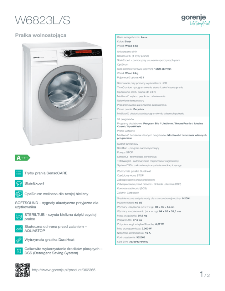 W6823L/S Pralka wolnostojąca Klasa energetyczna: A+++ Kolor: Biały Wsad: Wsad 6 kg Uniwersalny silnik SensoCARE (4 tryby prania) StainExpert - pomoc przy usuwaniu uporczywych plam OptiDrum Ilość obrotów wirówki (obr/min): 1.200 obr/min Wsad: Wsad 6 kg Pojemność bębna: 42 l Sterowanie przy pomocy wyświetlacza LCD TimeComfort - programowanie startu i zakończenia prania Opóźnienie startu prania (do 24 h) Możliwość wyboru prędkości odwirowania Ustawienie temperatury Praogramowanie zakończenia czasu prania Zimne pranie: Przycisk Możliwość dostosowania programów do własnych potrzeb 31 programów Programy dodatkowe: Program Bio / Ulubione / NocnePranie / Idealna Czerń / SportWash Pranie wstępne Możliwość tworzenia własnych programów: Możliwość tworzenia własnych programów Sygnał dźwiękowy SterilTub - program samoczyszczący Pompa STOP SensorIQ - technologia sensorowa TotalWeight - automatyczne rozpoznanie wagi bielizny System DSS - całkowite wykorzystanie środka piorącego Tryby prania SensoCARE Wytrzymała grzałka DuraHeat Częściowy Aqua STOP Zabezpieczenie przez przelaniem StainExpert Zabezpieczenie przed dziećmi - blokada ustawień (CDP) Kontrola stabilności (SCS) OptiDrum: wellness dla twojej bielizny Zbiornik Carbotech Średnie roczne zużycie wody dla czterosobowej rodziny: 9.209 l SOFTSOUND – sygnały akustyczne przyjazne dla użytkownika Poziom hałasu: 68 dB Wymiary urządzenia (sz x w x g): 60 × 85 × 44 cm Wymiary w opakowaniu (sz x w x g): 64 × 92 × 51,5 cm STERILTUB - czysta bielizna dzięki czystej pralce Skuteczna ochrona przed zalaniem – AQUASTOP Wytrzymała grzałka DuraHeat Masa urządzenia: 65,5 kg Waga brutto: 67,5 kg Zużycie energii w trybie Standby: 0,07 W Moc przyłączeniowa: 2.000 W Natężenie znamionowe: 10 A Kod urządzenia: 362365 Kod EAN: 3838942766183 Całkowite wykorzystanie środków piorących – DSS (Detergent Saving System) http://www.gorenje.pl/product/362365 1/ 2 STABILITY CONTROL – kontrola stabilności 2/ 2