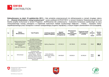 Lp. 1. 2. Nr wniosku Zaktualizowana na dzień 16 października 2013 r. lista wniosków przeznaczonych do dofinansowania w ramach drugiego naboru pn.: „Rozwój infrastruktury i usług turystycznych” numer publikacji 2/LPK/IUT/2013 w ramach Działania: Redystrybucja grantów na lokalne projekty konkursowe w ramach Programu:: „EUROszansa dla Lubelszczyzny – budowanie konsensusu społecznego na rzecz zrównoważonego rozwoju subregionu w krajobrazie kulturowym trójkąta turystycznego Nałęczów – Puławy – Kazimierz Dolny” współfinasowanego przez Szwajcarie w ramach szwajcarskiego programu współpracy z nowymi krajami członkowskimi Unii Europejskiej. 14. 19. Lokalizacja działań objętych Projektem Wydatki kwalifikowane w Projekcie /zł/ Wnioskowana kwota dofinansowania z S-PPW Przyznana kwota dofinansowania z S-PPW % dofinans o -wania Średnia liczba punktów „W siodle też można – turystyka aktywna dla każdego. Zwiększenie atrakcyjności oferty turystycznej promującej turystykę konną na obszarze subregionu trójkąta turystycznego NałęczówPuławy-Kazimierz Dolny” Kębło (g. Wąwolnica) 167 445,53 150 700,98 150 700,98 90,00 95,5 „Turystyczny Szlak Ornitologiczny” obejmujący Dolinę Wieprza – (Gminy: Baranów, Puławy i Żyrzyn), Dolinę Wisły (Gmina Puławy) oraz jezioro Duży Ług (Gmina Markuszów) Gminy: Baranów, Markuszów, Puławy, Żyrzyn 184 050,00 165100,34 165 060,34 90,00 85,00 90 Nazwa Wnioskodawcy Tytuł Projektu Stowarzyszenie Pomocy i Wspierania Rozwoju Niepełnosprawnych – „SZANSA” Kębło, gm. Wąwolnica Gmina Żyrzyn 3. 4. 5. 6. 20. 6. 5. 21. Parafia RzymskoKatolicka p.w. Św. Teodora w Wojciechowie Utworzenie tematycznego Szlaku Zabytkowych Kościołów na obszarze WojciechówNałęczów-Wąwolnica-KurówMarkuszów Gminy: Wojciechów, Nałęczów, Wąwolnica, Kurów, Markuszów 55 464,58 47 144,88 47 144,88 85,00 83,5 Fundacja „Turystyczna Lubelszczyzna” Rudy, Gm. Końskowola Utworzenie Centrum Edukacji Przyrodniczej i Kulturowej w Kośminie Kośmin, gm. Żyrzyn 99 560,00 89 604,00 89 604,00 90,00 83 FAKTOR Stanisław Lenart Cholewianka Gm. Kazimierz Dolny Rozbudowa istniejącego budynku mieszkalnego o werandę, taras i powiększenie kuchni. Modernizacja i doposażenie 4 pokoi z przeznaczeniem na wynajem. Wyposażenie werandy i tarasu w meble rekreacyjne oraz promienniki ciepła. Wykonanie parkingu. Przygotowanie ścieżki edukacyjno-przyrodniczej. Doposażenie kuchni w urządzenia kuchenne. Rozbudowa strony internetowej. Cholewianka (g. Kazimierz Dolny) 278 999,27 167399,56 167 399,56 60,00 81,5 Zwiększenie atrakcyjności turystycznej Wojciechowa poprzez doposażenie otoczenia Wieży Ariańskiej Wojciechów 132 131,16 112 311,44 112 311,44 85,00 81,50 Gminny Ośrodek Kultury W Wojciechowie 7. 28. Monika Wiak Wilczanka, gm. Żyrzyn 8. 29. Olga Michalik Wólka Kątna, gm. Markuszów 23. Lokalna Organizacja Turystyczna „Kraina Lessowych Wąwozów” Nałęczów Zakup wyposażenia restauracji „Grota Bochotnicka” i jej zaplecza kuchennego Bochotnica (g. Kazimierz Dolny) 236 360,66 141 816,40 141 816,40 60,00 81 Wólka Kątna (g. Markuszów) 616 304,54 167 500,00 167 500,00 27,18 80,5 Utworzenie szlaków konnych w obrębie trójkąta turystycznego Kazimierz Dolny-NałęczówPuławy Gminy: Baranów, Janowiec, Kazimierz Dolny, g. Puławy, Końskowola, Kurów, Markuszów, Wąwolnica, Żyrzyn 169 570,00 152 613,00 152 613,00 90,00 80 11. Przedsiębiorstwo Produkcyjno-Handlowe „Reypol” - Rejmak Spółka Jawna Janowiec Zakup wyposażenia kawiarniocukierni w zabytkowym pensjonacie „SEROKOMLA” oraz zagospodarowanie przyległego do budynku ogrodu Janowiec 252 271,11 151 362,66 151 362,66 60,00 79 11. 26. „Folwark Walencja” B.J.E. Kowalscy Sp.J. Kazimierz Dolny Zwiększenie atrakcyjności i konkurencyjności pensjonatu Folwark Walencja w Kazimierzu Dolnym poprzez wzbogacenie oferty Kazimierz Dolny 64 700,00 38 820,00 38 820,00 60,00 76,5 12. 22. Patryk Niezabitowski Siedlisko Lubicz Kazimierz Dolny Turystyka plenerowa szansą rozwoju Siedliska Lubicz Patryk Niezabitowski Kazimierz Dolny 97 488,02 58 492,81 58 492,81 60,00 72 9. 10. Hotelik na 16 miejsc noclegowych na szlakach rowerowym i konnym przy ośrodku jeździeckim 13. 14. 8. Piotr Białek Ostoja pod Czarną Piłą Czołna, gm. Baranów Podniesienie atrakcyjności oferty pobytowej w gospodarstwie agroturystycznym Ostoja pod Czarną Piłą Czołna (g. Baranów) 17 550,00 10 530,00 10 530,00 60,00 71 9. Andrzej Frycz Góra Puławska Gm. Puławy Mobilna baza kajakowa na szlakach wodnych Wisły i Wieprza Baranów, Góra Puławska (g. Puławy), Janowiec, Kazimierz Dolny, Kośmin (g. Żyrzyn) 104 585,35 62 751,21 62 751,21 60,00 69 2476 480,22 1 516 147,28 1 516 107,28 Łącznie