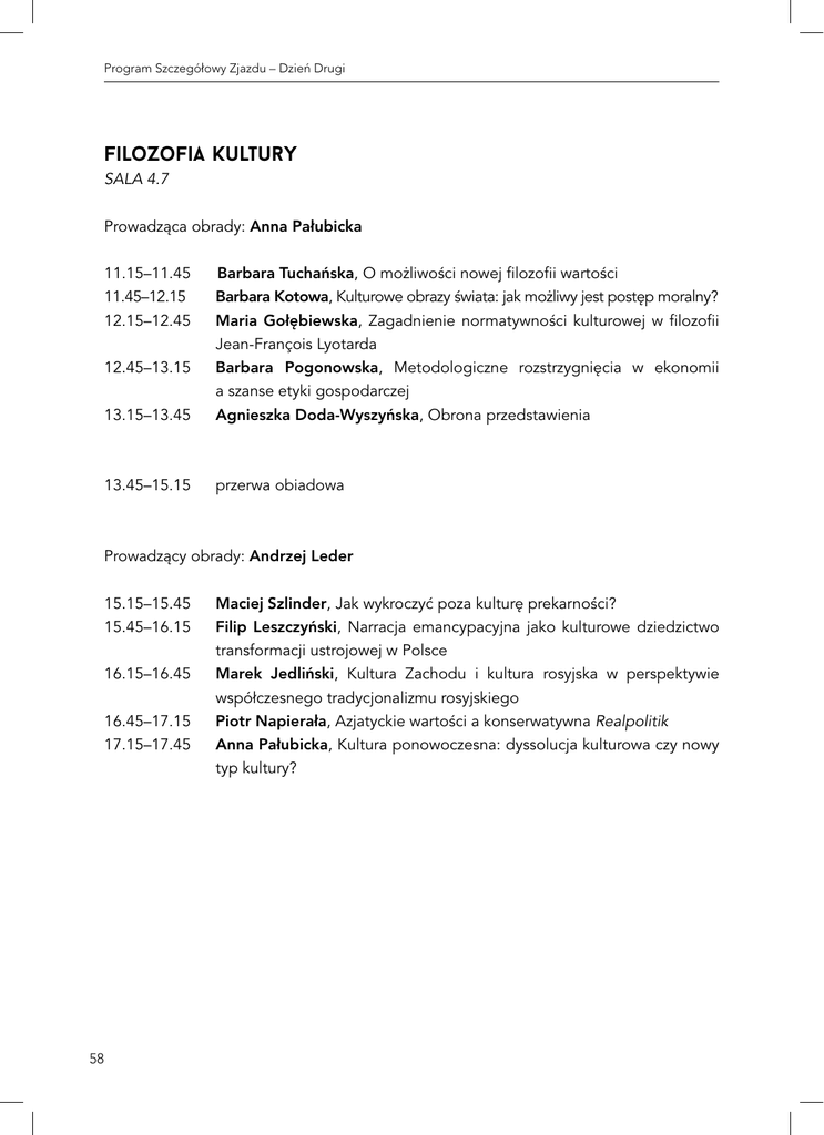 Program Szczegółowy Zjazdu – Dzień Drugi Filozofia kultury SALA 4.7 Prowadząca obrady: Anna Pałubicka 11.15–11.45 11.45–12.15 12.15–12.45 13.15–13.45 Barbara Tuchańska, O możliwości nowej filozofii wartości Barbara Kotowa, Kulturowe obrazy świata: jak możliwy jest postęp moralny? Maria Gołębiewska, Zagadnienie normatywności kulturowej w filozofii Jean-François Lyotarda Barbara Pogonowska, Metodologiczne rozstrzygnięcia w ekonomii a szanse etyki gospodarczej Agnieszka Doda-Wyszyńska, Obrona przedstawienia 13.45–15.15 przerwa obiadowa 12.45–13.15 Prowadzący obrady: Andrzej Leder 15.15–15.45 15.45–16.15 16.15–16.45 16.45–17.15 17.15–17.45 58 Maciej Szlinder, Jak wykroczyć poza kulturę prekarności? Filip Leszczyński, Narracja emancypacyjna jako kulturowe dziedzictwo transformacji ustrojowej w Polsce Marek Jedliński, Kultura Zachodu i kultura rosyjska w perspektywie współczesnego tradycjonalizmu rosyjskiego Piotr Napierała, Azjatyckie wartości a konserwatywna Realpolitik Anna Pałubicka, Kultura ponowoczesna: dyssolucja kulturowa czy nowy typ kultury?