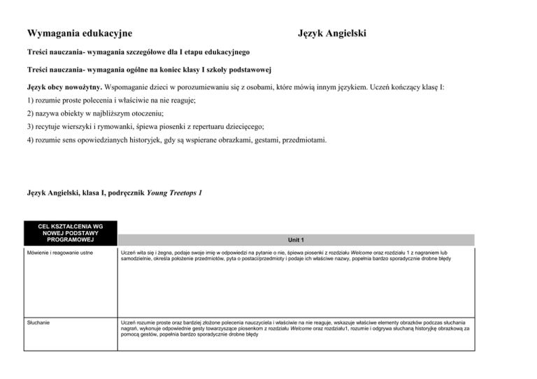 Wymagania edukacyjne Język Angielski Treści nauczania- wymagania szczegółowe dla I etapu edukacyjnego Treści nauczania- wymagania ogólne na koniec klasy I szkoły podstawowej Język obcy nowożytny. Wspomaganie dzieci w porozumiewaniu się z osobami, które mówią innym językiem. Uczeń kończący klasę I: 1) rozumie proste polecenia i właściwie na nie reaguje; 2) nazywa obiekty w najbliższym otoczeniu; 3) recytuje wierszyki i rymowanki, śpiewa piosenki z repertuaru dziecięcego; 4) rozumie sens opowiedzianych historyjek, gdy są wspierane obrazkami, gestami, przedmiotami. Język Angielski, klasa I, podręcznik Young Treetops 1 CEL KSZTAŁCENIA WG NOWEJ PODSTAWY PROGRAMOWEJ Unit 1 Mówienie i reagowanie ustne Uczeń wita się i żegna, podaje swoje imię w odpowiedzi na pytanie o nie, śpiewa piosenki z rozdziału Welcome oraz rozdziału 1 z nagraniem lub samodzielnie, określa położenie przedmiotów, pyta o postaci/przedmioty i podaje ich właściwe nazwy, popełnia bardzo sporadycznie drobne błędy Słuchanie Uczeń rozumie proste oraz bardziej złożone polecenia nauczyciela i właściwie na nie reaguje, wskazuje właściwe elementy obrazków podczas słuchania nagrań, wykonuje odpowiednie gesty towarzyszące piosenkom z rozdziału Welcome oraz rozdziału1, rozumie i odgrywa słuchaną historyjkę obrazkową za pomocą gestów, popełnia bardzo sporadycznie drobne błędy Słownictwo i struktury Uczeń poprawnie wskazuje i nazywa przedmioty znajdujące się w sali lekcyjnej i elementy przyrody związane z jesienią, posługuje się strukturami językowymi z rozdziału Welcome oraz 1, w tym pytaniami Who’s this? i What is this? oraz przyimkami on/in, popełnia bardzo sporadycznie drobne błędy Czytanie i pisanie Uczeń bez większych problemów rozpoznaje formy pisane poznanych w rozdziale wyrazów ilustrowanych obrazkami i pisze po śladzie nazwy przedmiotów znajdujących się w sali lekcyjnej, nie popełniając błędów, zachowując odpowiednią staranność. CEL KSZTAŁCENIA WG NOWEJ PODSTAWY PROGRAMOWEJ Unit 2 Mówienie i reagowanie Uczeń śpiewa piosenki z rozdziału 2 z nagraniem lub samodzielnie, recytuje z pamięci rymowankę liczbową, pyta o liczbę różnych przedmiotów i udziela prawidłowych odpowiedzi na takie pytania, określa kolor różnych przedmiotów w odpowiedzi na podane pytanie, popełnia bardzo sporadycznie drobne błędy. Słuchanie Uczeń rozumie proste oraz bardziej złożone polecenia nauczyciela i właściwie na nie reaguje, wskazuje właściwe elementy obrazków, poprawnie dobiera kolory do liczb podczas słuchania nagrań, rozpoznaje usłyszane w nagraniu liczby, wykonuje odpowiednie gesty towarzyszące piosenkom z rozdziału 2, rozumie i odgrywa słuchaną historyjkę obrazkową za pomocą gestów, nie popełnia błędów oraz wykonuje usłyszane w nagraniu polecenia. Słownictwo i struktury Uczeń poprawnie wskazuje i nazywa poznane kolory, rozpoznaje i nazywa liczebniki w zakresie 1-5, posługuje się strukturami językowymi z rozdziału 2, w tym, m.in. pytaniem o liczbę How many…? oraz pytaniem o kolor What colour is it?, bardzo sporadycznie popełnia drobne błędy. Czytanie i pisanie Uczeń bez większych problemów rozpoznaje formy pisane poznanych w rozdziale wyrazów i pisze po śladzie liczby oraz nazwy kolorów, nie popełniając błędów, zachowując odpowiednią staranność. CEL KSZTAŁCENIA WG NOWEJ PODSTAWY PROGRAMOWEJ Unit 3 Mówienie i reagowanie Uczeń śpiewa piosenki z tematów The balloon festival i Winter oraz rozdziału 3 z nagraniem lub samodzielnie, pyta o miejsce, w którym znajdują się różne osoby i określa ich położenie, nazywa relacje pokrewieństwa, popełnia bardzo sporadycznie drobne błędy. Słuchanie Uczeń rozumie proste oraz bardziej złożone polecenia nauczyciela i właściwie na nie reaguje, wskazuje właściwe elementy obrazków podczas słuchania nagrań, wykonuje odpowiednie gesty towarzyszące piosenkom z tematów The balloon festival i Winter oraz rozdziału 3, rozumie i odgrywa słuchaną historyjkę obrazkową za pomocą gestów, nie popełniając błędów. Słownictwo i struktury Uczeń poprawnie rozpoznaje, wskazuje i nazywa elementy przyrody i przedmioty związane z zimą, rozpoznaje i nazywa pomieszczenia w domu, członków rodziny, posługuje się strukturami językowymi z tematów The balloon festival i Winter oraz rozdziału 3, w tym, m.in. pytaniem szczegółowym o miejsce Where’s...?, przyimkami miejsca, nie popełniając większych błędów. Czytanie i pisanie Uczeń bez większych problemów rozpoznaje formy pisane poznanych w rozdziale wyrazów, czyta ze zrozumieniem proste zdania, pisze po śladzie wyrazy związane z zimą oraz nazwy pomieszczeń w domu, poprawnie przepisuje nazwy członków rodziny o raz pomieszczeń w domu , nie popełniając błędów, zachowując odpowiednią staranność. CEL KSZTAŁCENIA WG NOWEJ PODSTAWY PROGRAMOWEJ Unit 4 Mówienie i reagowanie Uczeń śpiewa piosenki z rozdziału 4 z nagraniem lub samodzielnie, wydaje polecenia poznane w rozdziale 4, właściwie reaguje na polecenia wydawane przez innych, pyta o liczbę różnych przedmiotów i udziela prawidłowych odpowiedzi na takie pytania, określa kolor różnych przedmiotów w odpowiedzi na podane pytanie, pyta o pogodę i udziela na takie pytanie odpowiedzi, popełnia bardzo sporadycznie drobne błędy. Słuchanie Uczeń rozumie proste oraz bardziej złożone polecenia nauczyciela oraz polecenia wypowiedziane przez kolegów i koleżanki, właściwie na nie reaguje, wskazuje właściwe elementy obrazków podczas słuchania nagrań, wykonuje odpowiednie gesty towarzyszące piosenkom z rozdziału 4, wykonuje proste zadania sprawdzające rozumienie usłyszanych w nagraniach tekstów, typu numerowanie i kolorowanie obrazków, rozumie i odgrywa słuchaną historyjkę obrazkową za pomocą gestów, nie popełniając błędów. Słownictwo i struktury Uczeń poprawnie wskazuje i na
